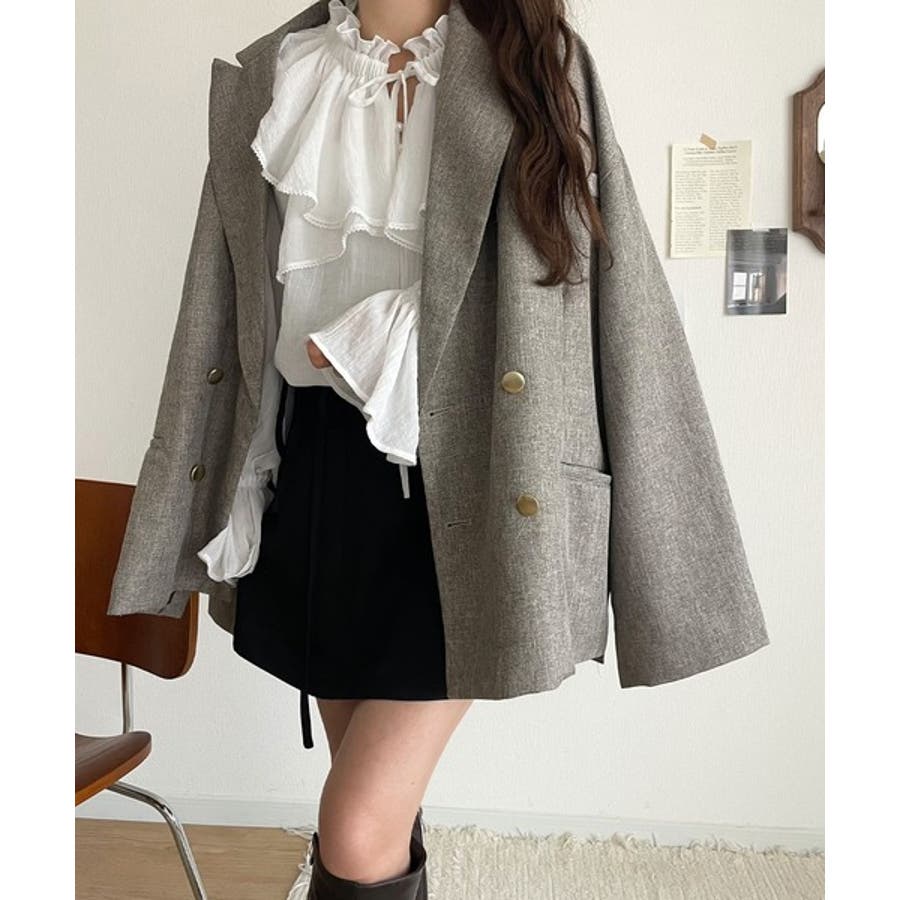 胸元と肩にかけて広がるフリルが顔まわりを華やかに見せ、華奢見え効果もあります。