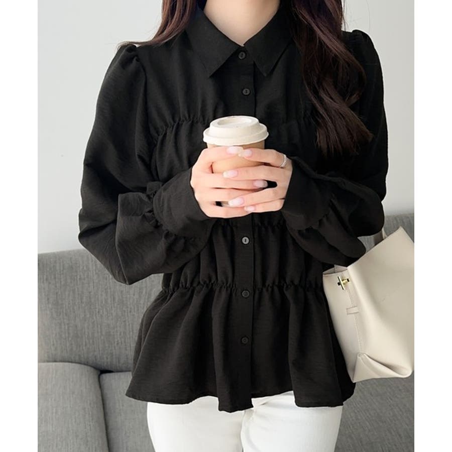 ペプラム裾とふんわりパフショルダー&パフスリーブで、大人可愛い印象に。