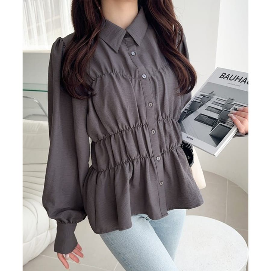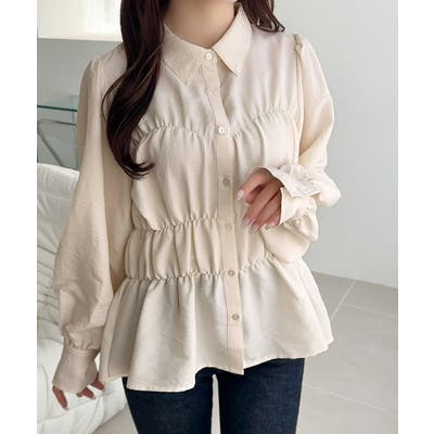 ビスチェを重ね着しているように見えるシャーリングデザインがポイントのブラウス。