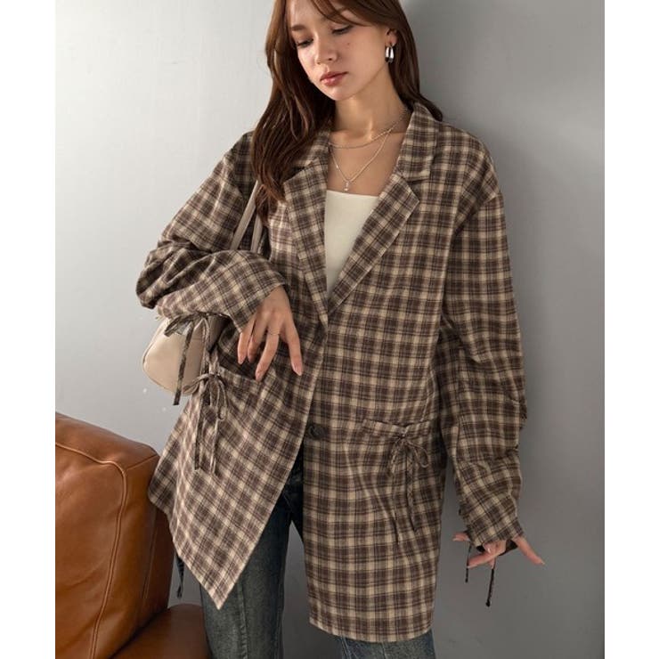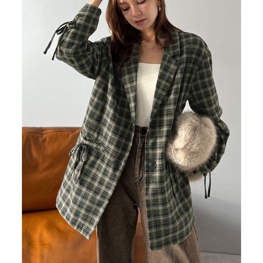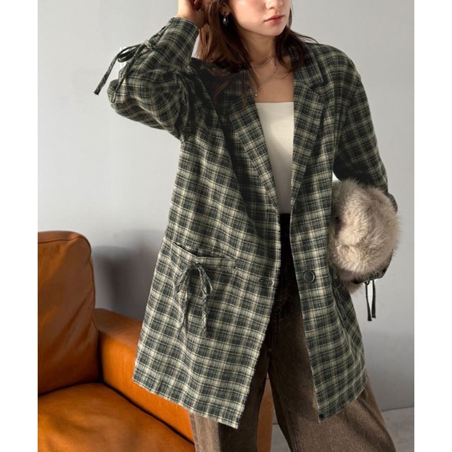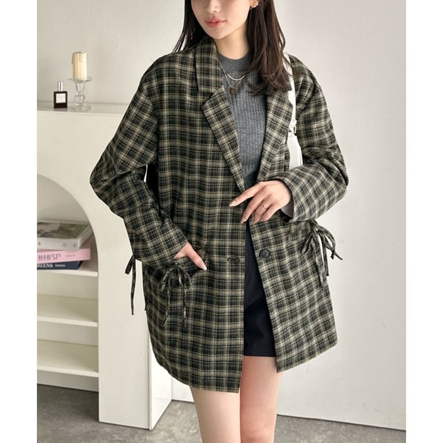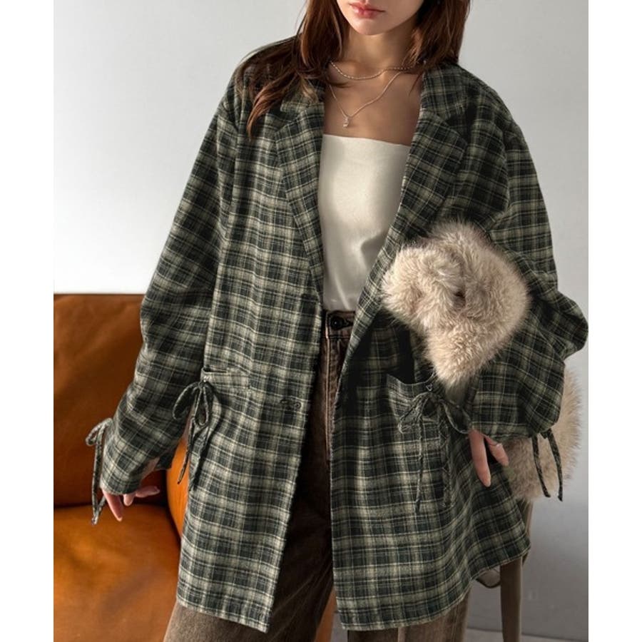 今季大本命!お洒落映えリボン付き微起毛チェック柄テーラードジャケット