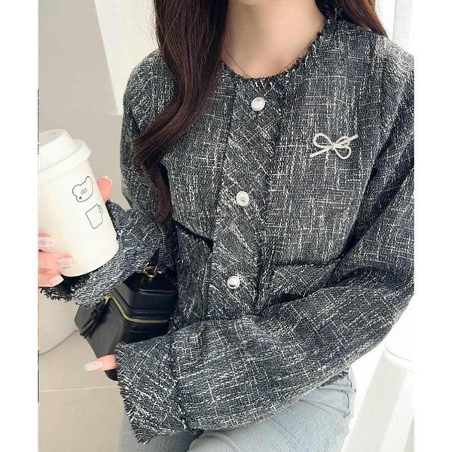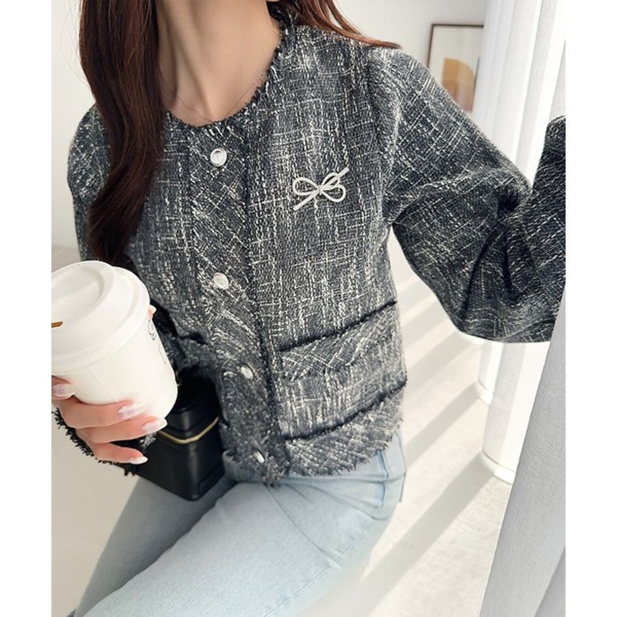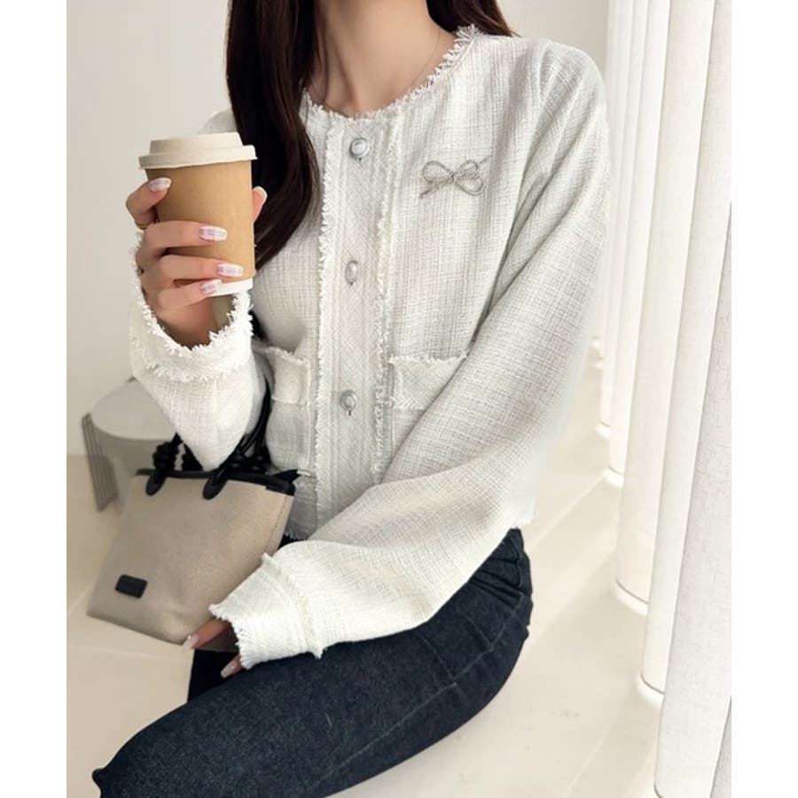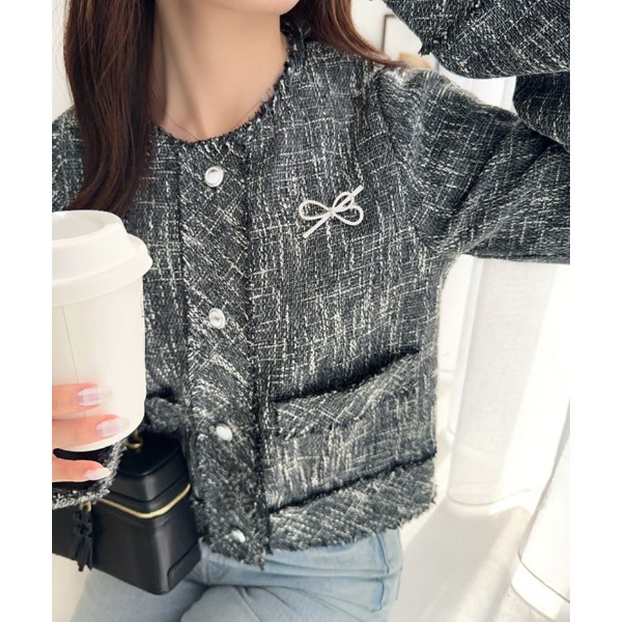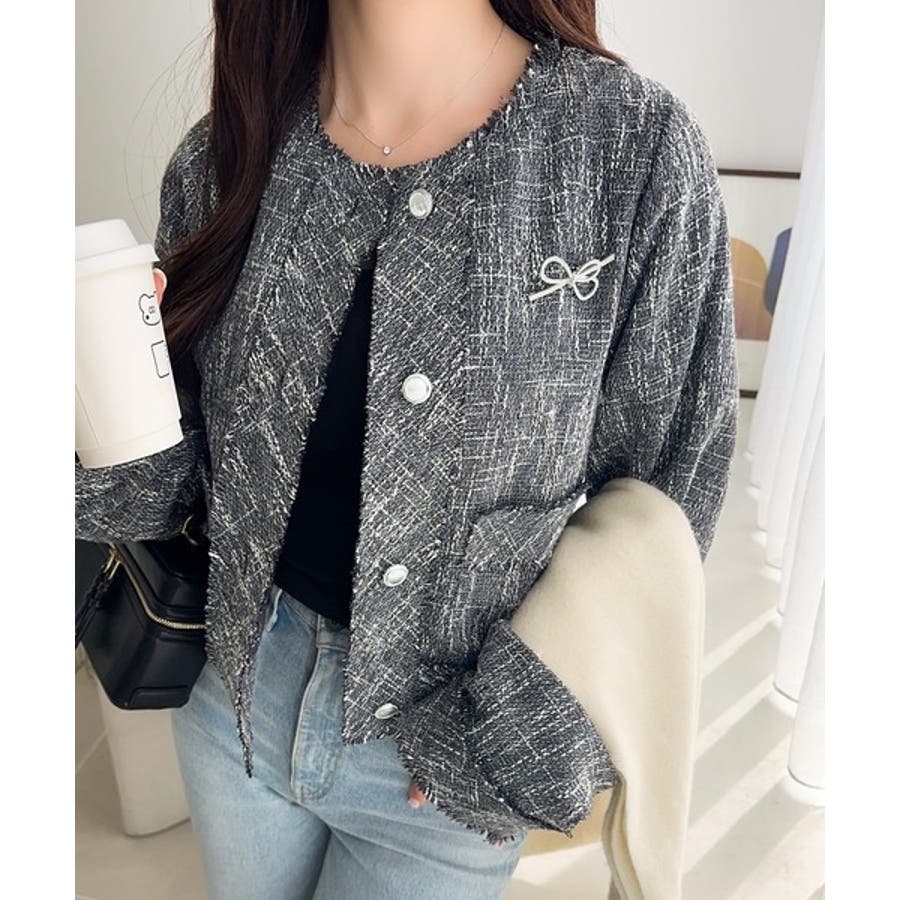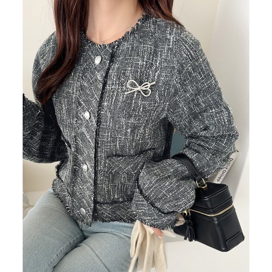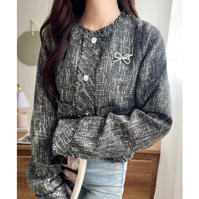 きらめく魔法に甘さを添えて♪リボンブローチ使い長袖ラメ入りツイードジャケット