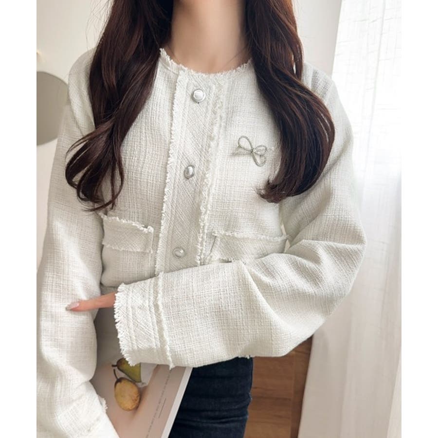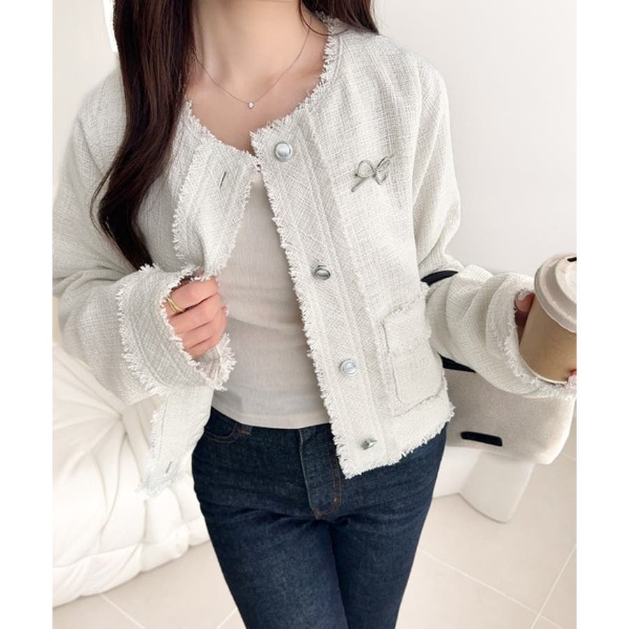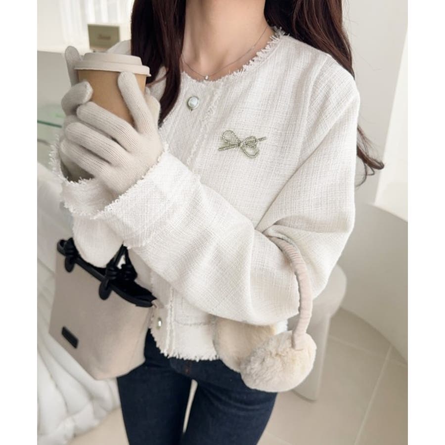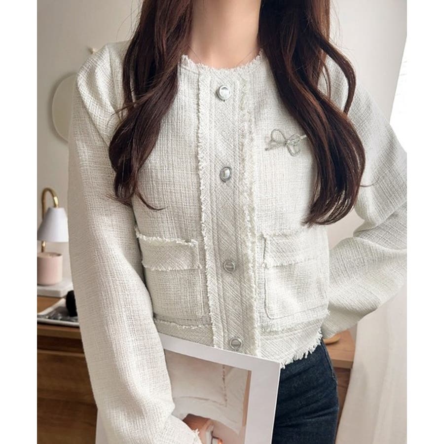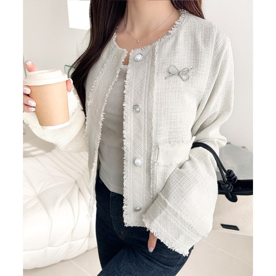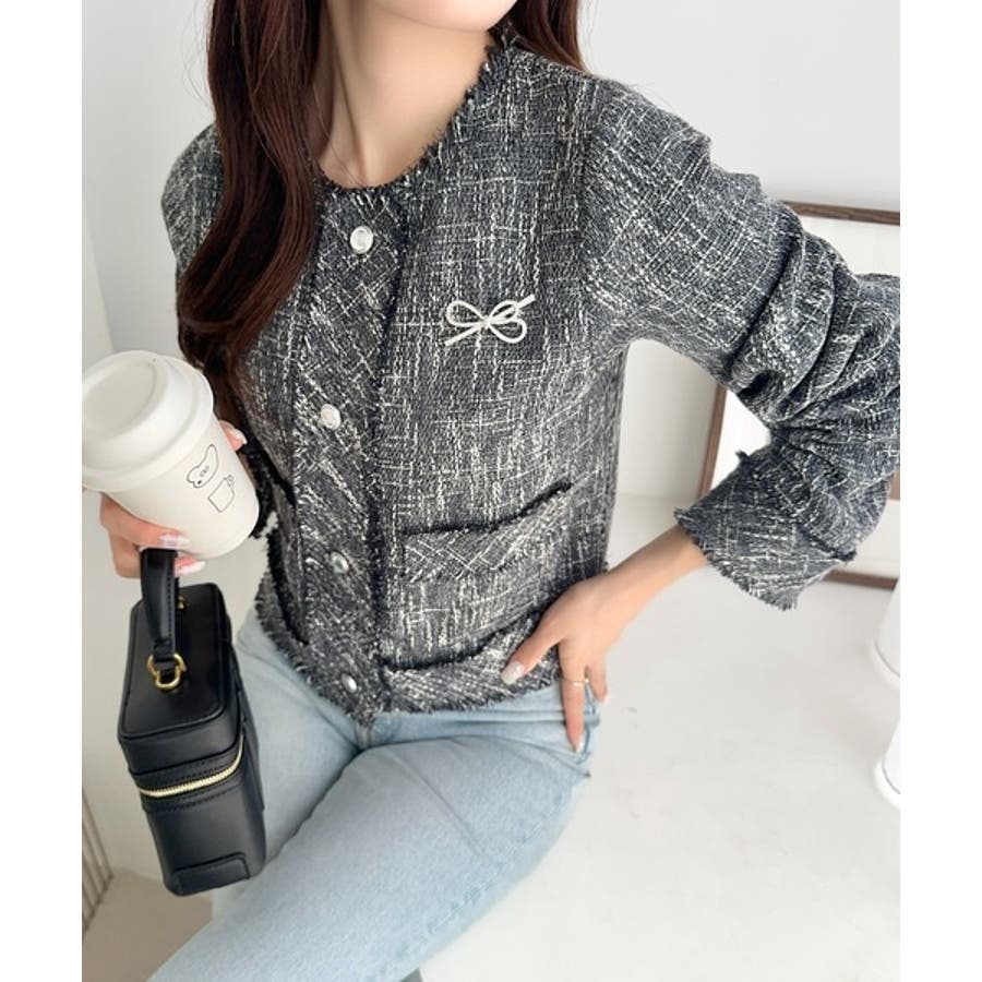 きらめく魔法に甘さを添えて♪リボンブローチ使い長袖ラメ入りツイードジャケット