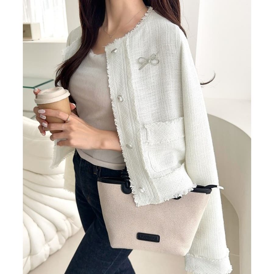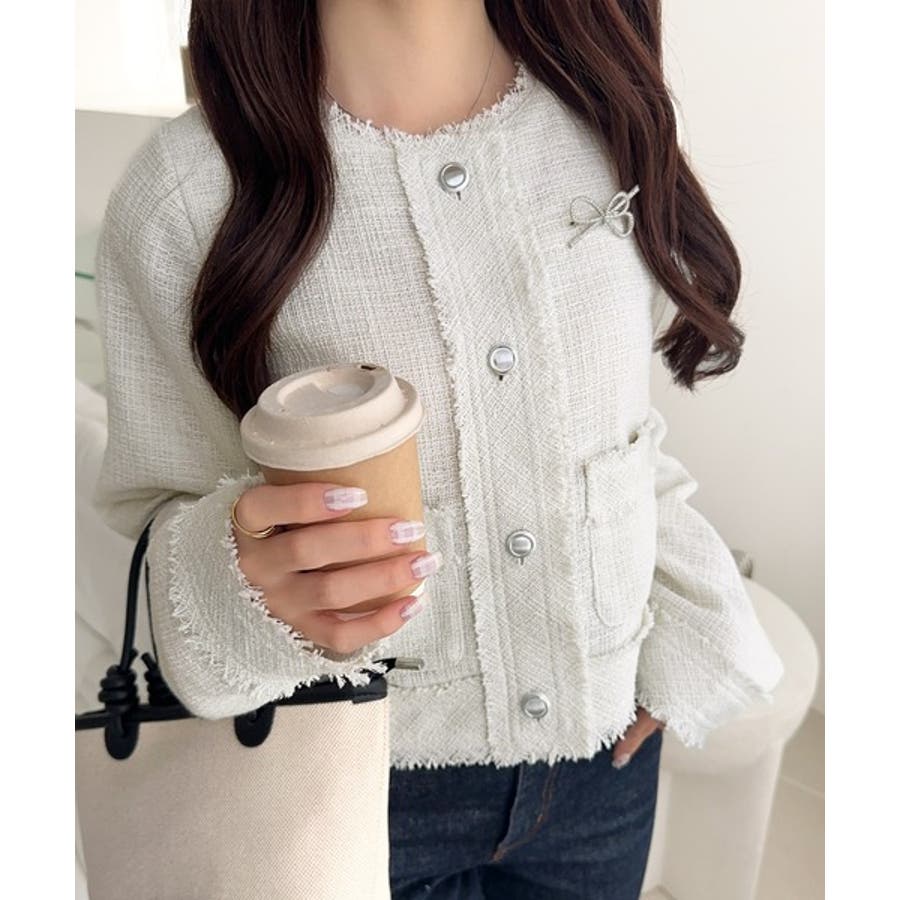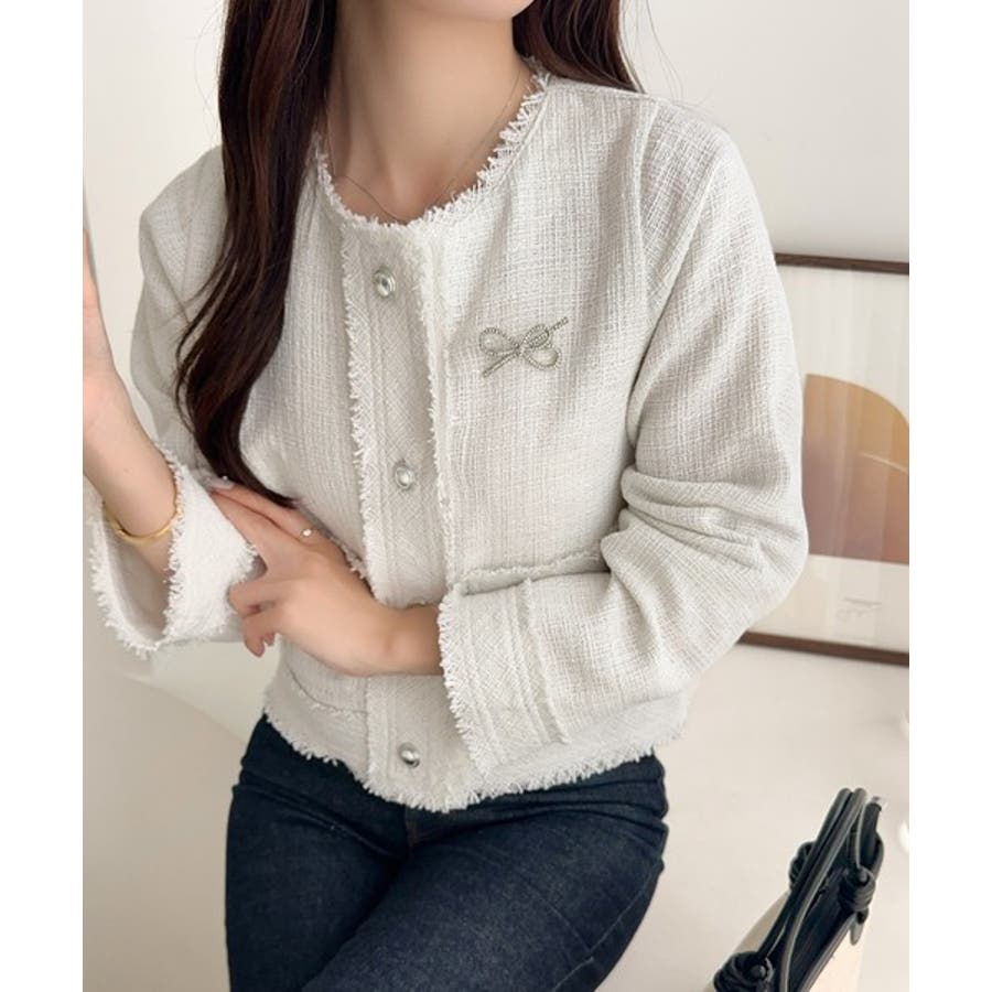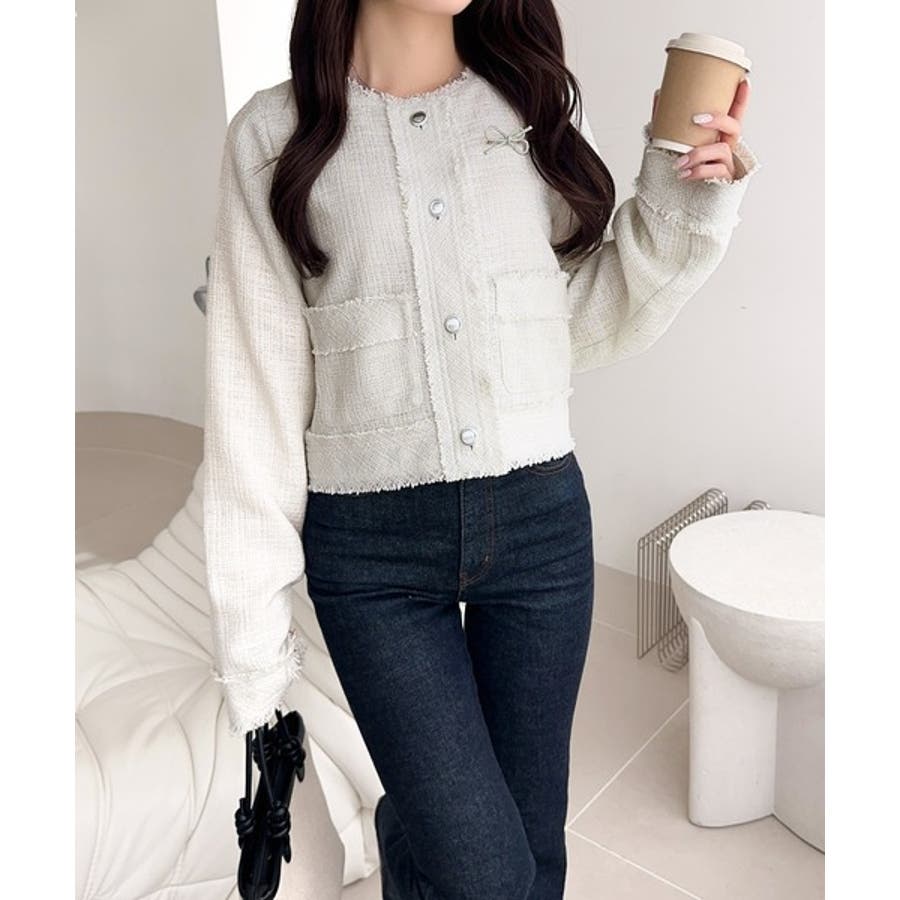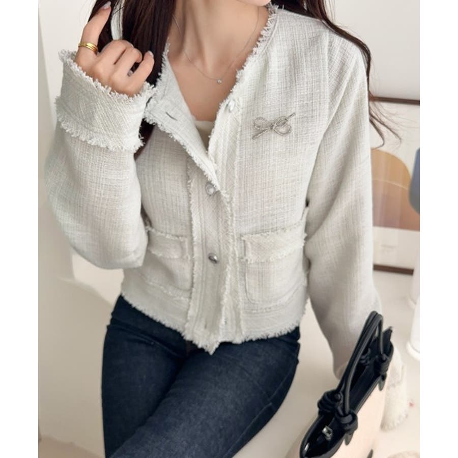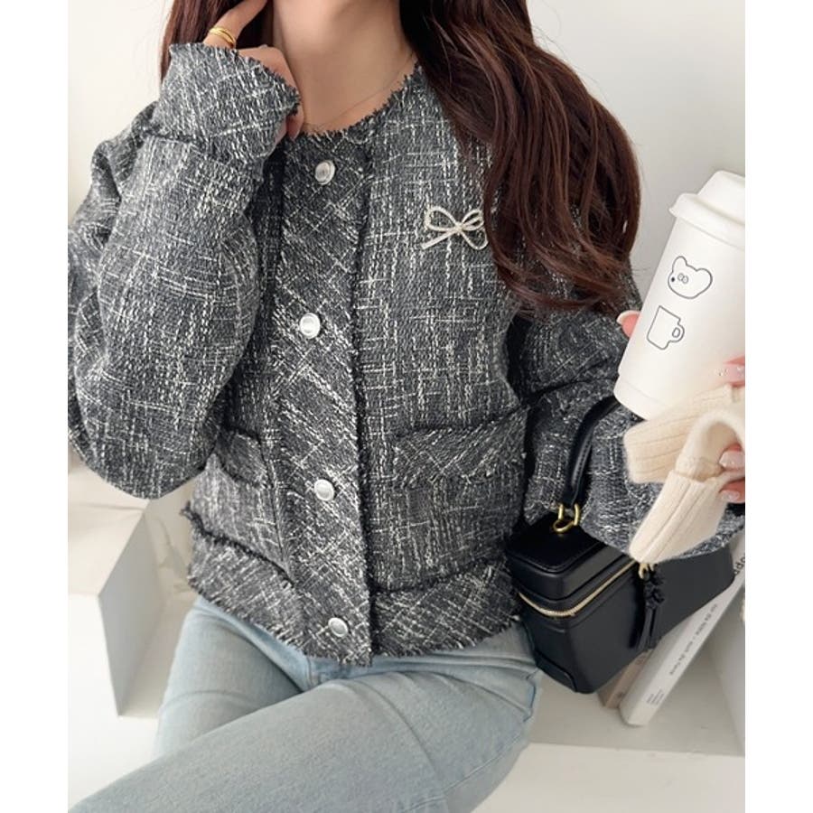 きらめく魔法に甘さを添えて♪リボンブローチ使い長袖ラメ入りツイードジャケット