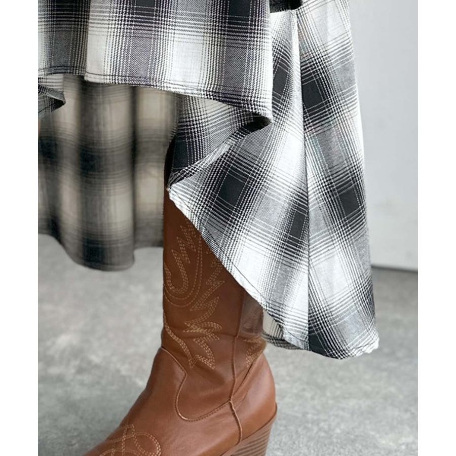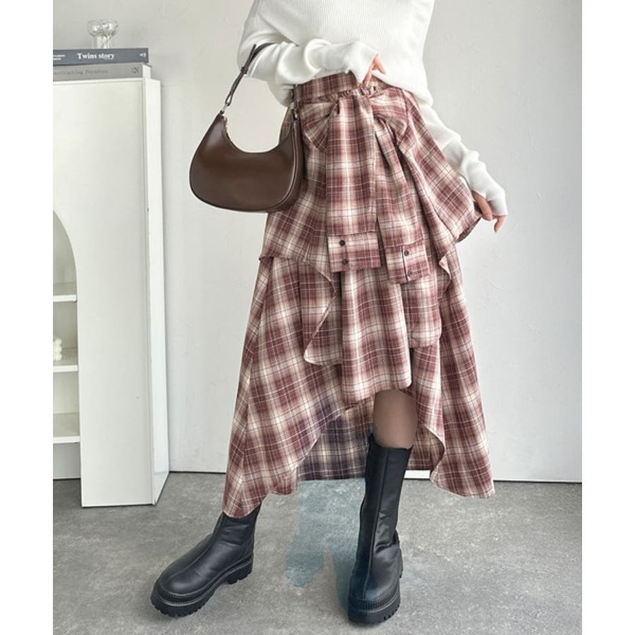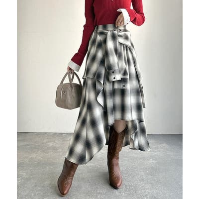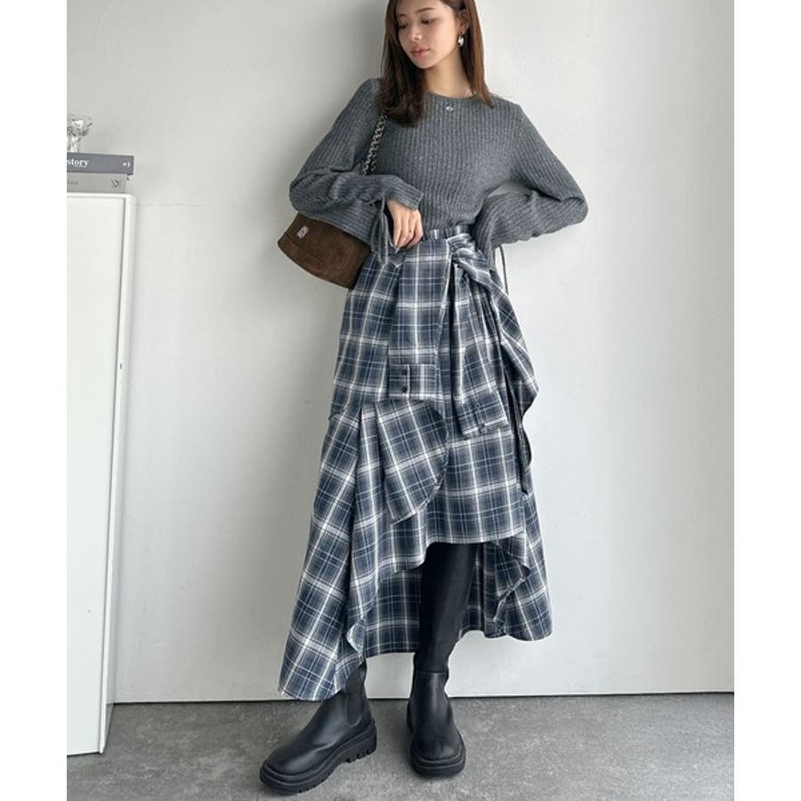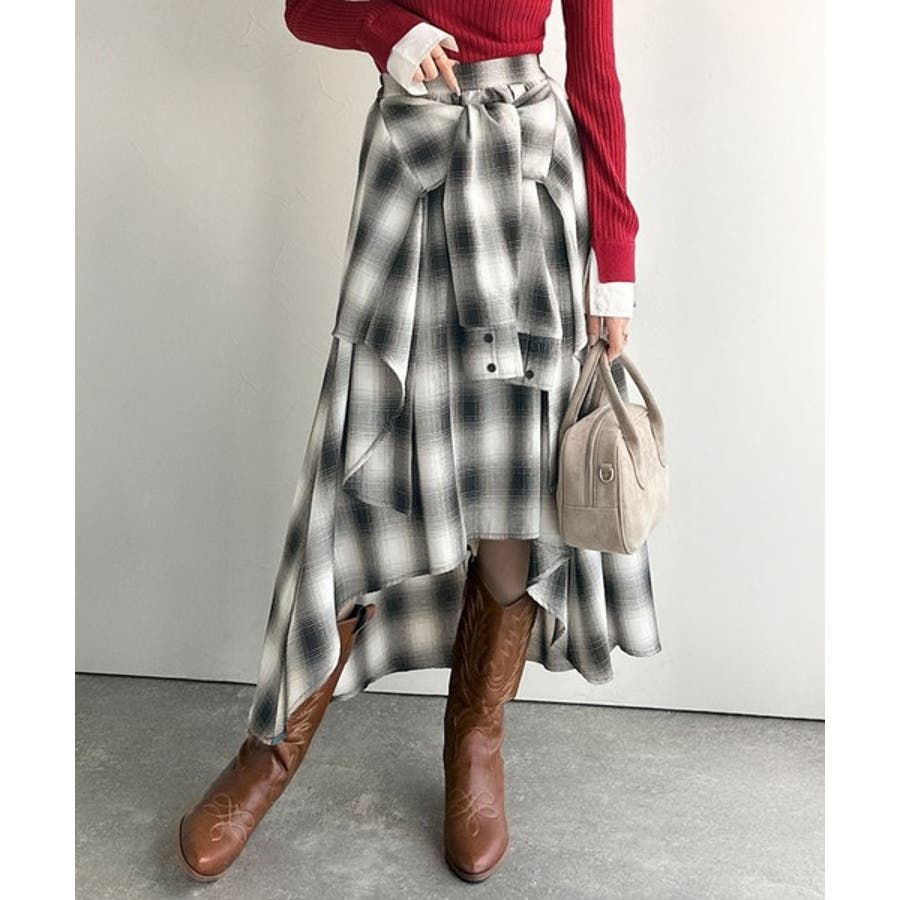今季のトレンド、チェック柄を取り入れたシャツ巻き風デザインのスカート。