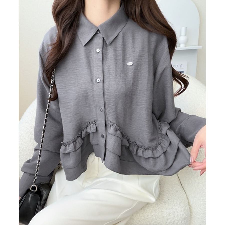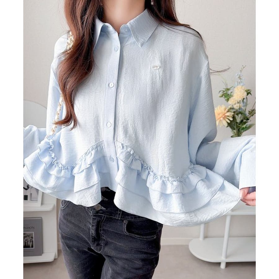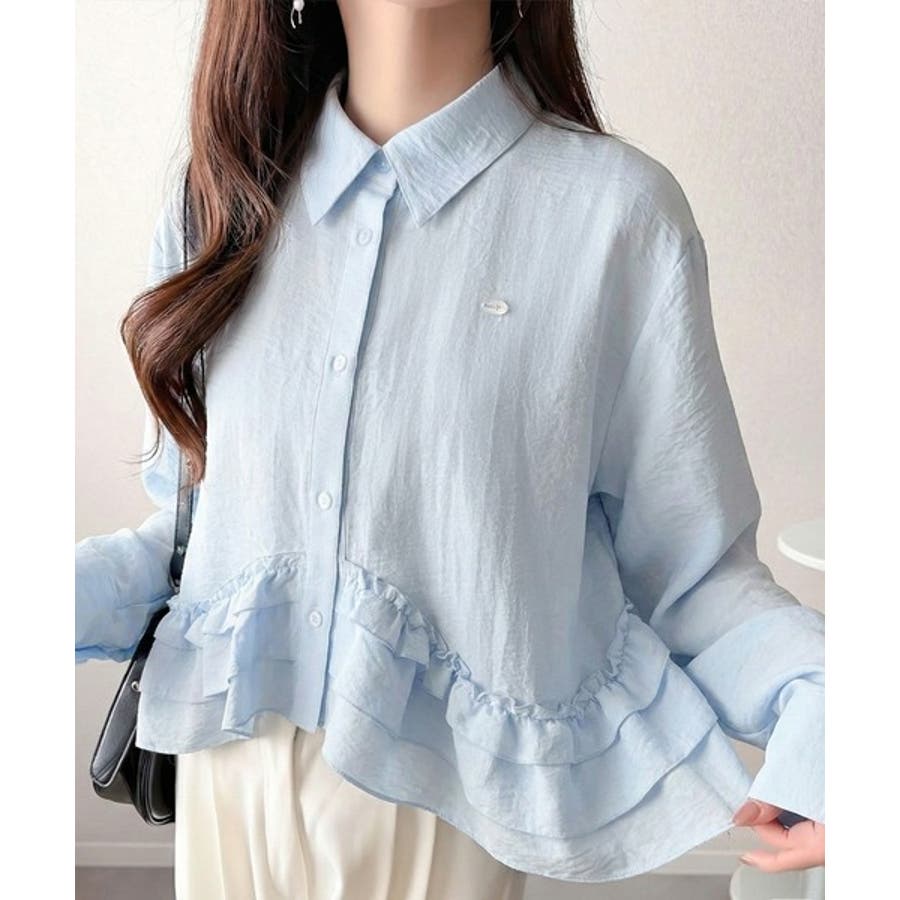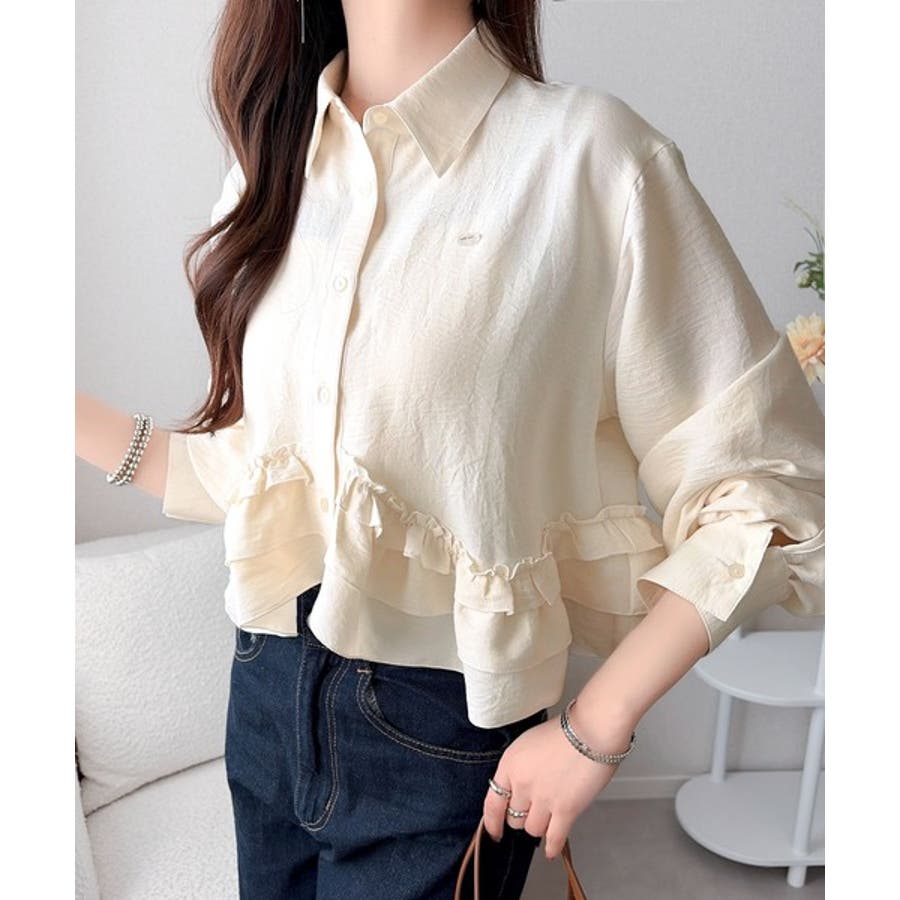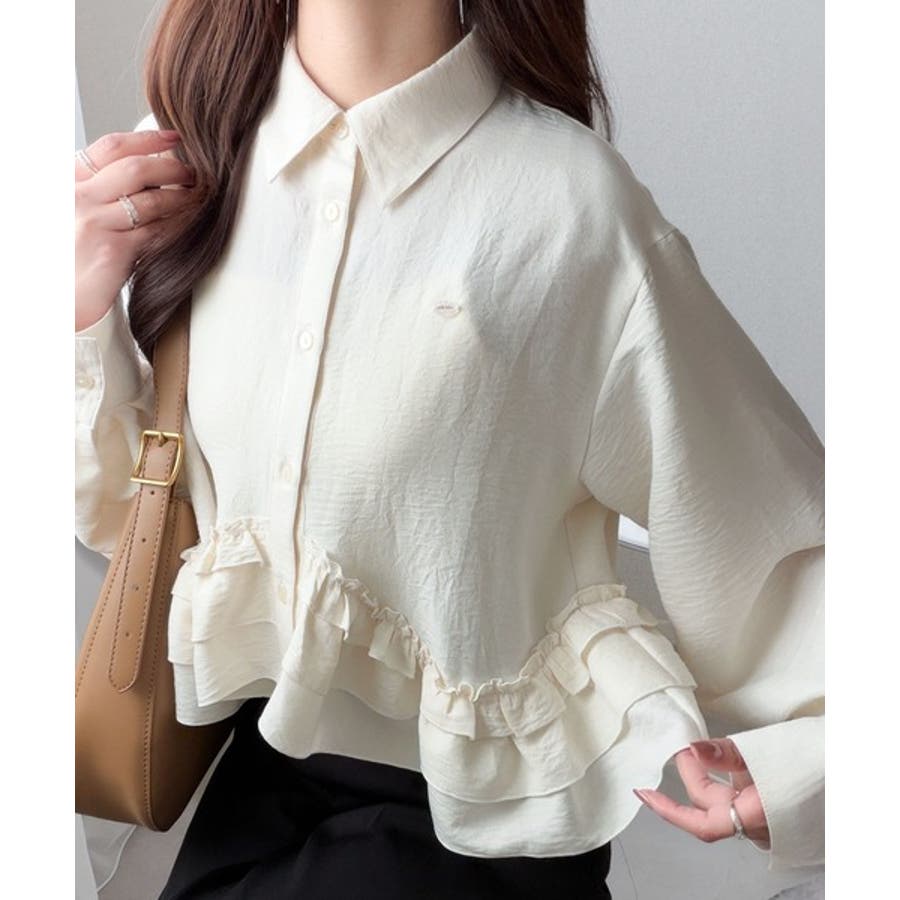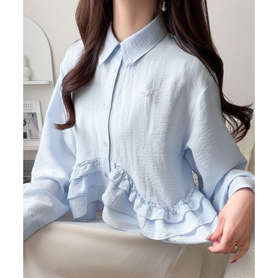 存在感のあるフリルが華やかで、一枚でサマになるシャツブラウス。