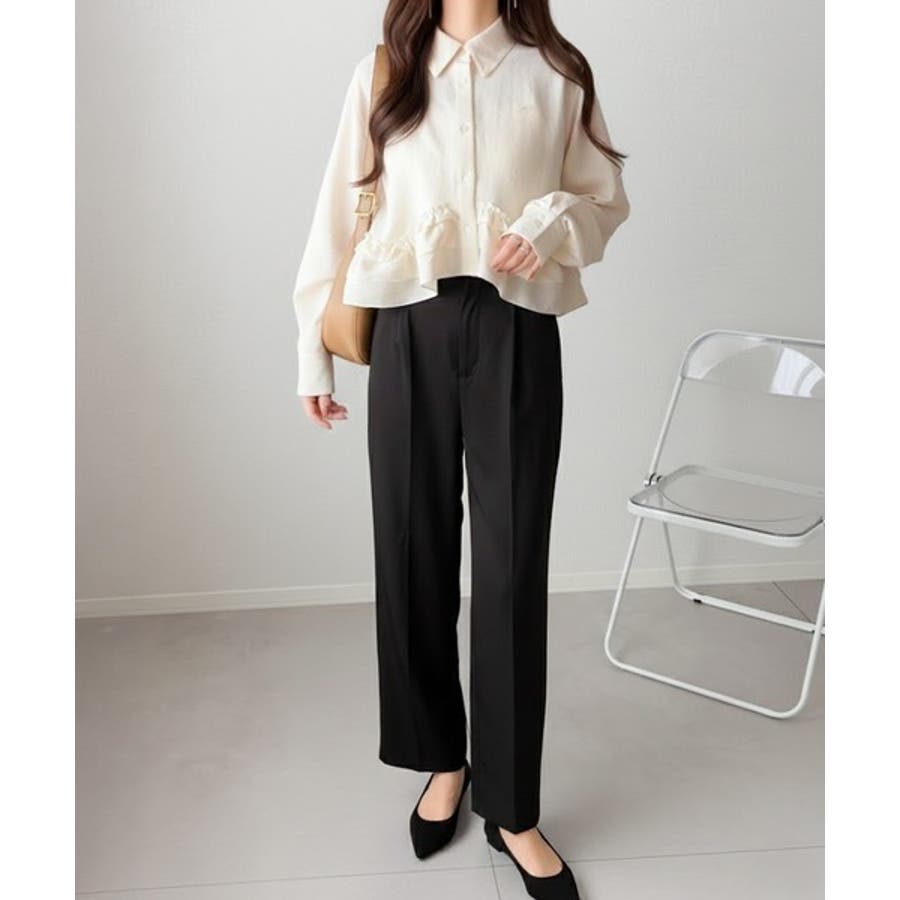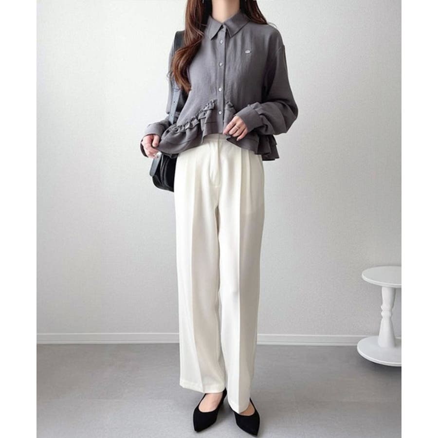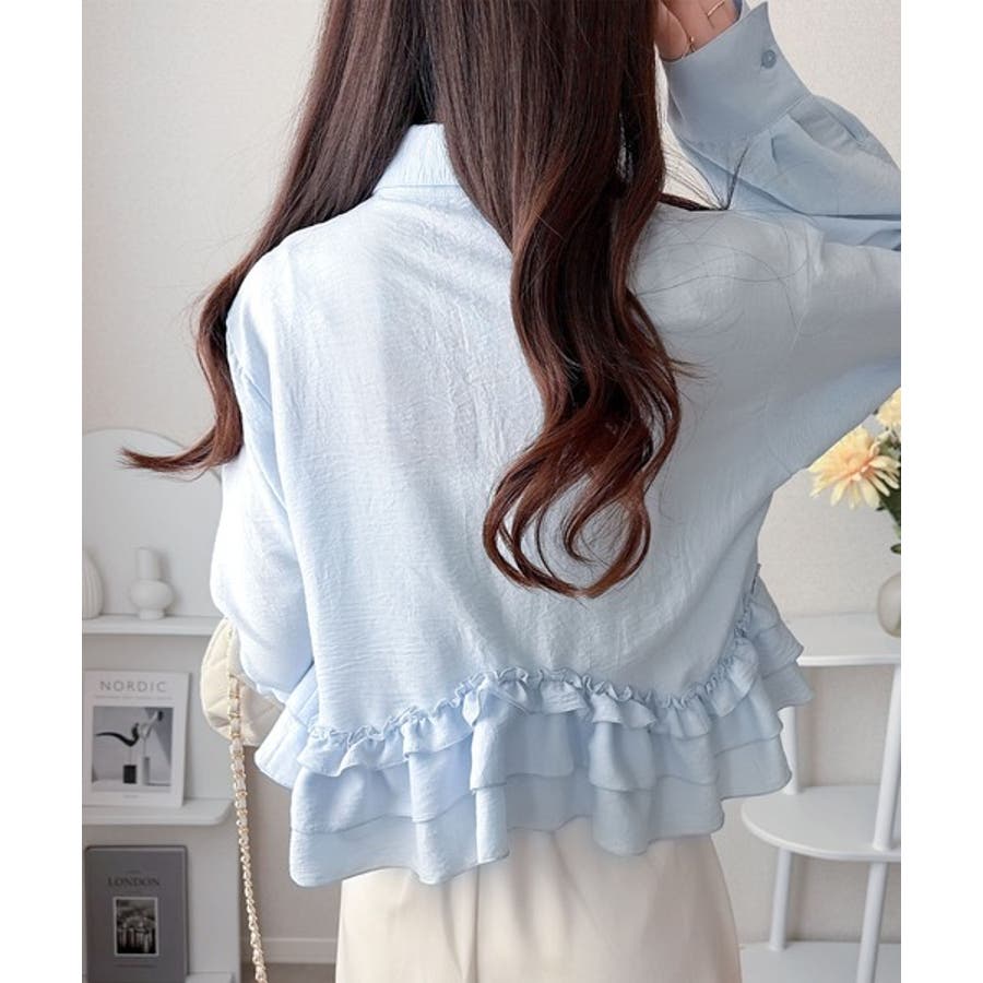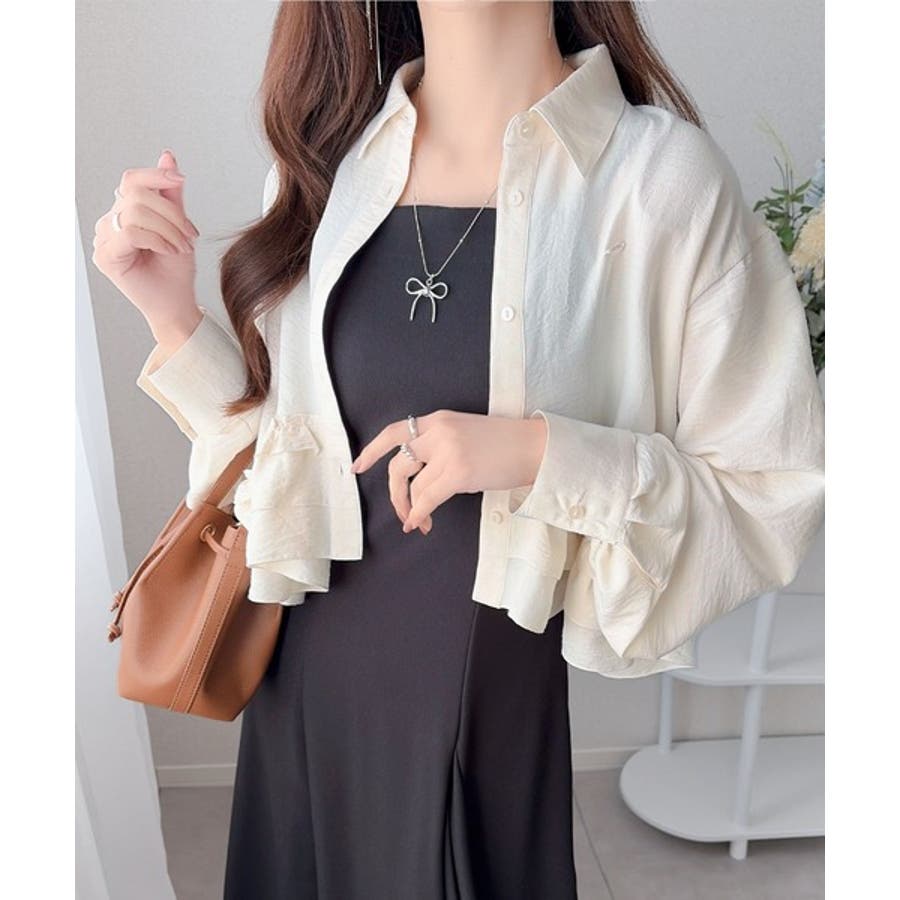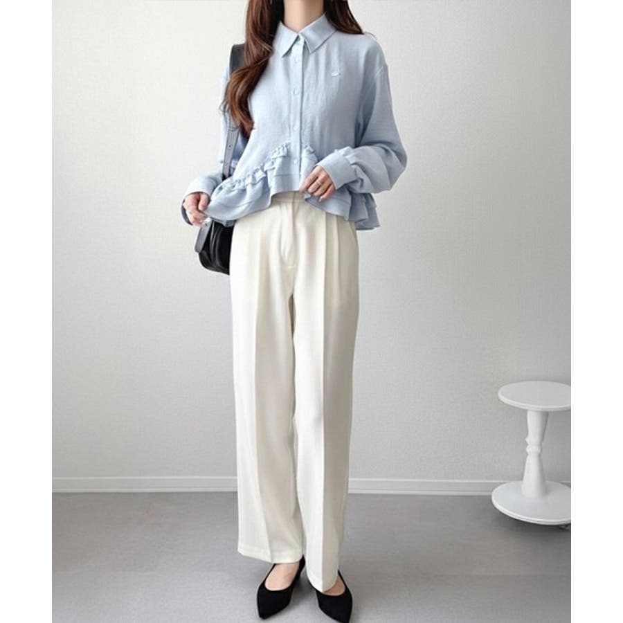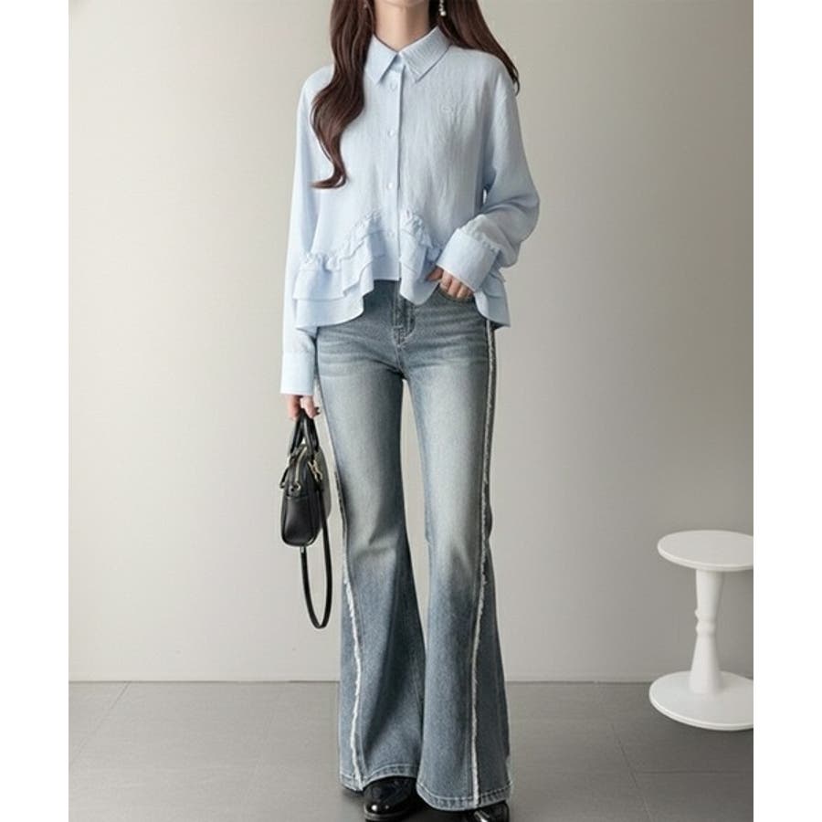 存在感のあるフリルが華やかで、一枚でサマになるシャツブラウス。
