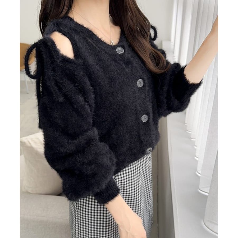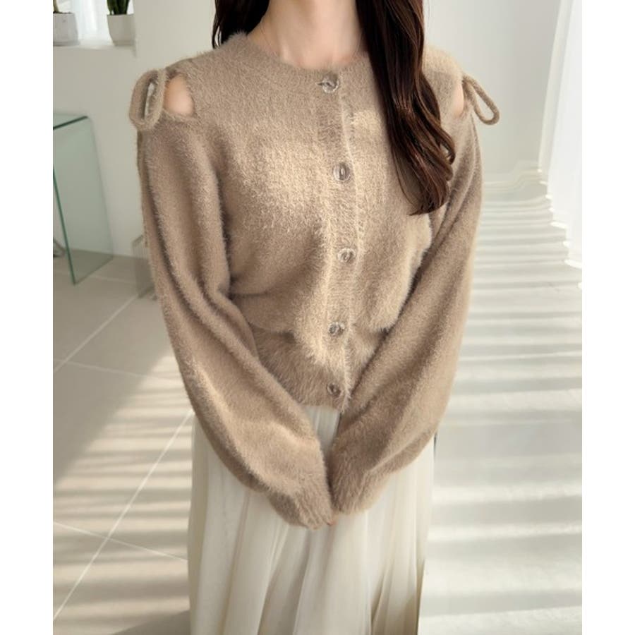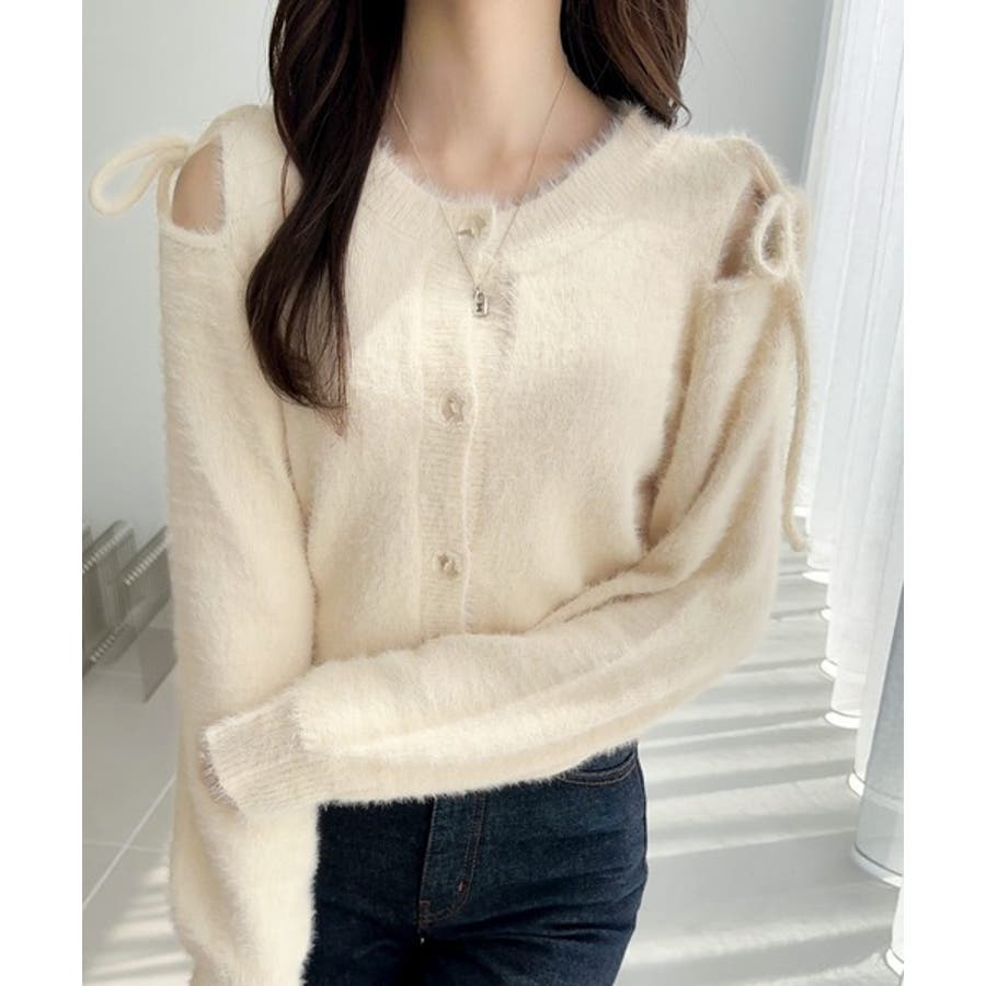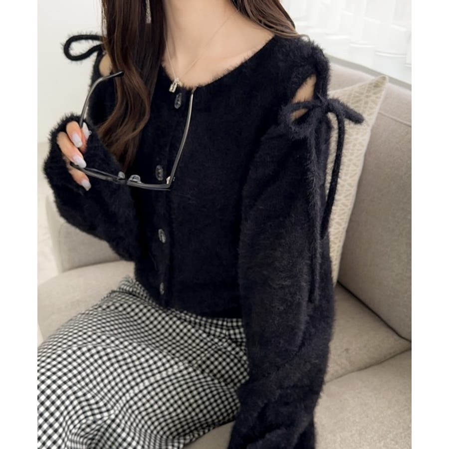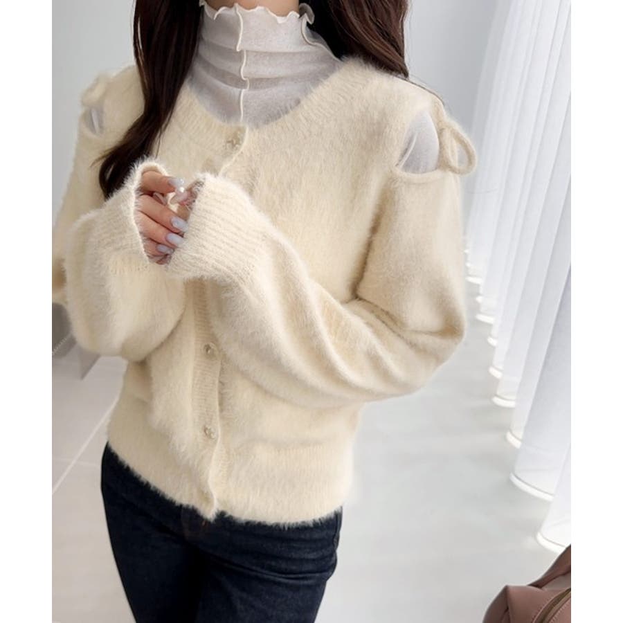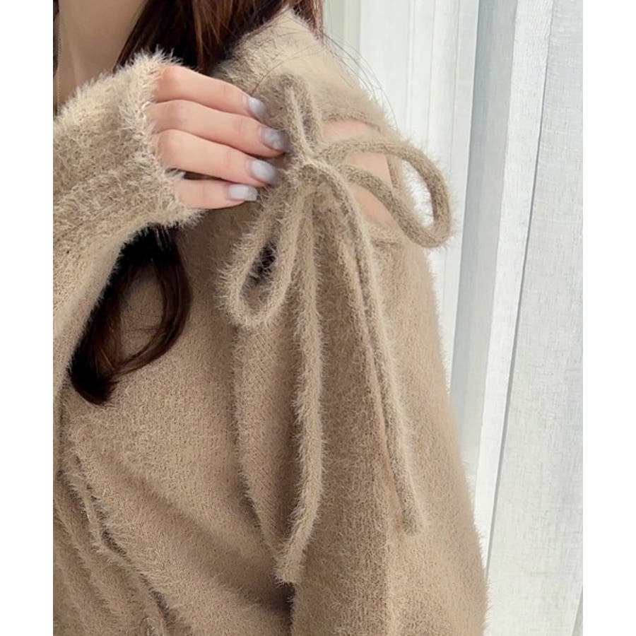 フェミニン度高まるふんわりシャギーニット!スリットショルダーリボンカーディガン