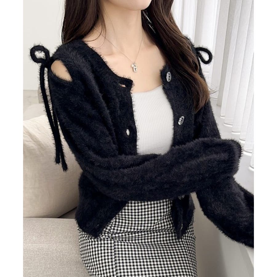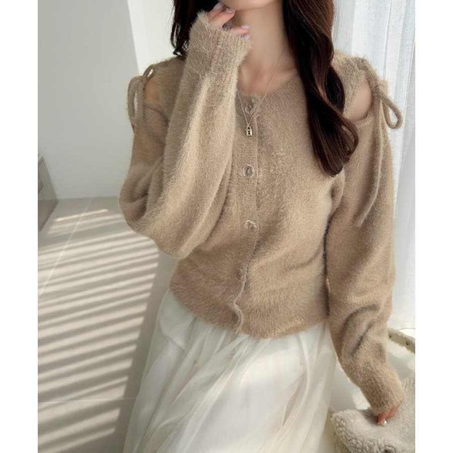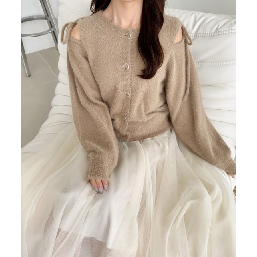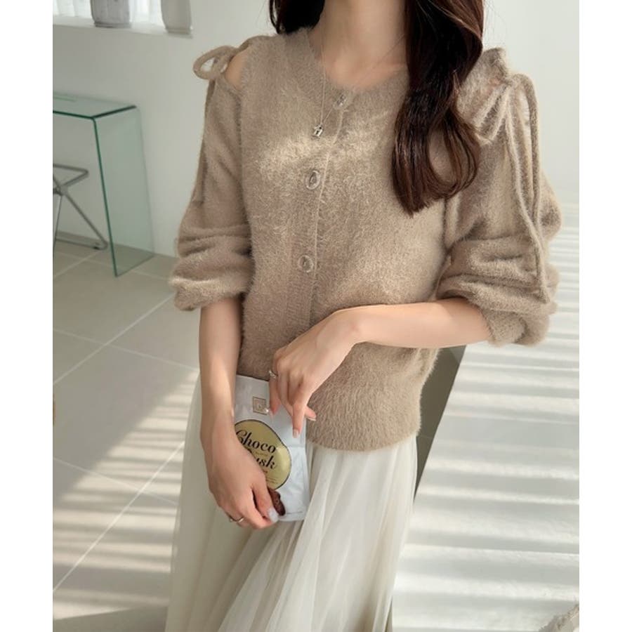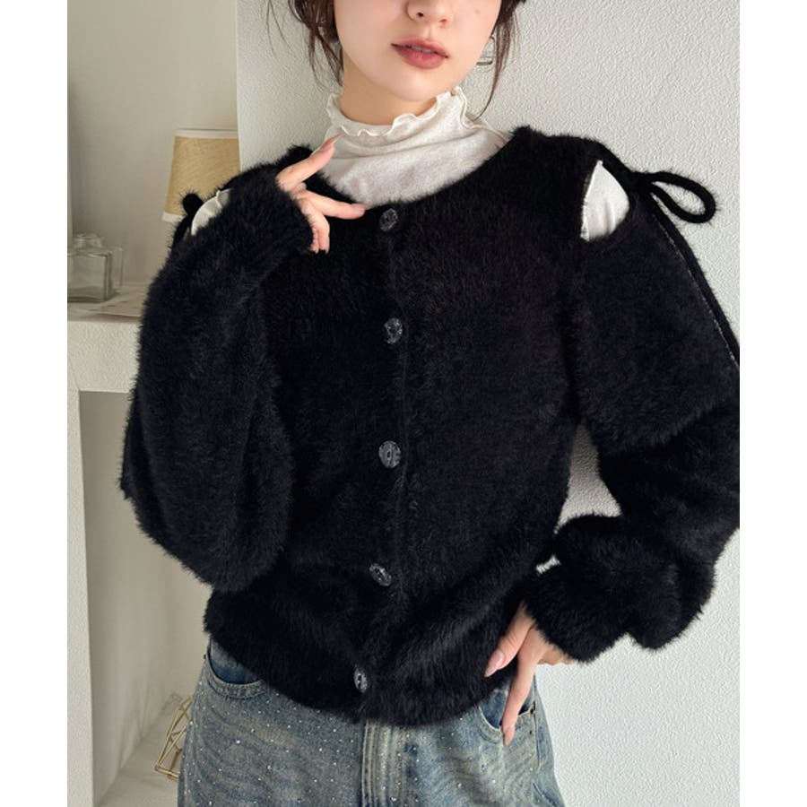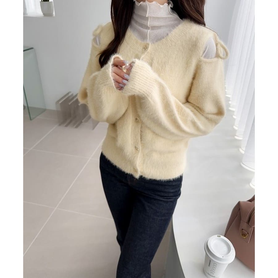 フェミニン度高まるふんわりシャギーニット!スリットショルダーリボンカーディガン