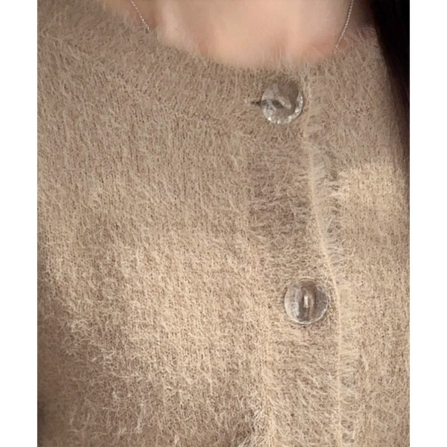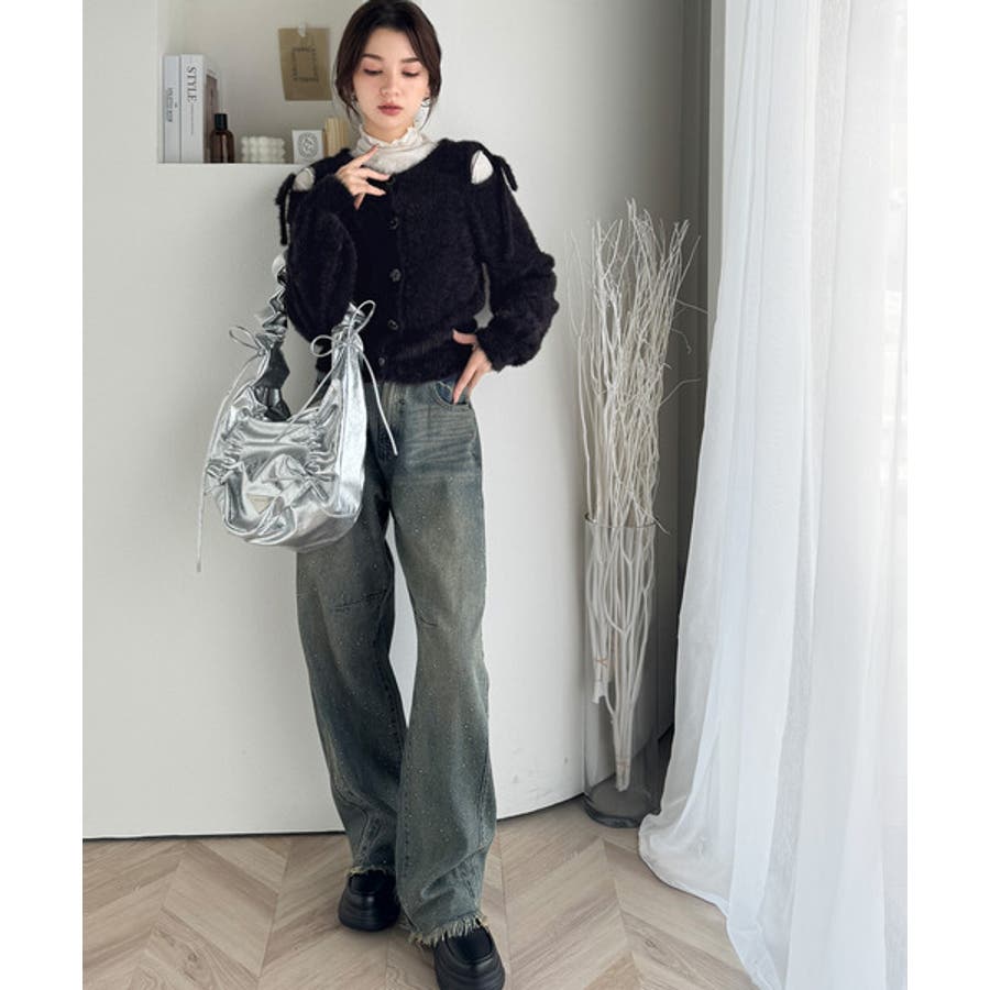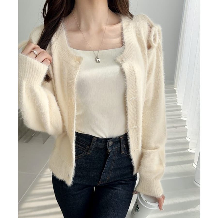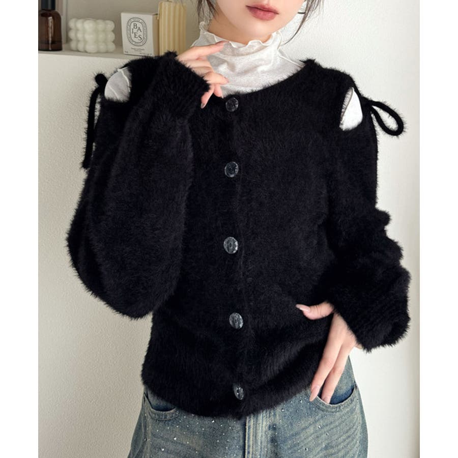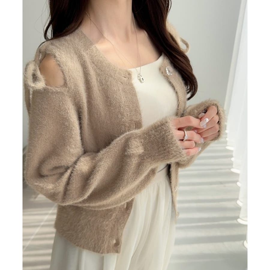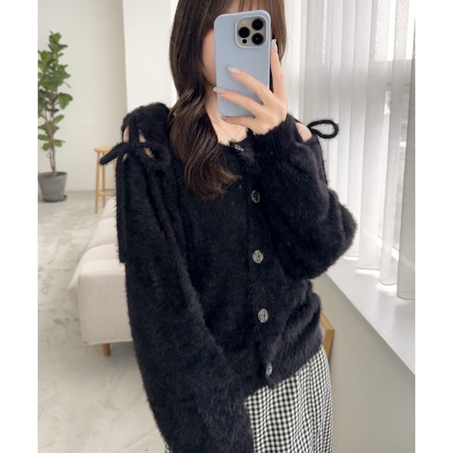 フェミニン度高まるふんわりシャギーニット!スリットショルダーリボンカーディガン