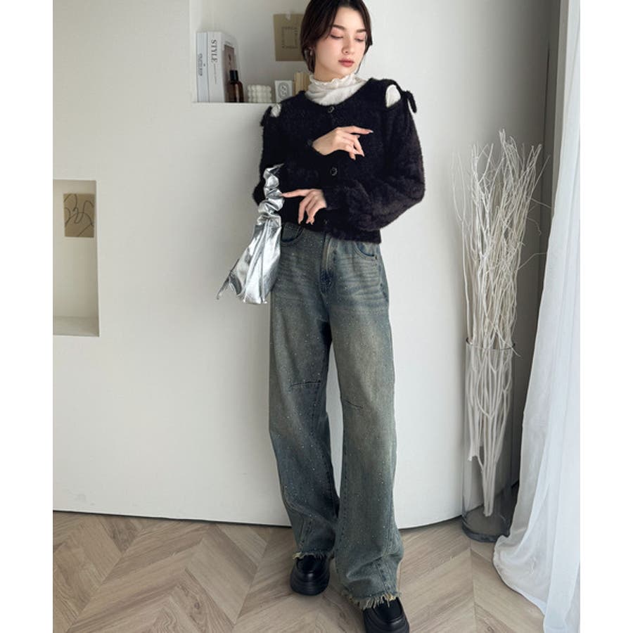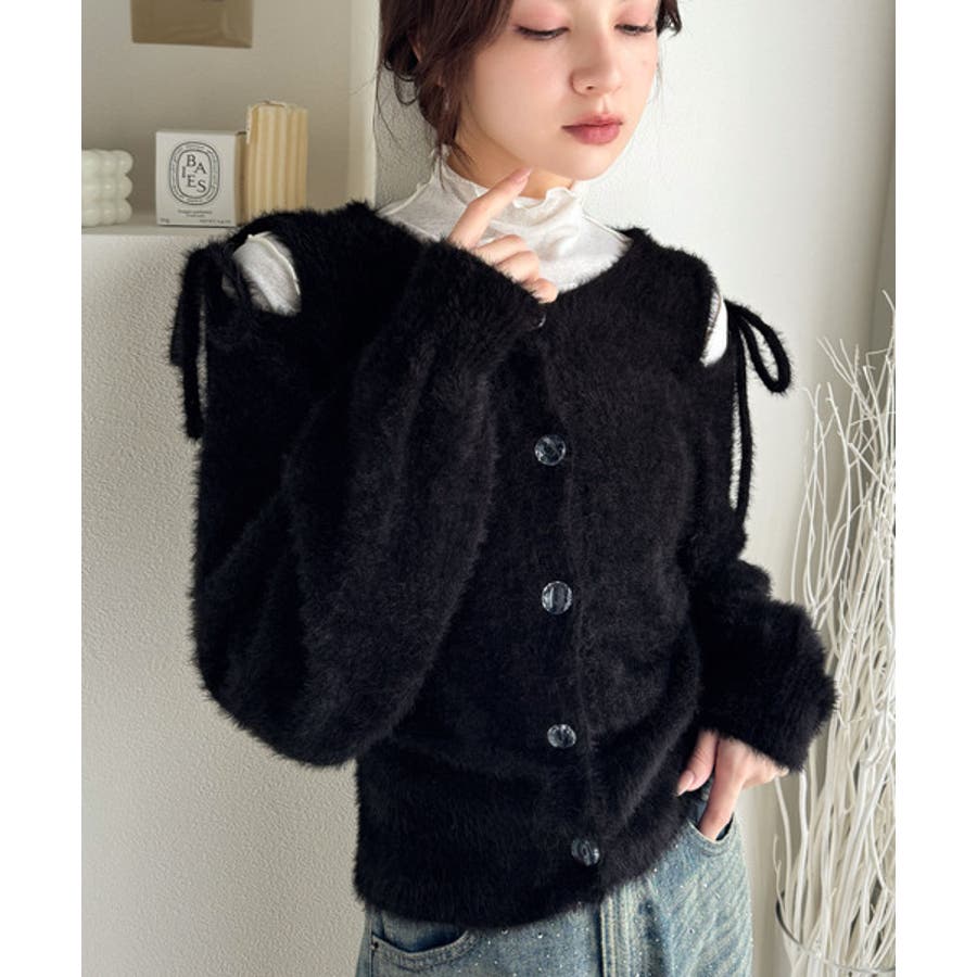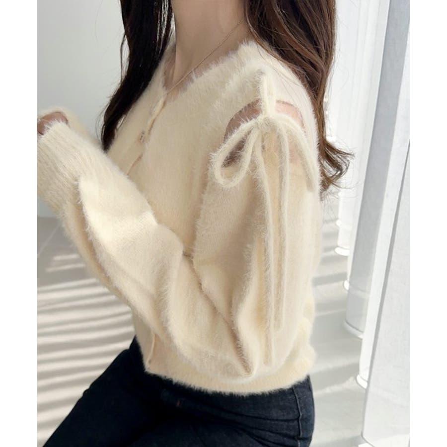 ふわふわのシャギーニットにショルダースリットから覗くリボンがアクセントになった一枚。