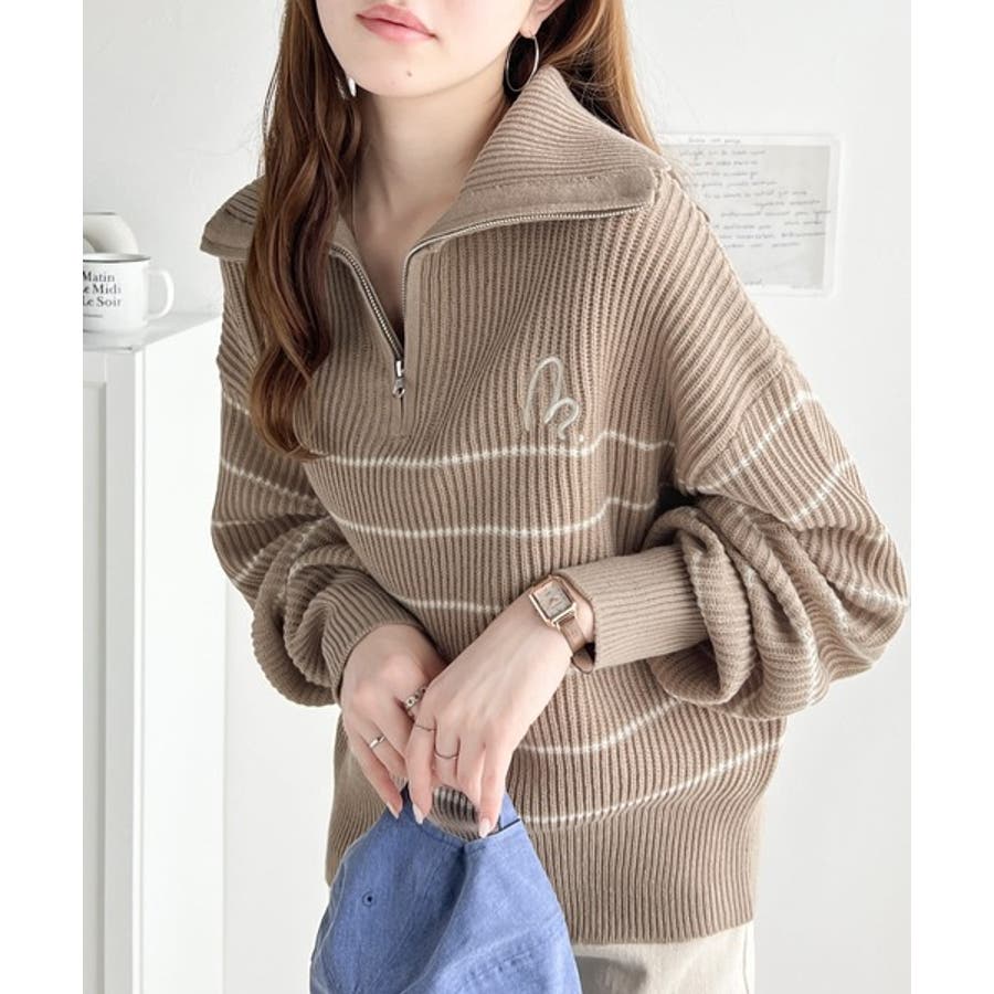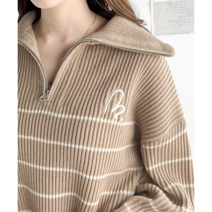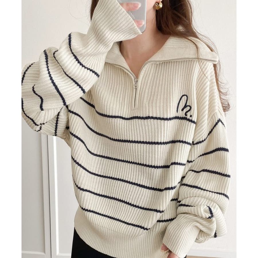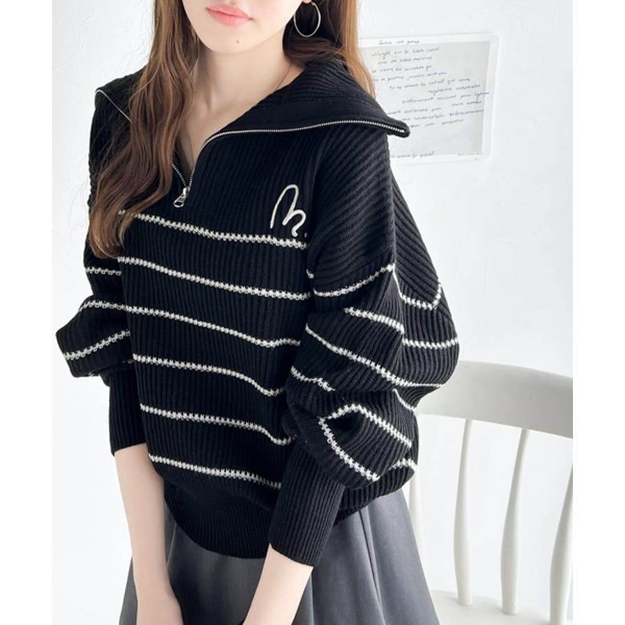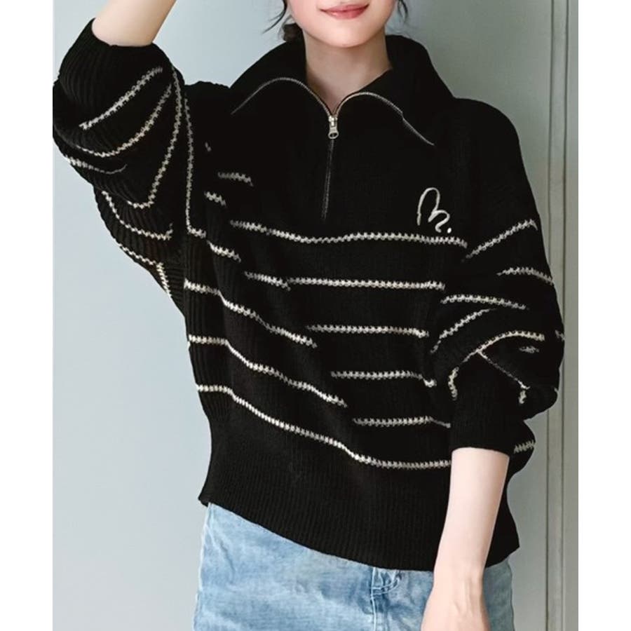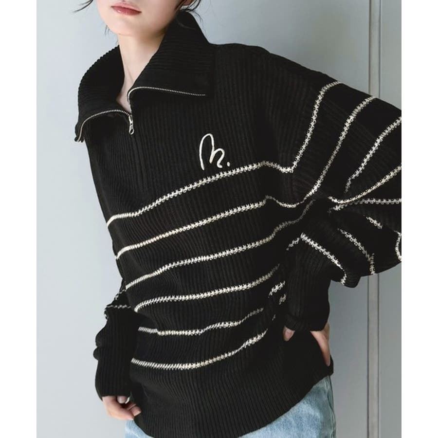 キュンと大人可愛いボーダーニット。胸刺繍ハーフジップニット