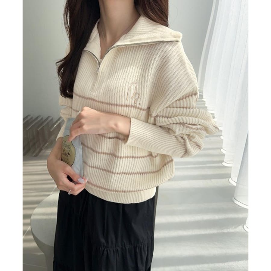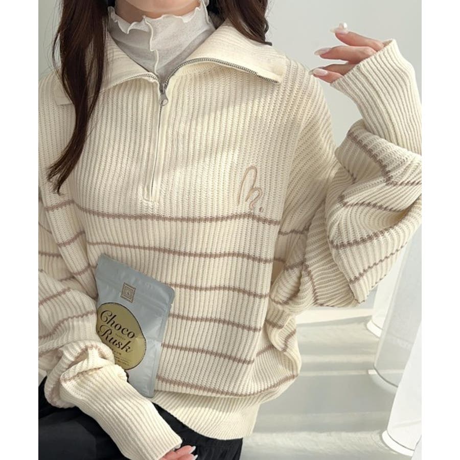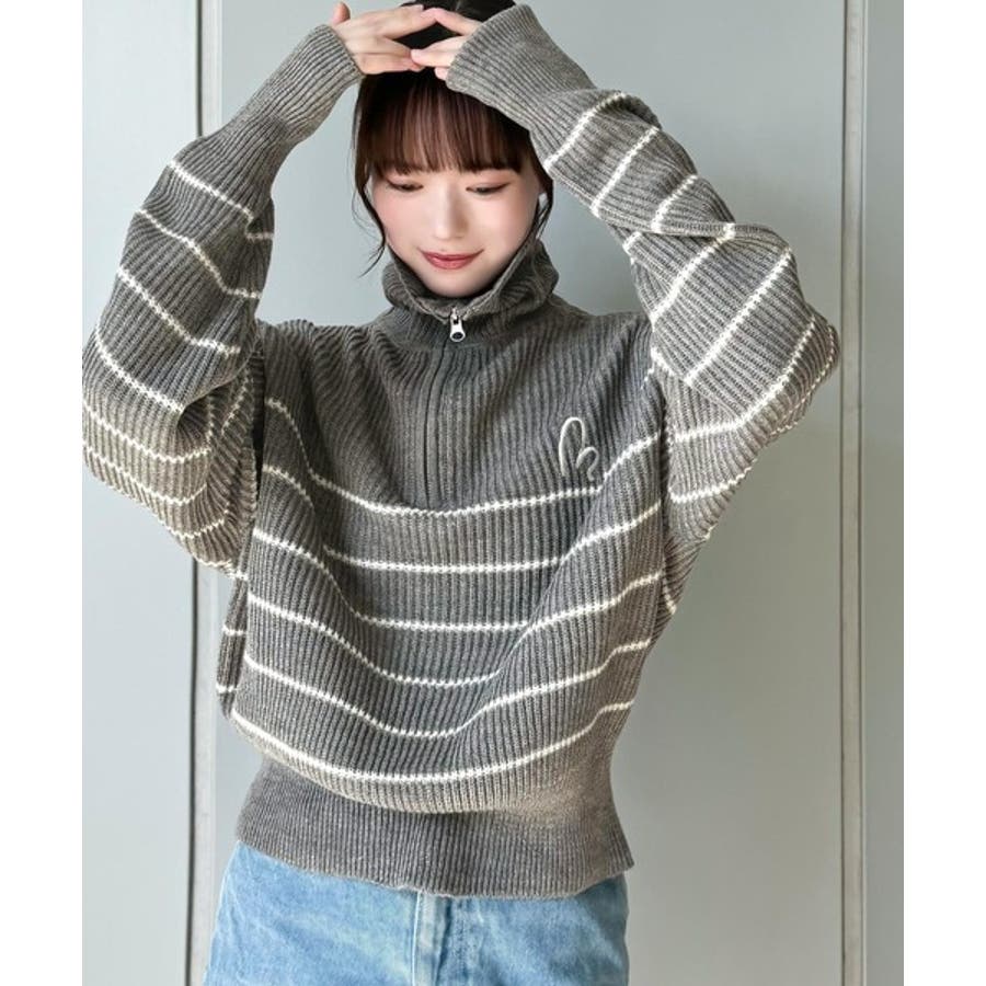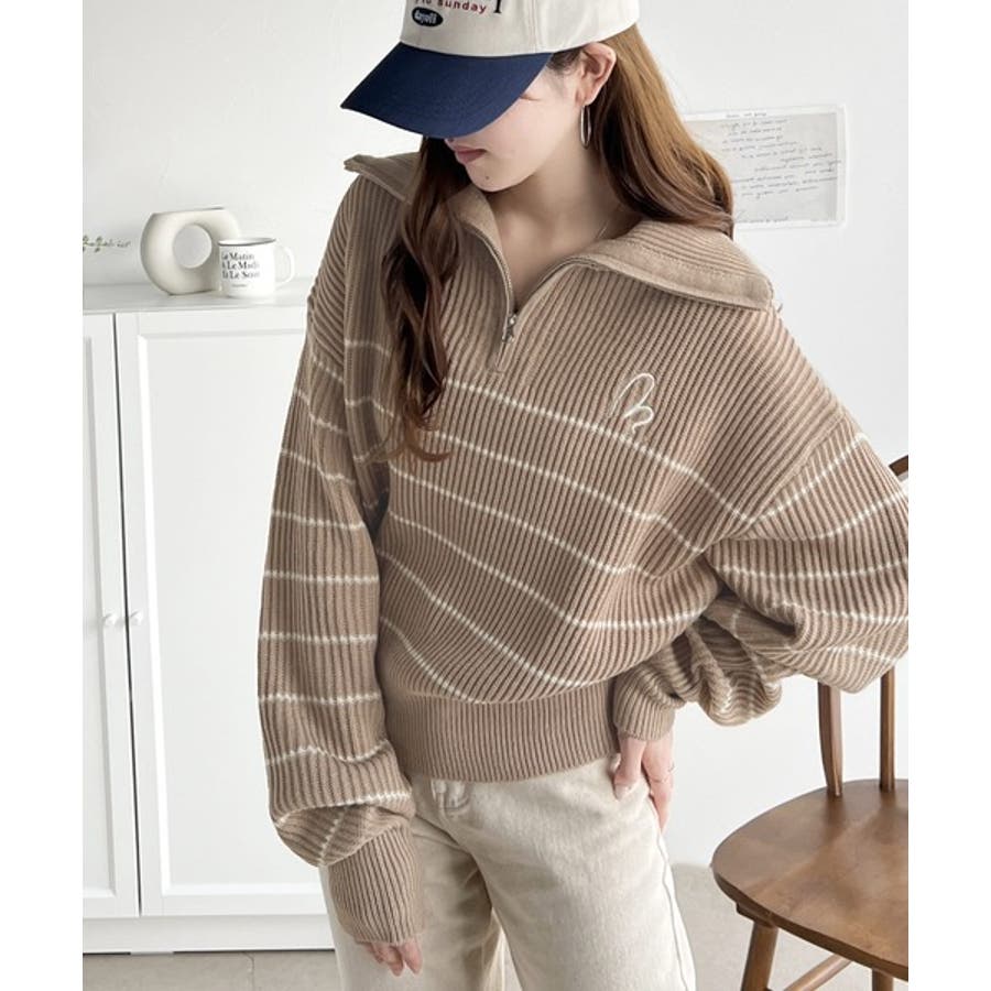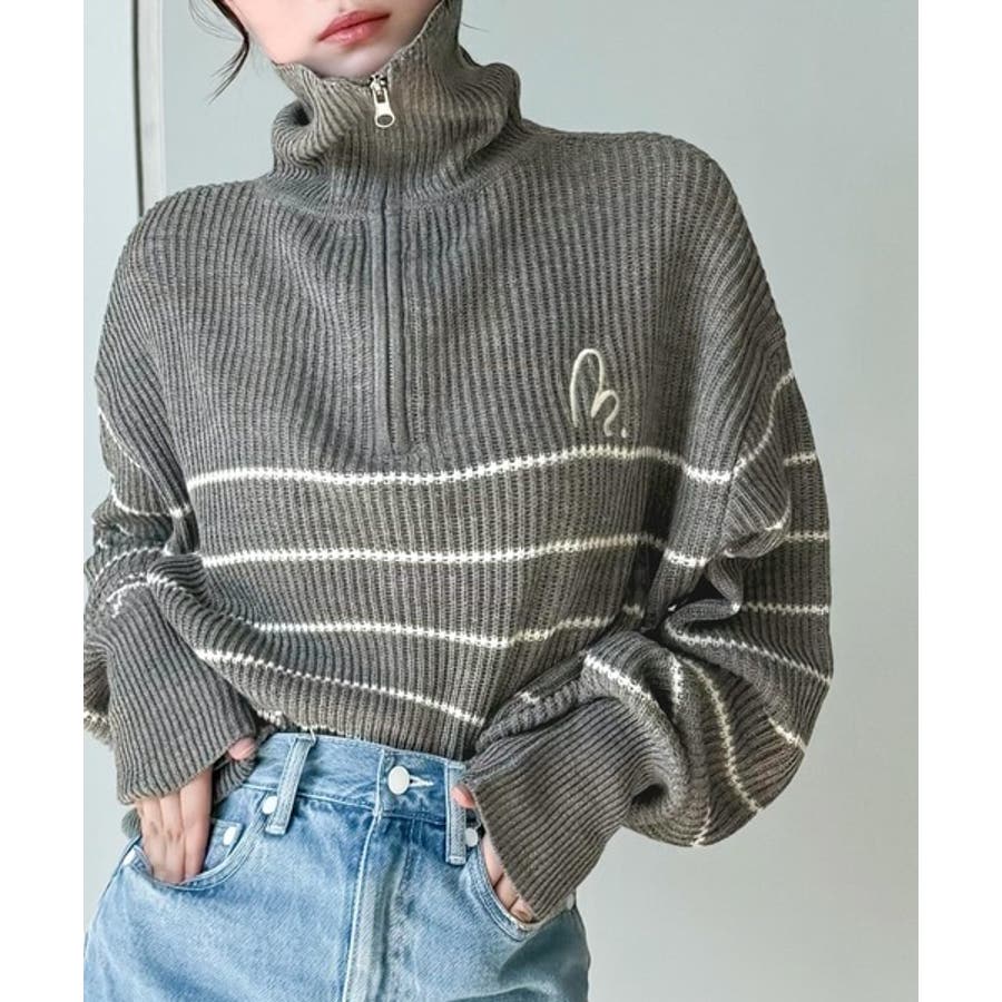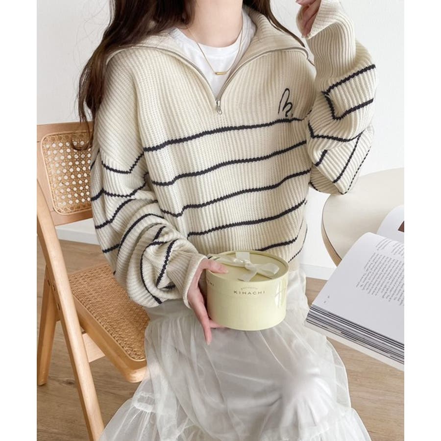 キュンと大人可愛いボーダーニット。胸刺繍ハーフジップニット