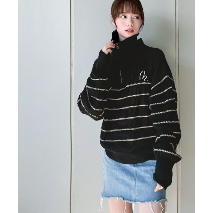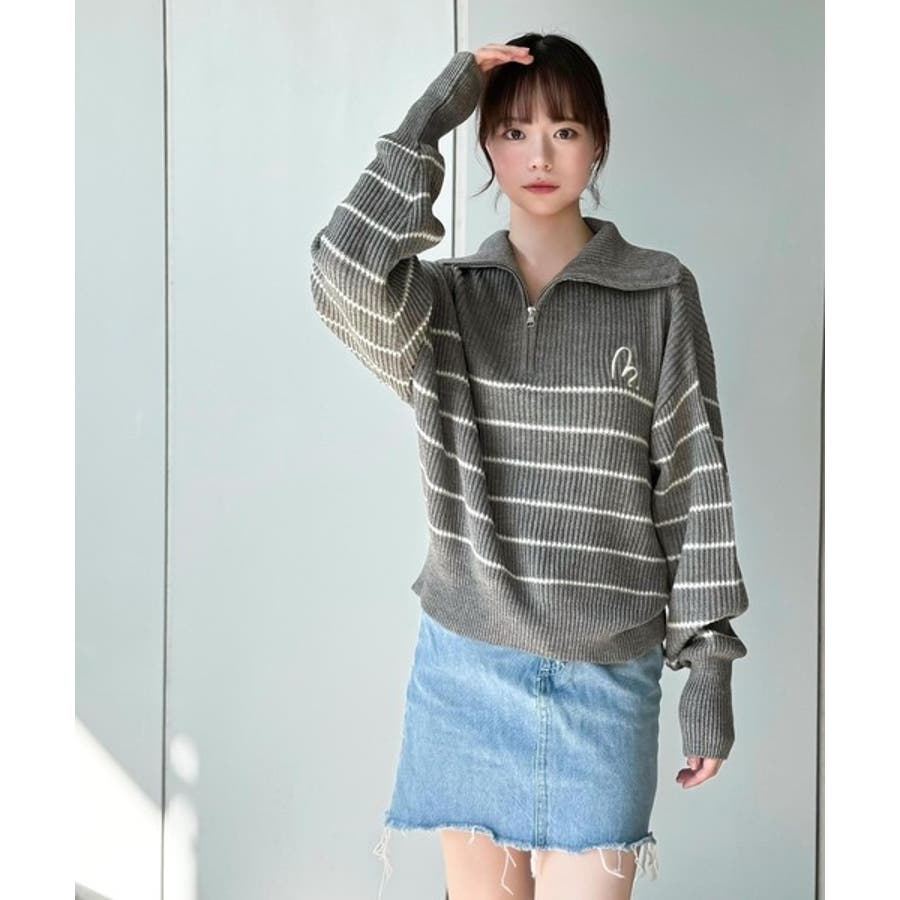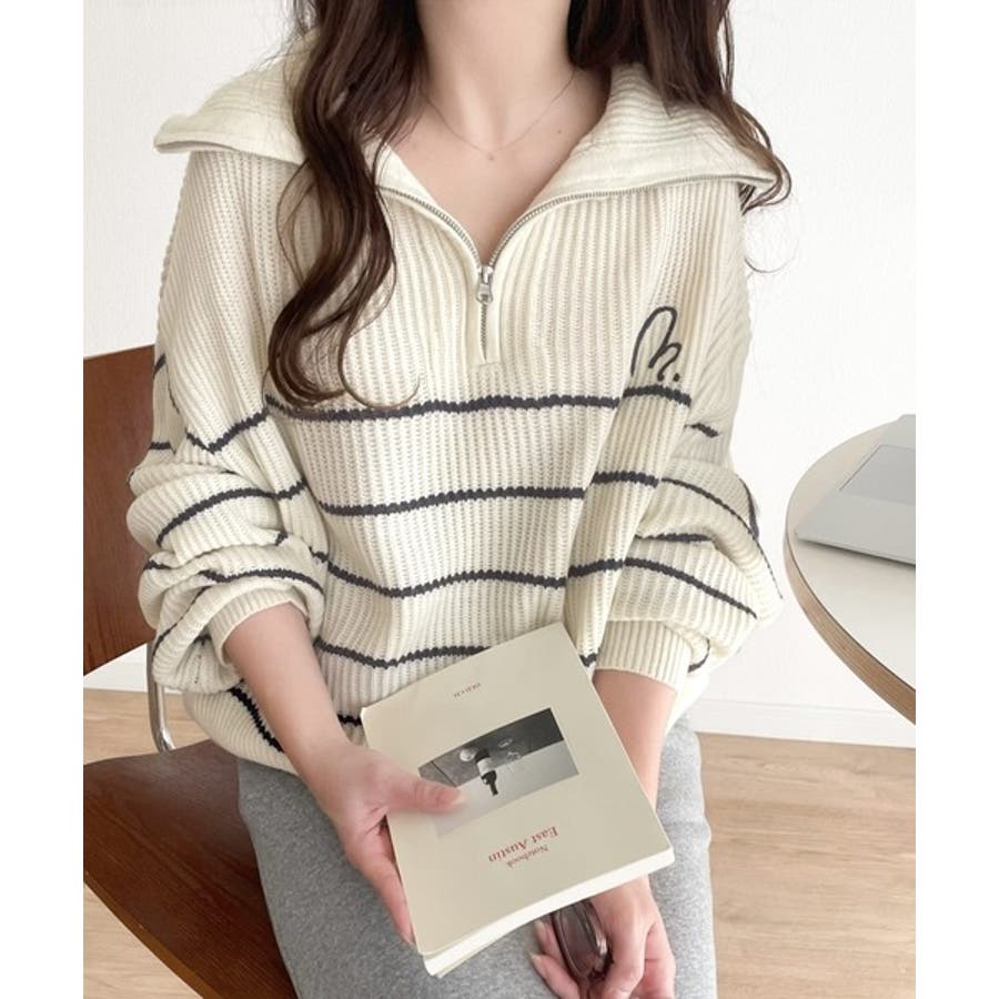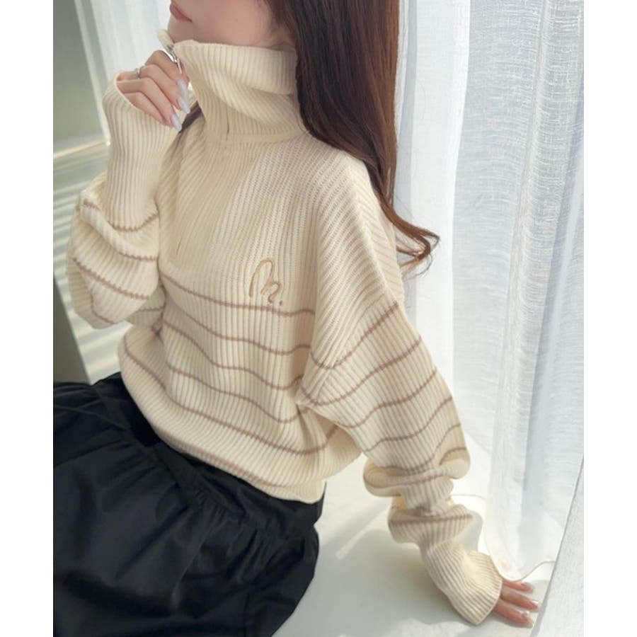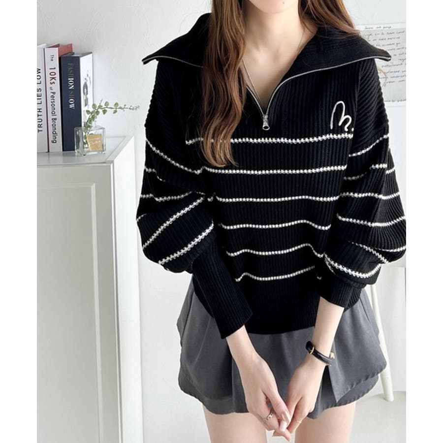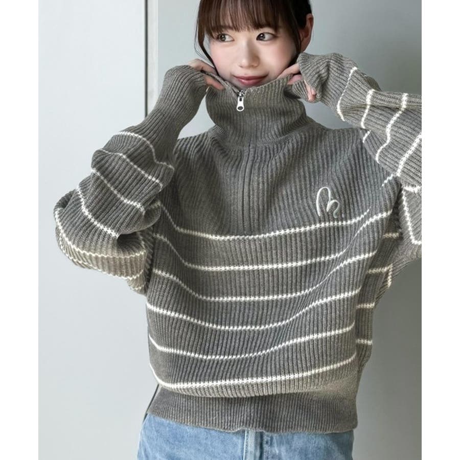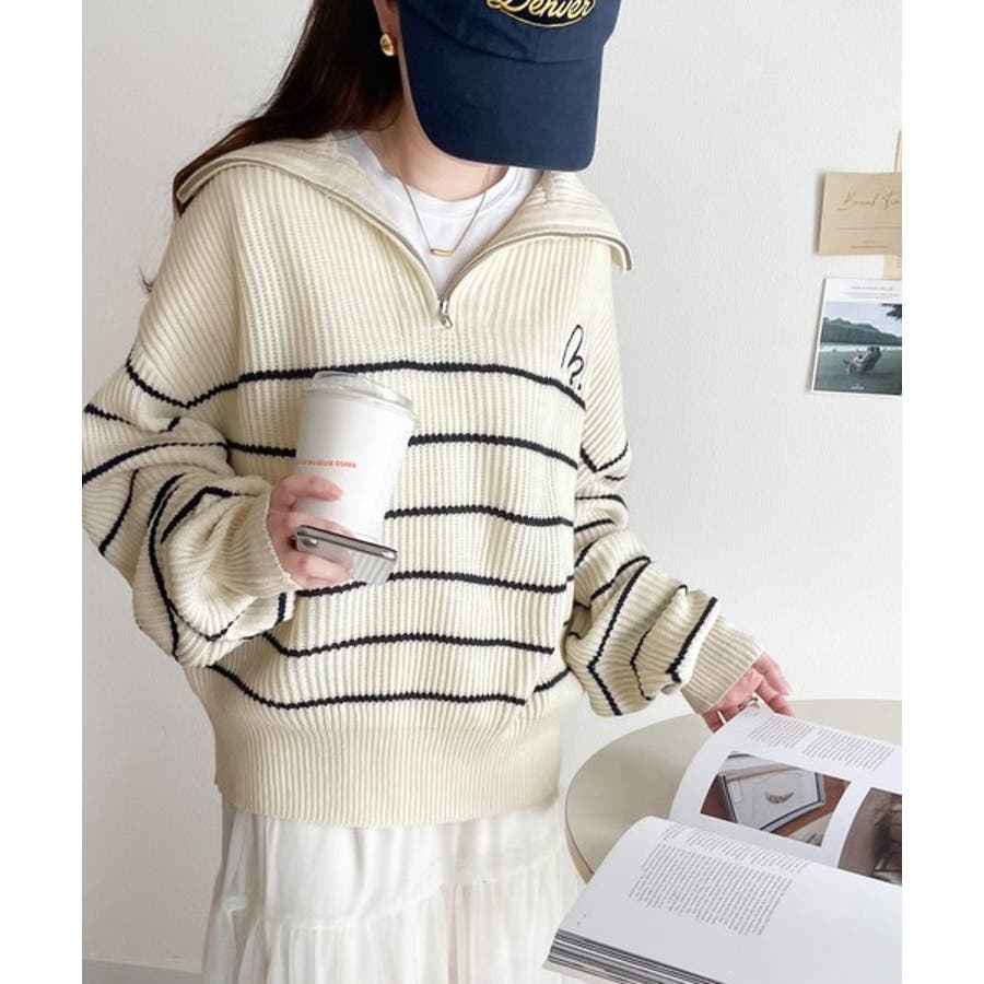 キュンと大人可愛いボーダーニット。胸刺繍ハーフジップニット