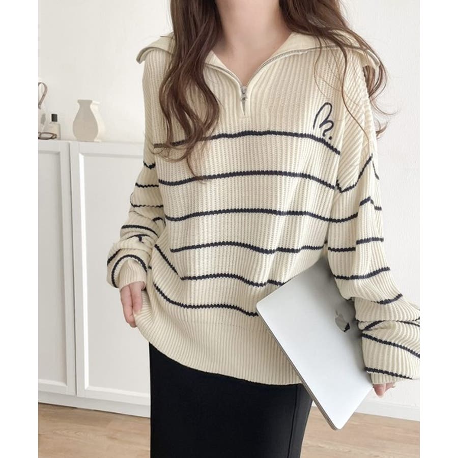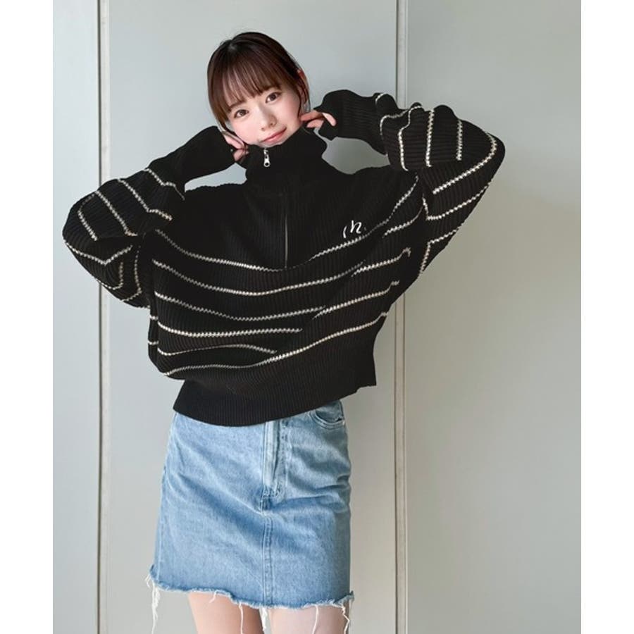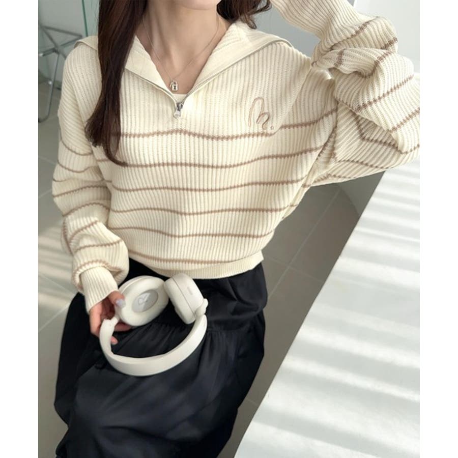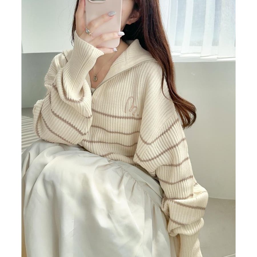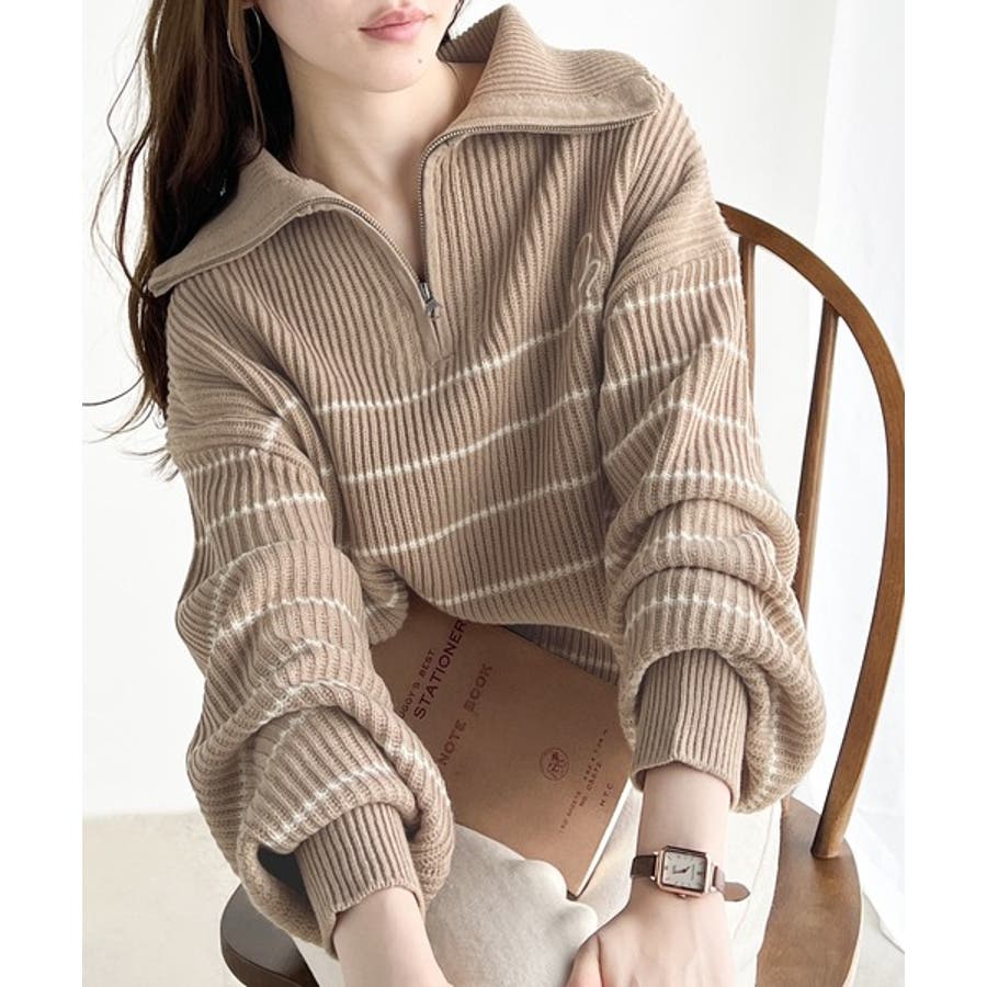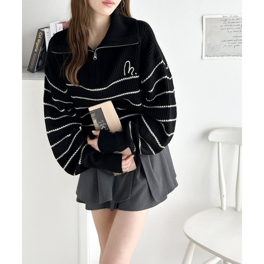 キュンと大人可愛いボーダーニット。胸刺繍ハーフジップニット