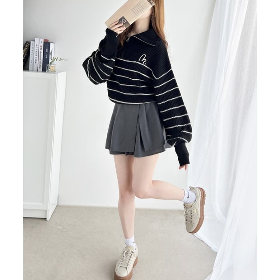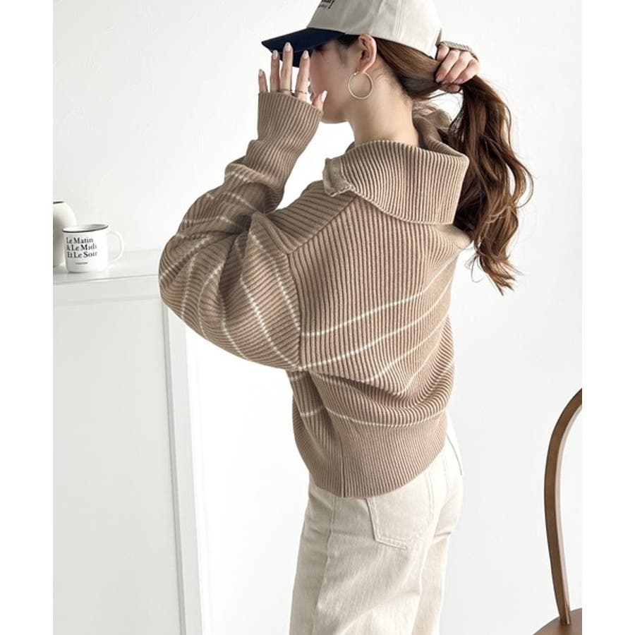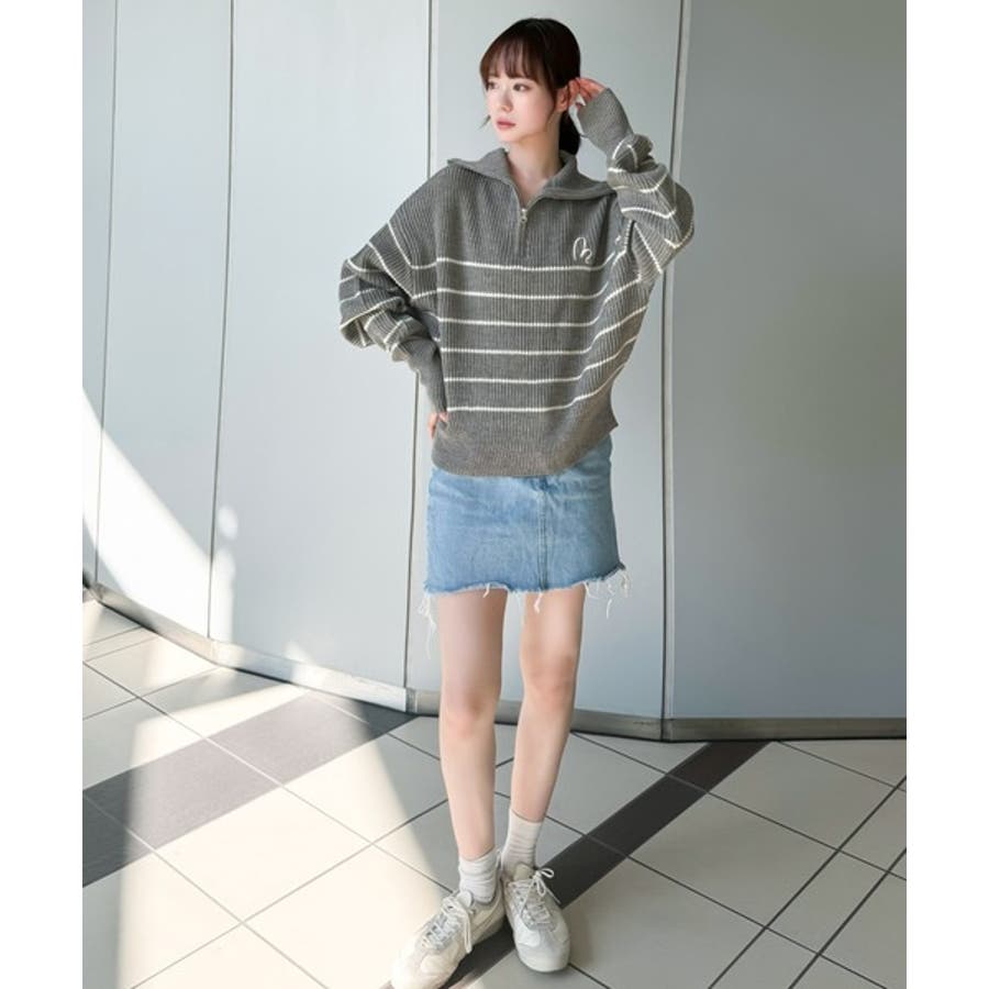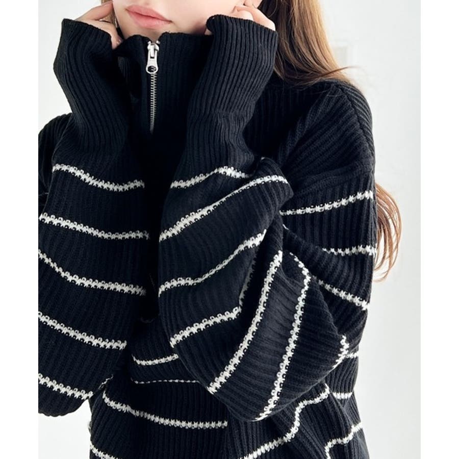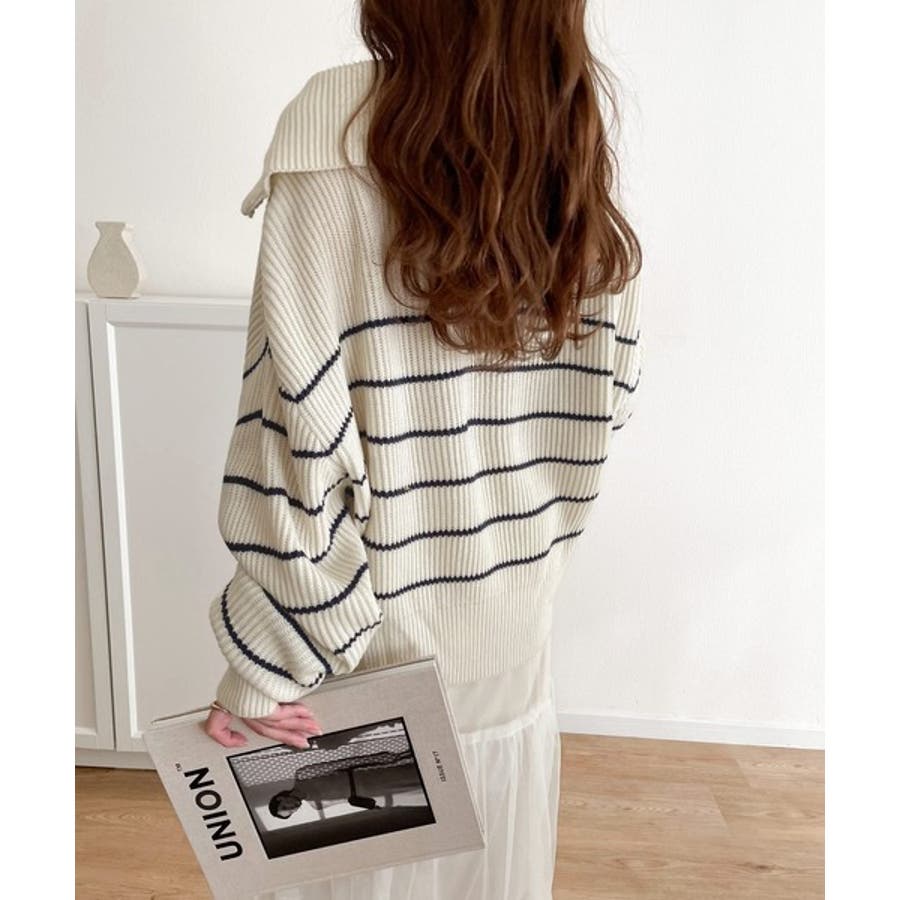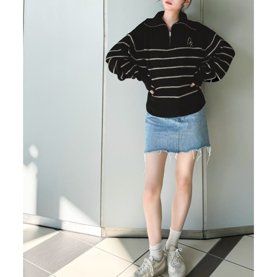 キュンと大人可愛いボーダーニット。胸刺繍ハーフジップニット