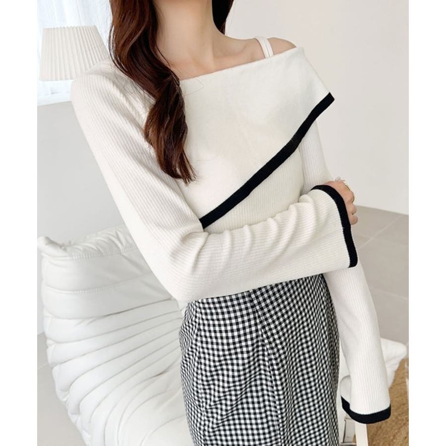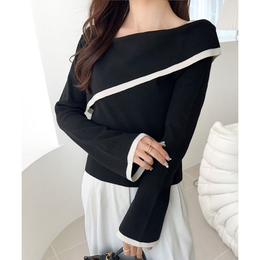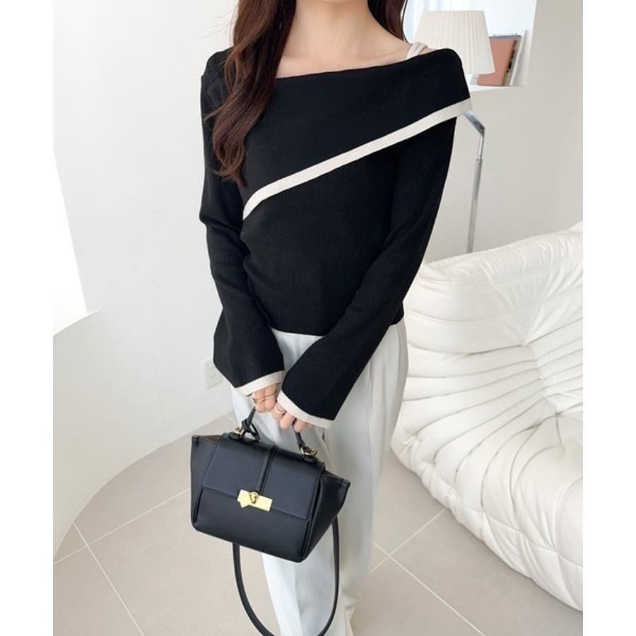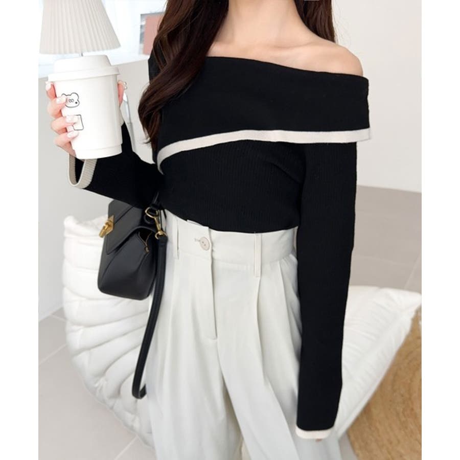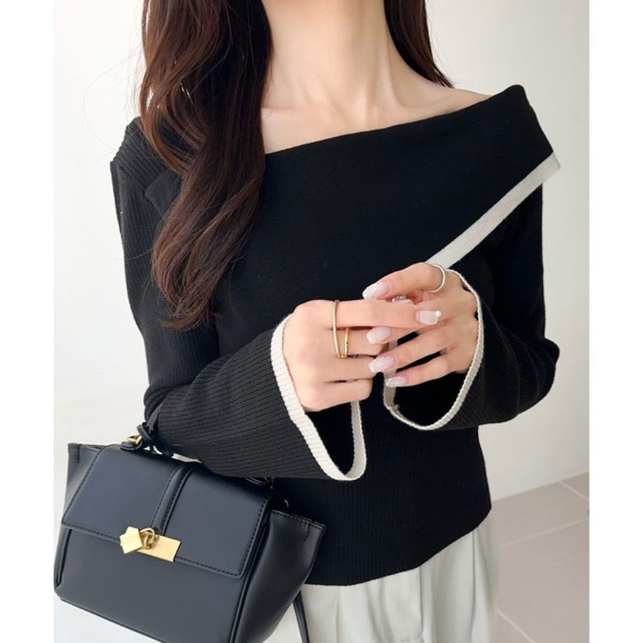 【アイボリー×ブラック】トレンド美スタイル。2WAYアシンメトリーオフショルダーリブニット