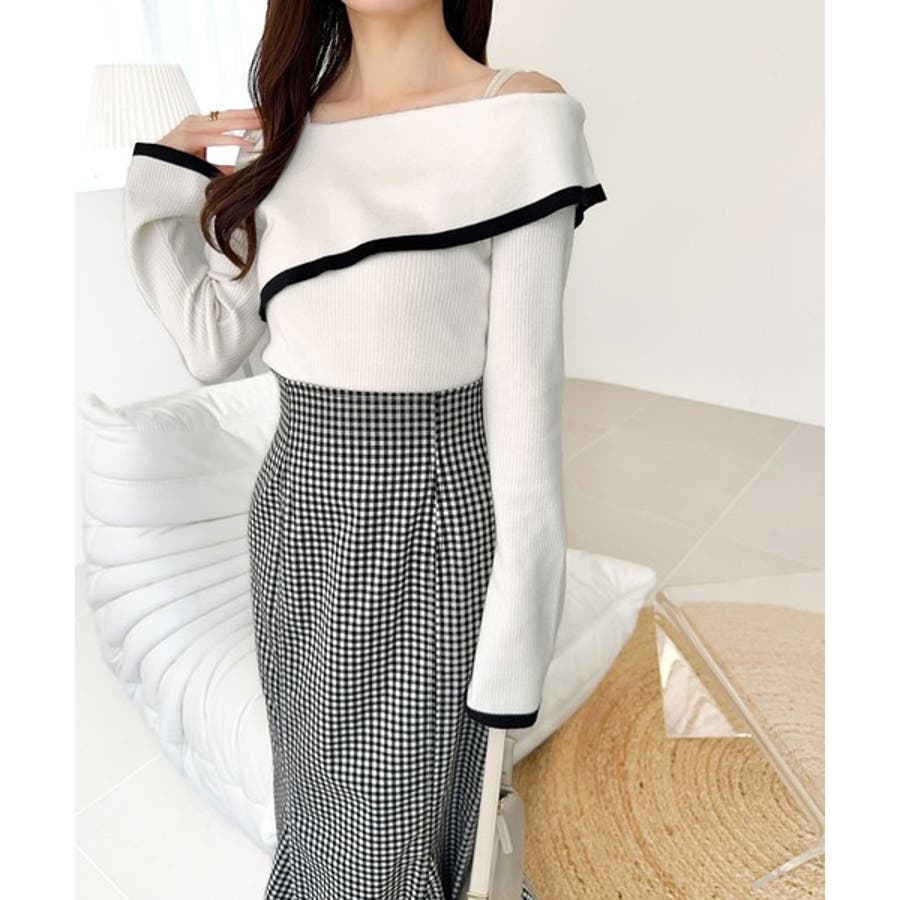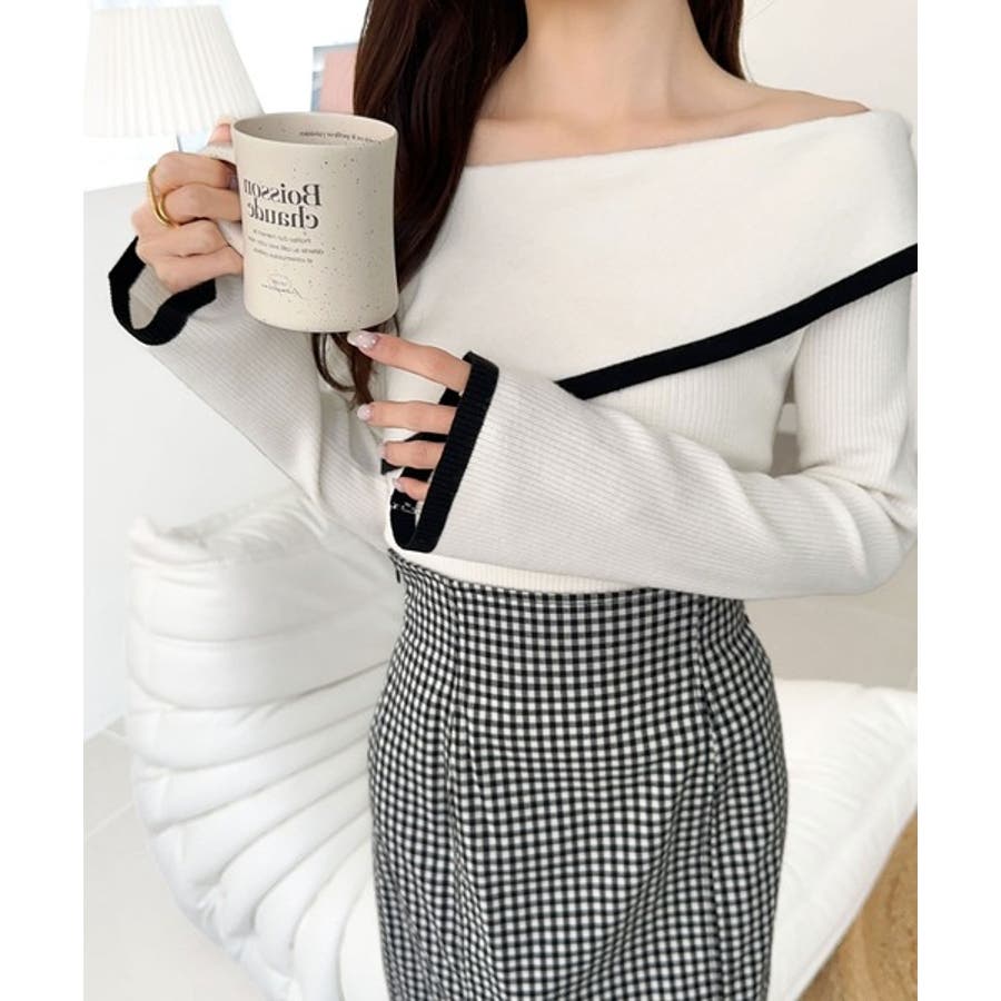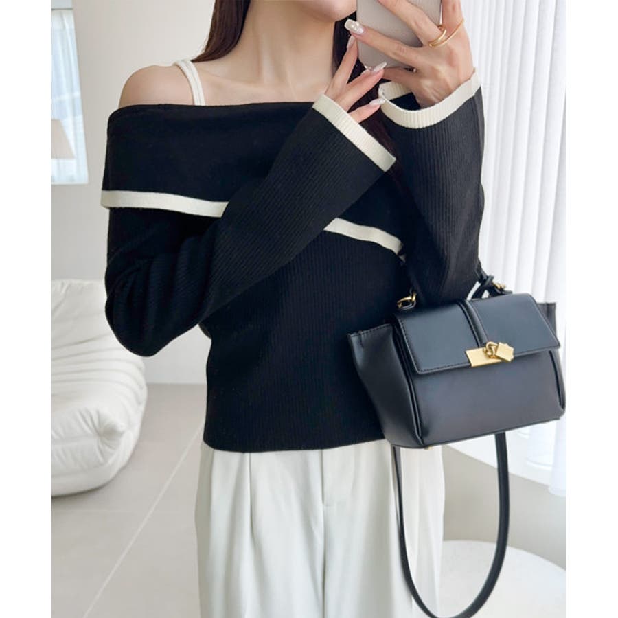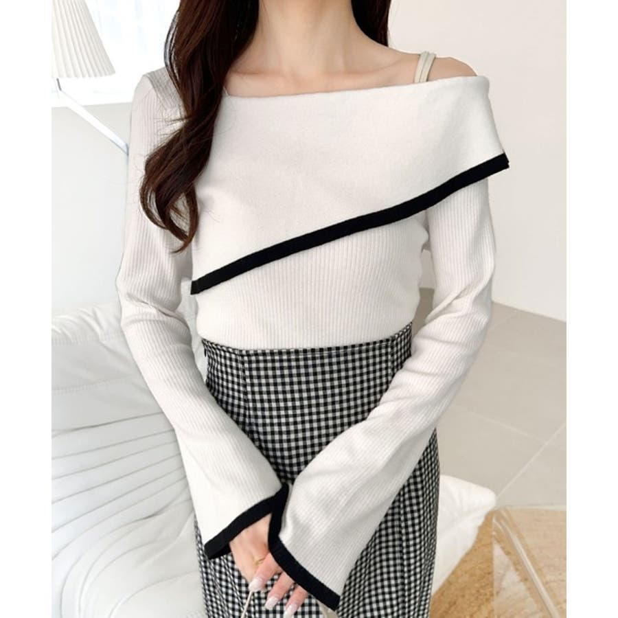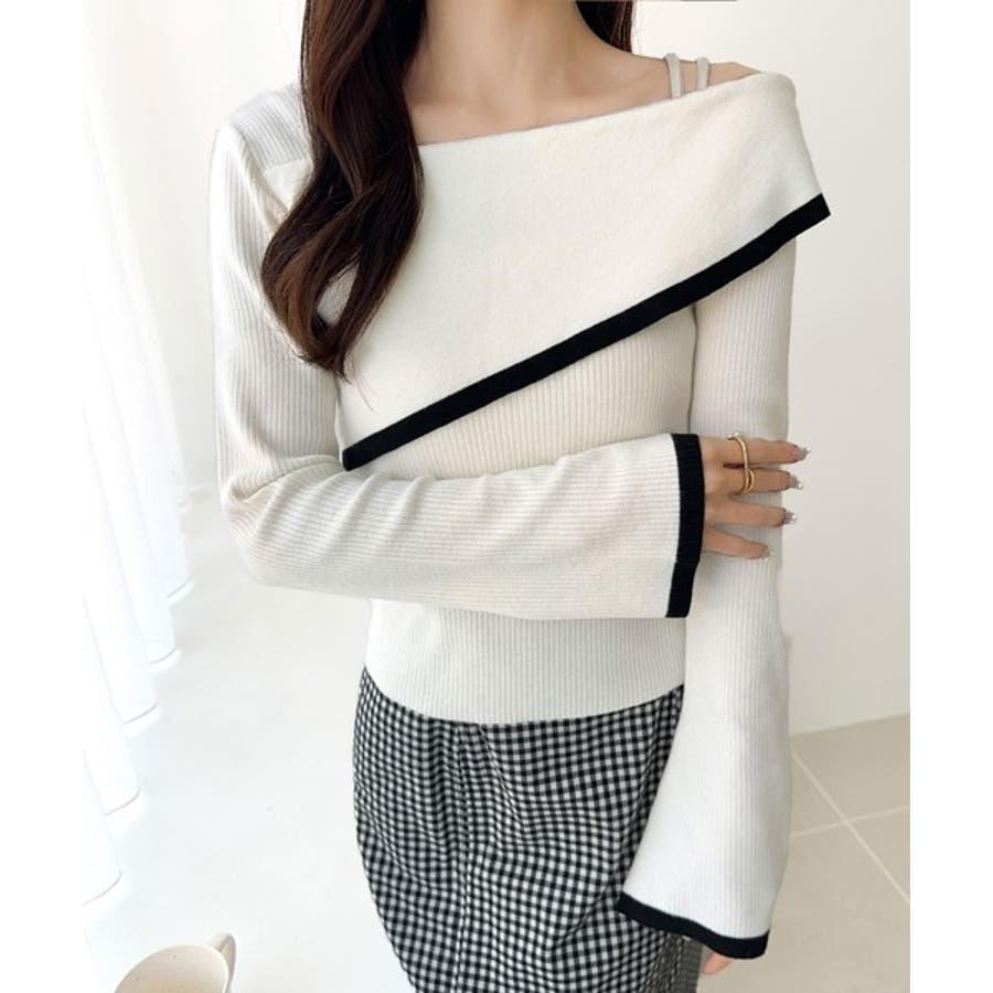 【アイボリー×ブラック】トレンド美スタイル。2WAYアシンメトリーオフショルダーリブニット