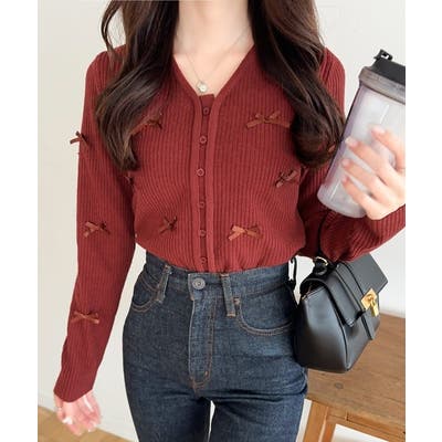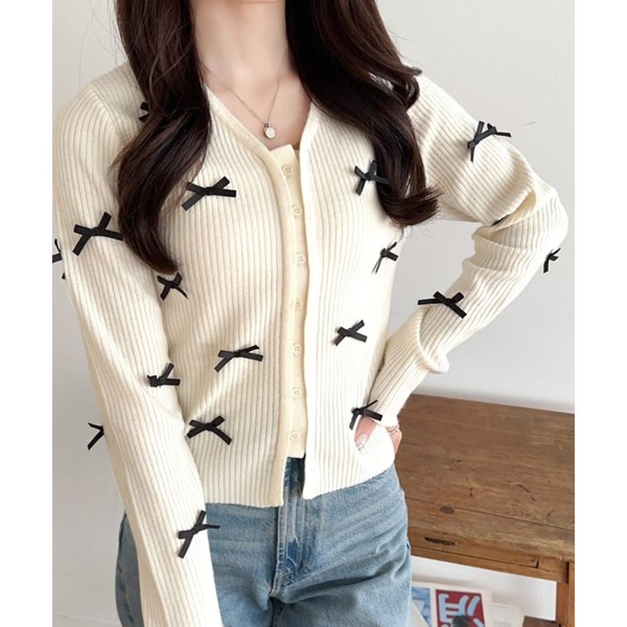 きれいめな雰囲気のリブニットに立体的なミニリボンをふんだんにあしらったトップス。