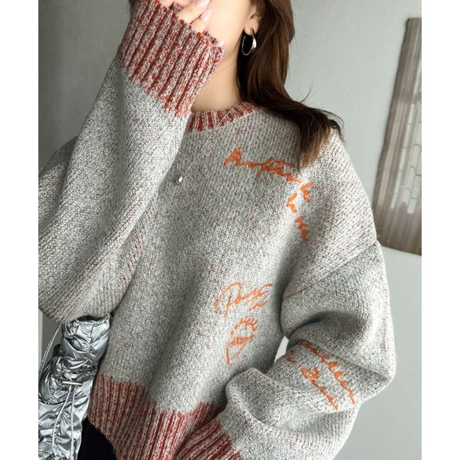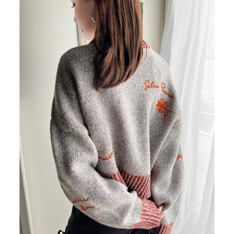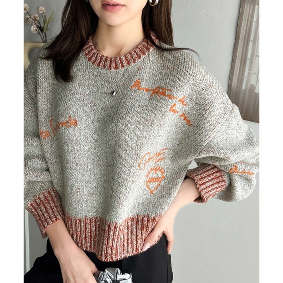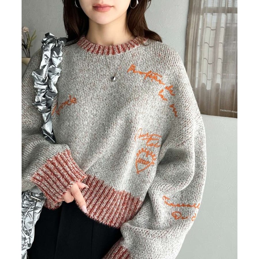 コントラストカラーのロゴ刺繍をランダムに散りばめたニットプルオーバー。