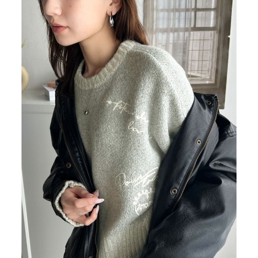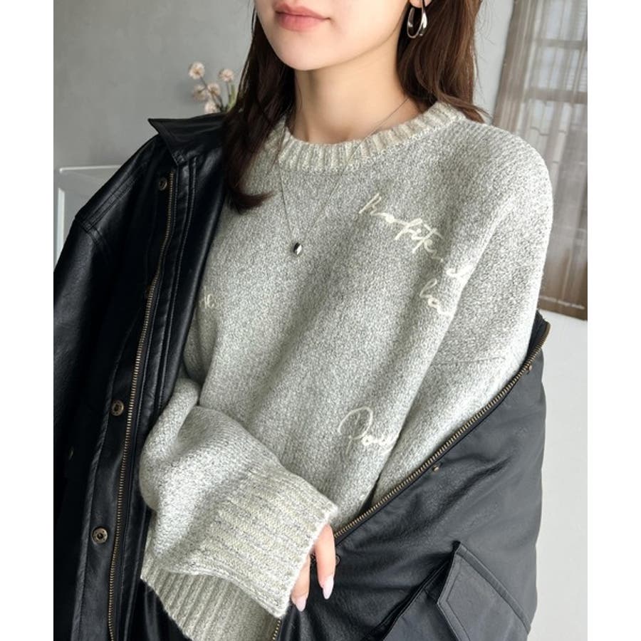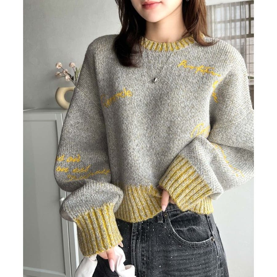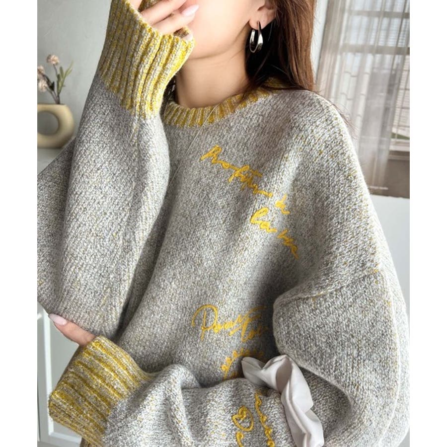 コントラストカラーのロゴ刺繍をランダムに散りばめたニットプルオーバー。