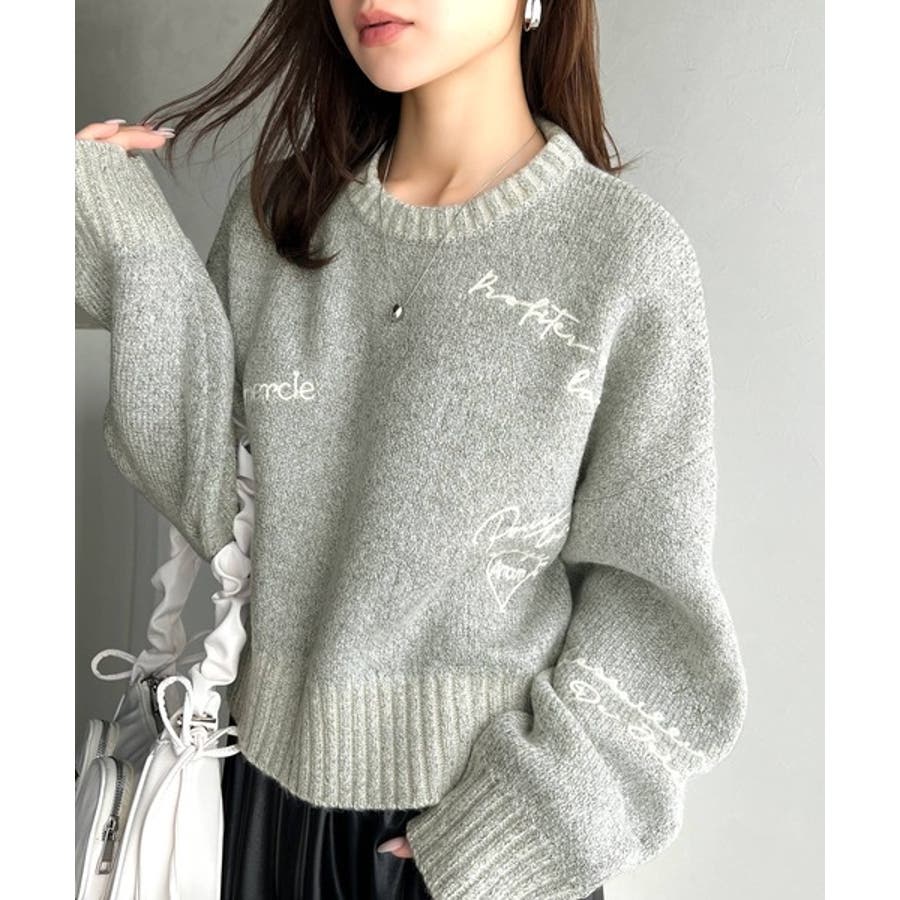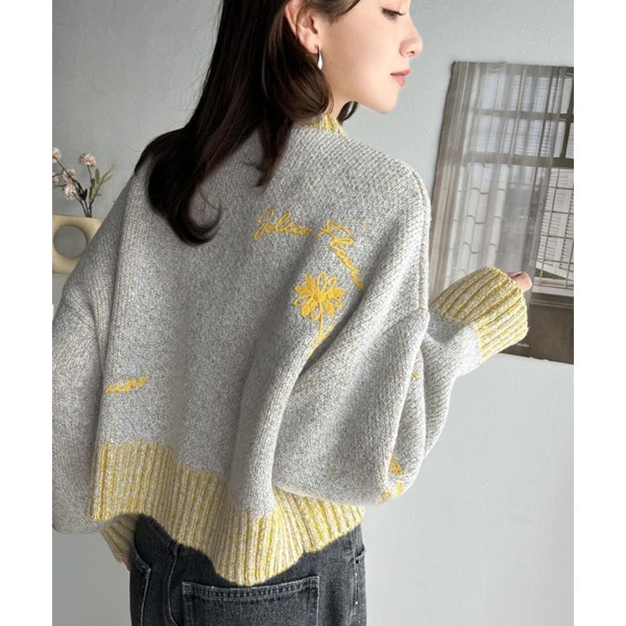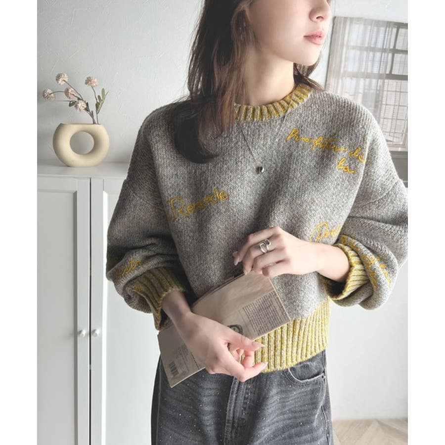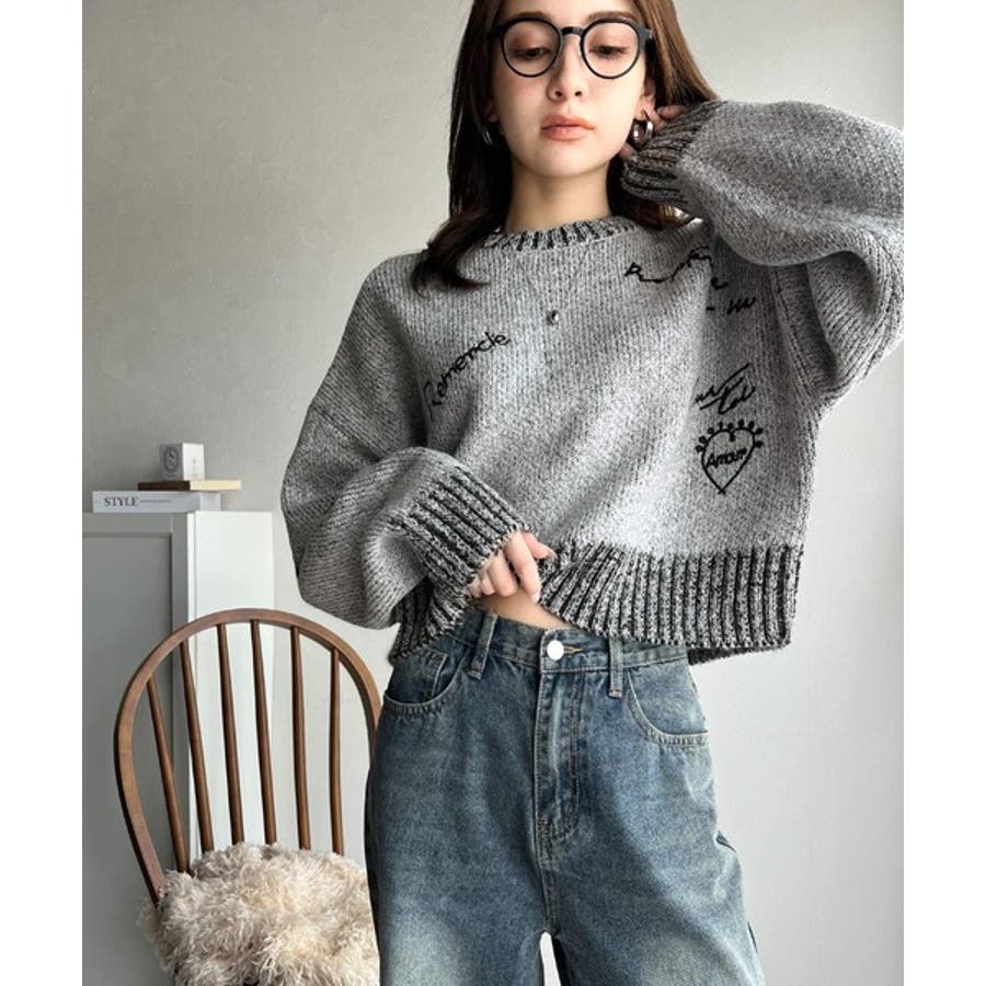 大人の個性派ニット。ランダム刺繍クロップドニットプルオーバー