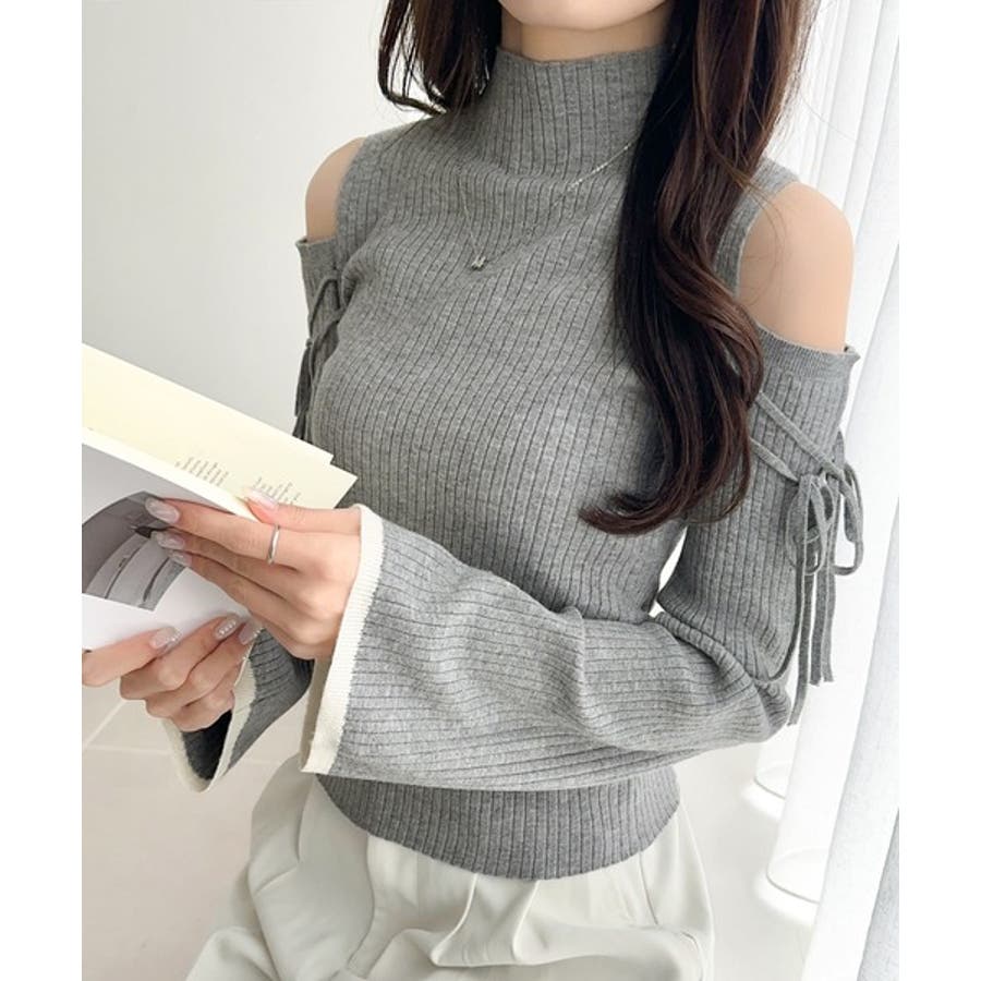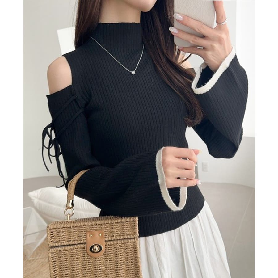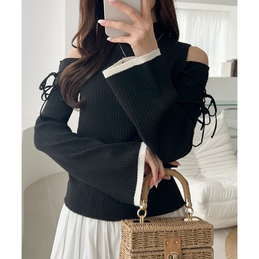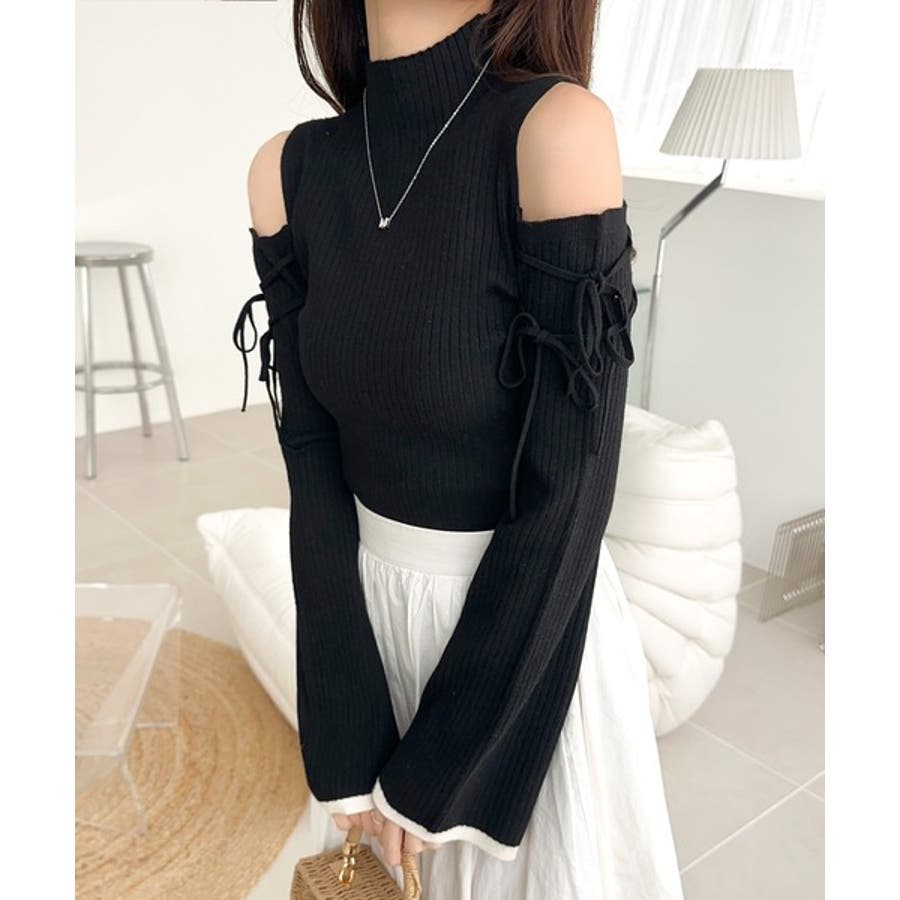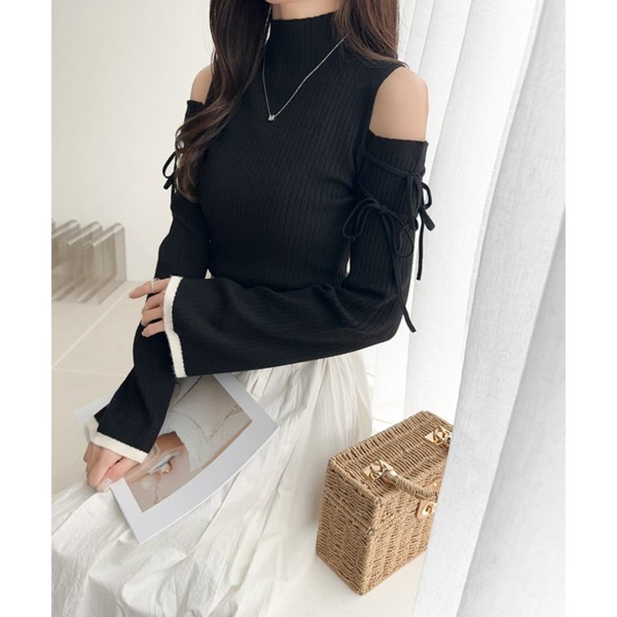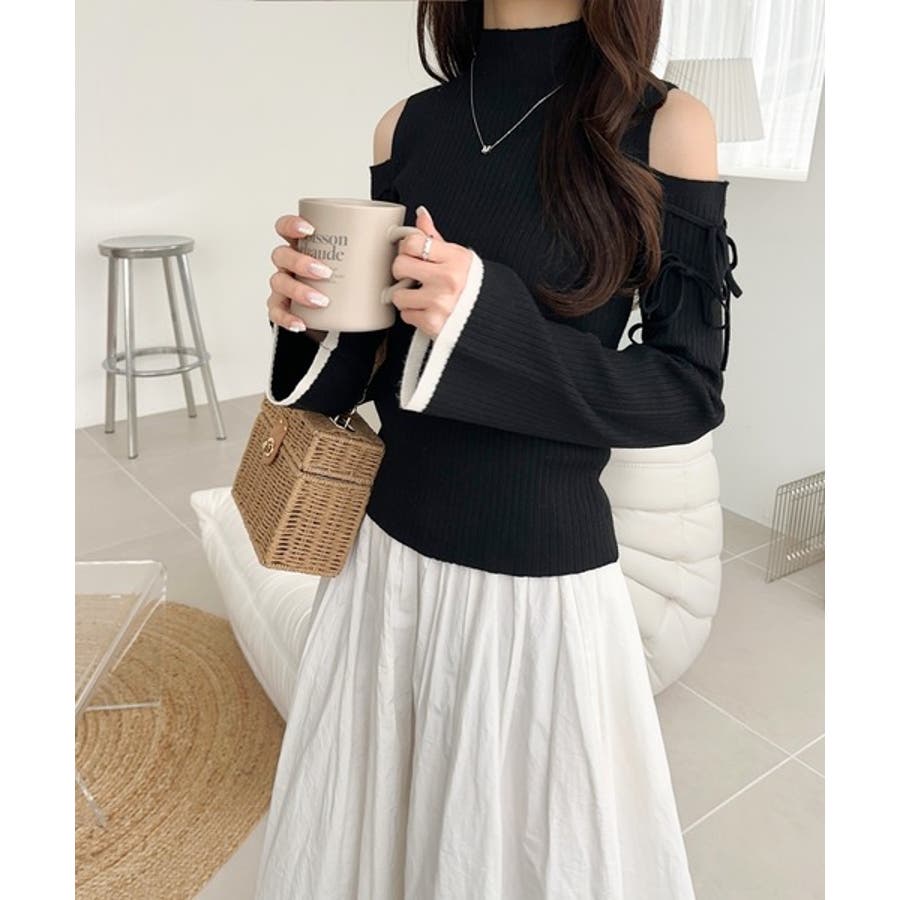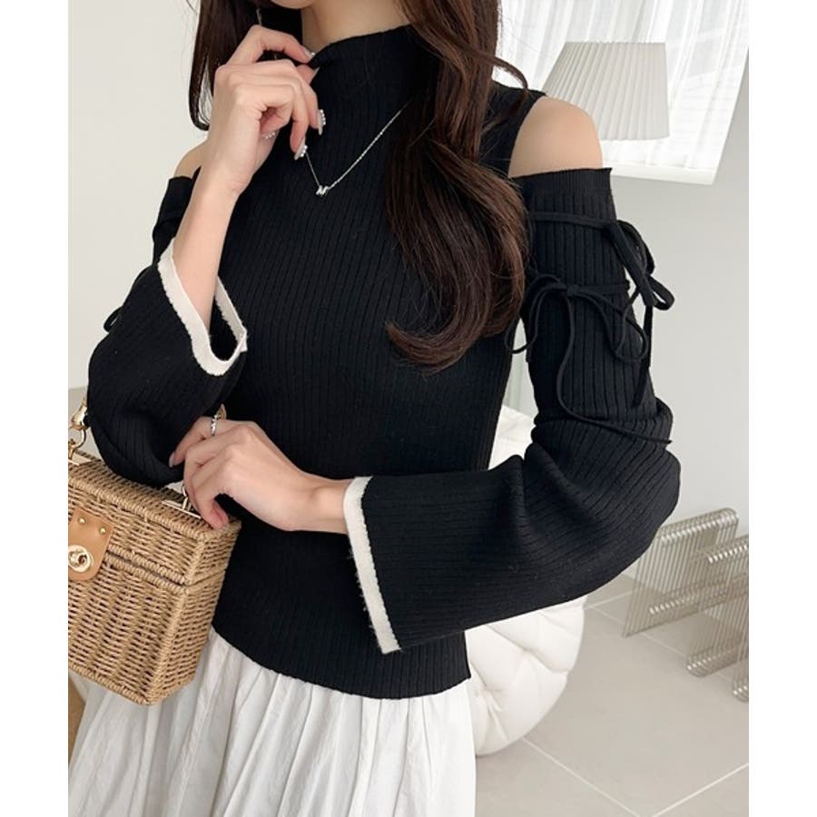 リボンが愛らしい。肩リボンハイネック裾配色袖フレアリブニット