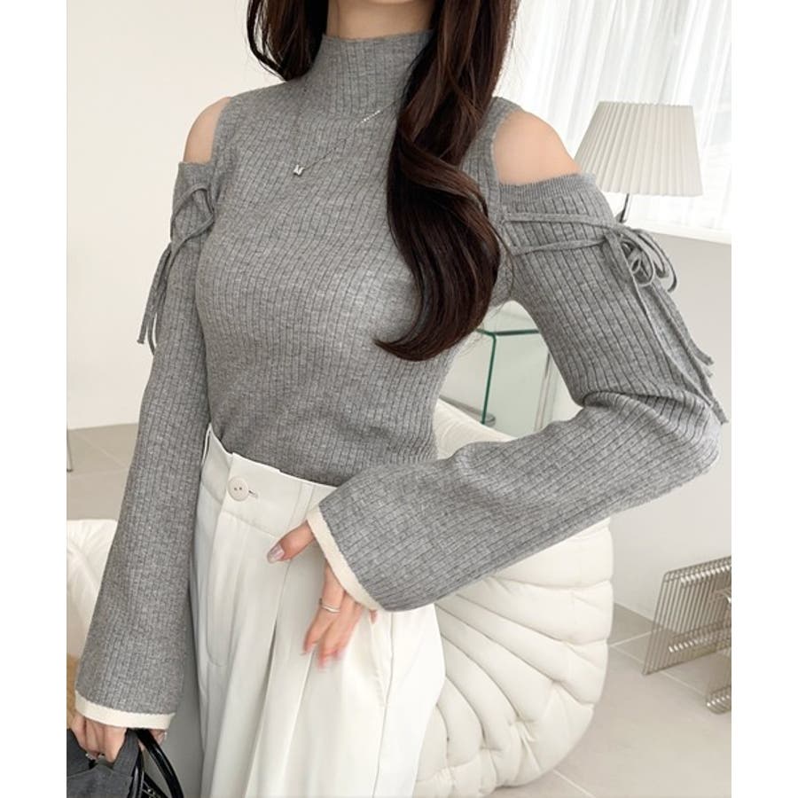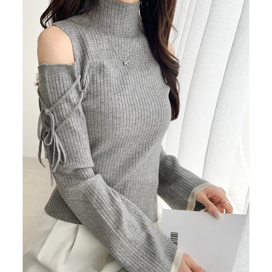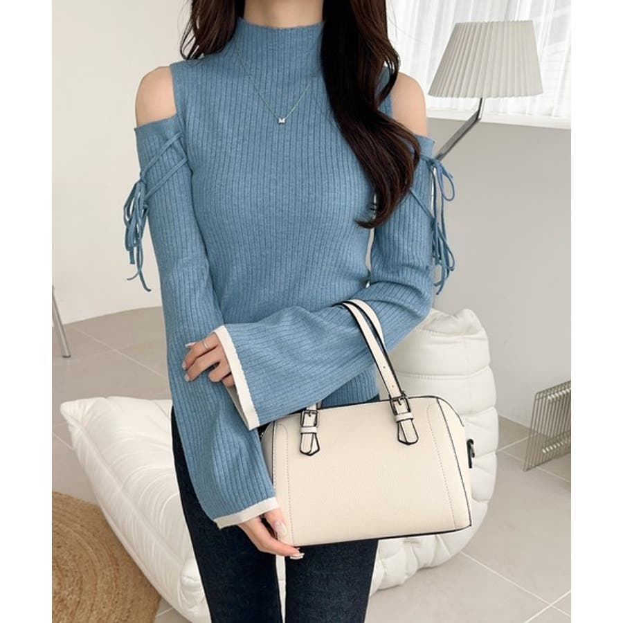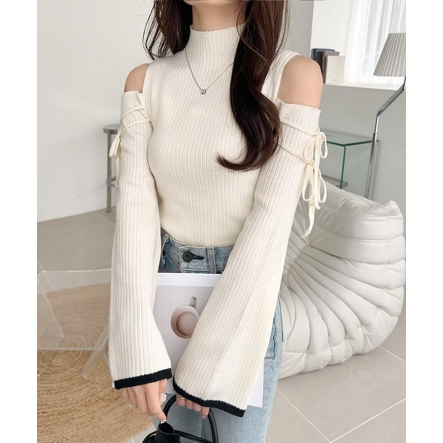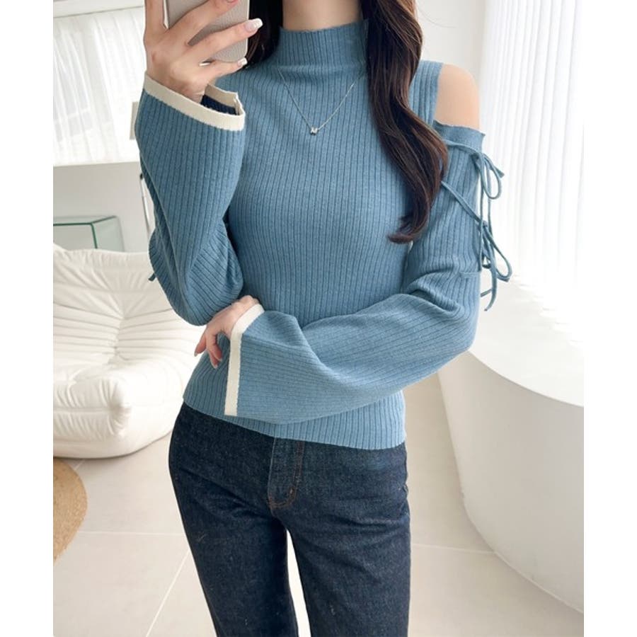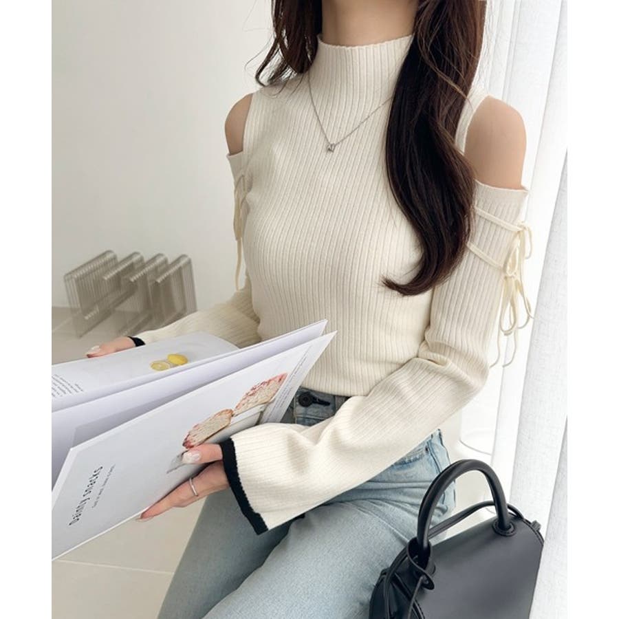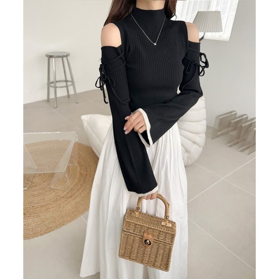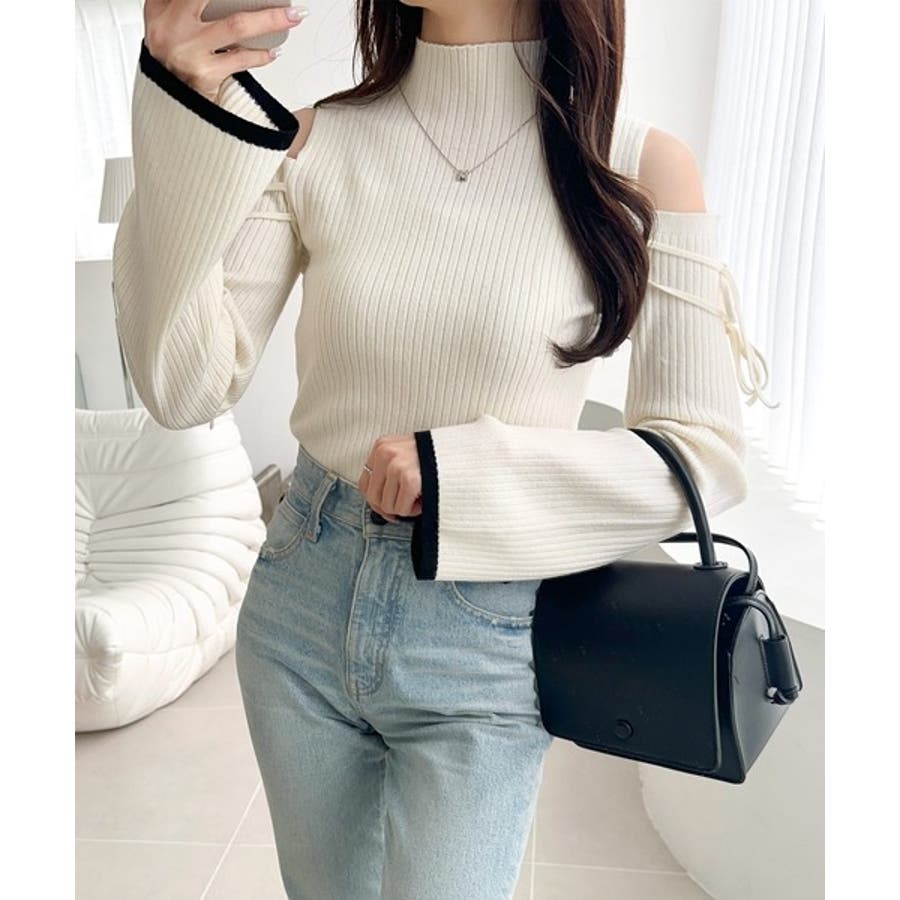 リボンが愛らしい。肩リボンハイネック裾配色袖フレアリブニット