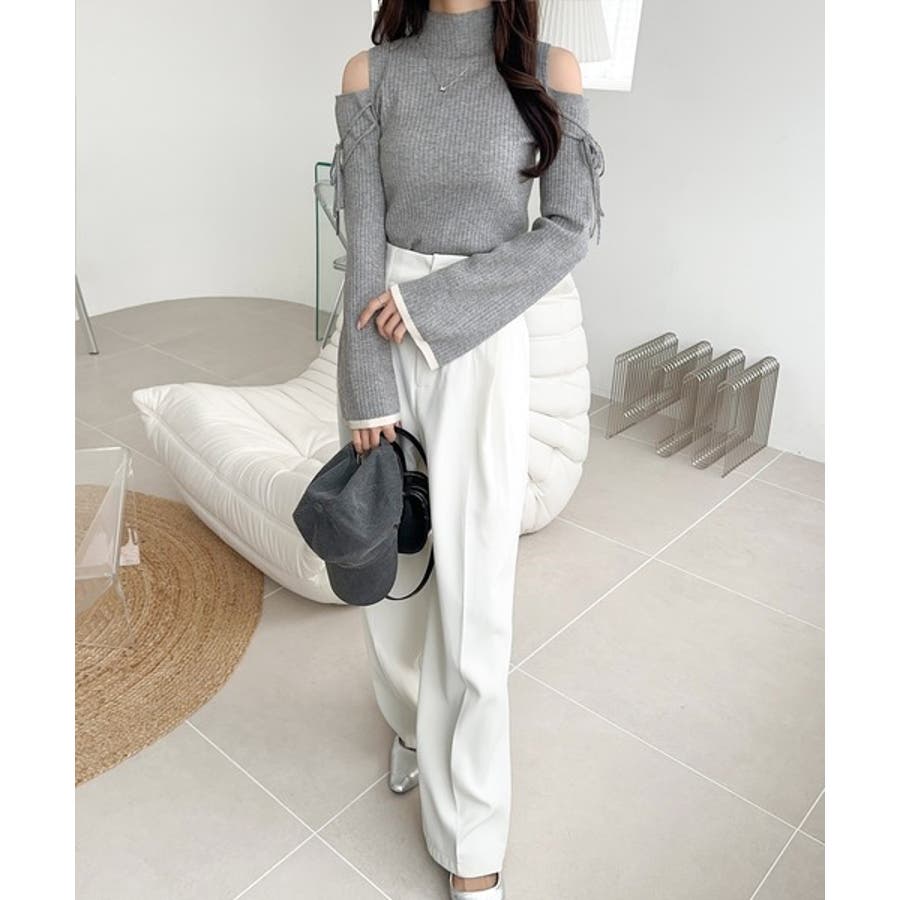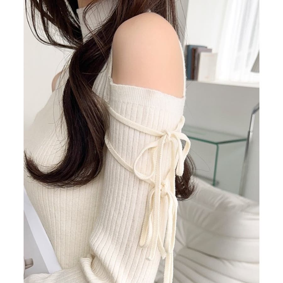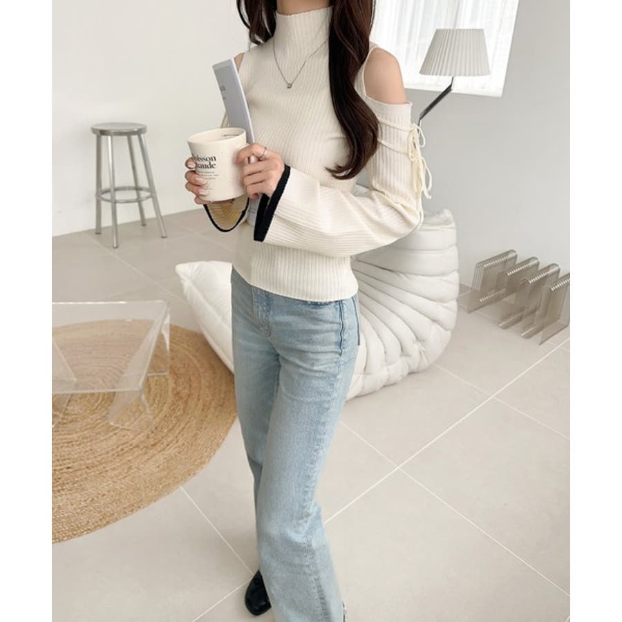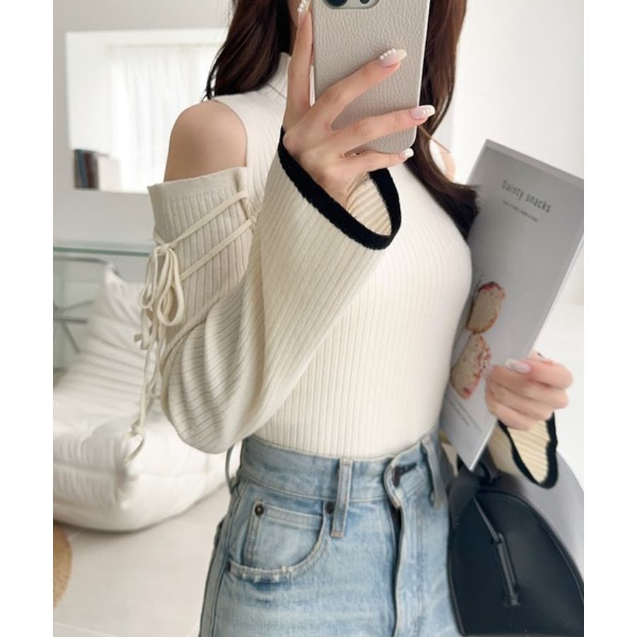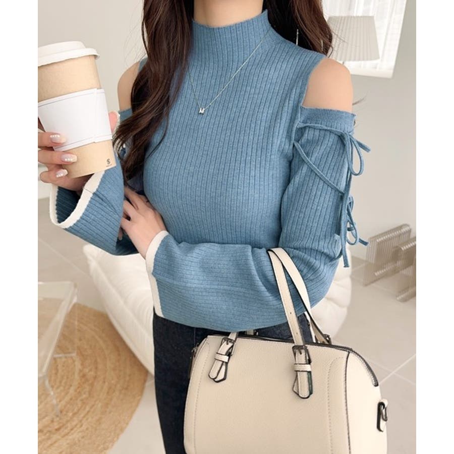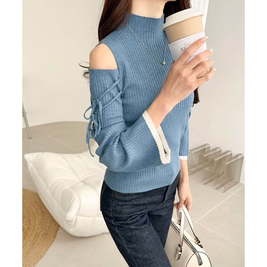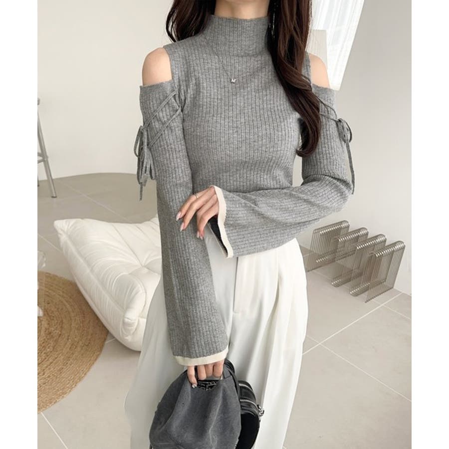 リボンが愛らしい。肩リボンハイネック裾配色袖フレアリブニット