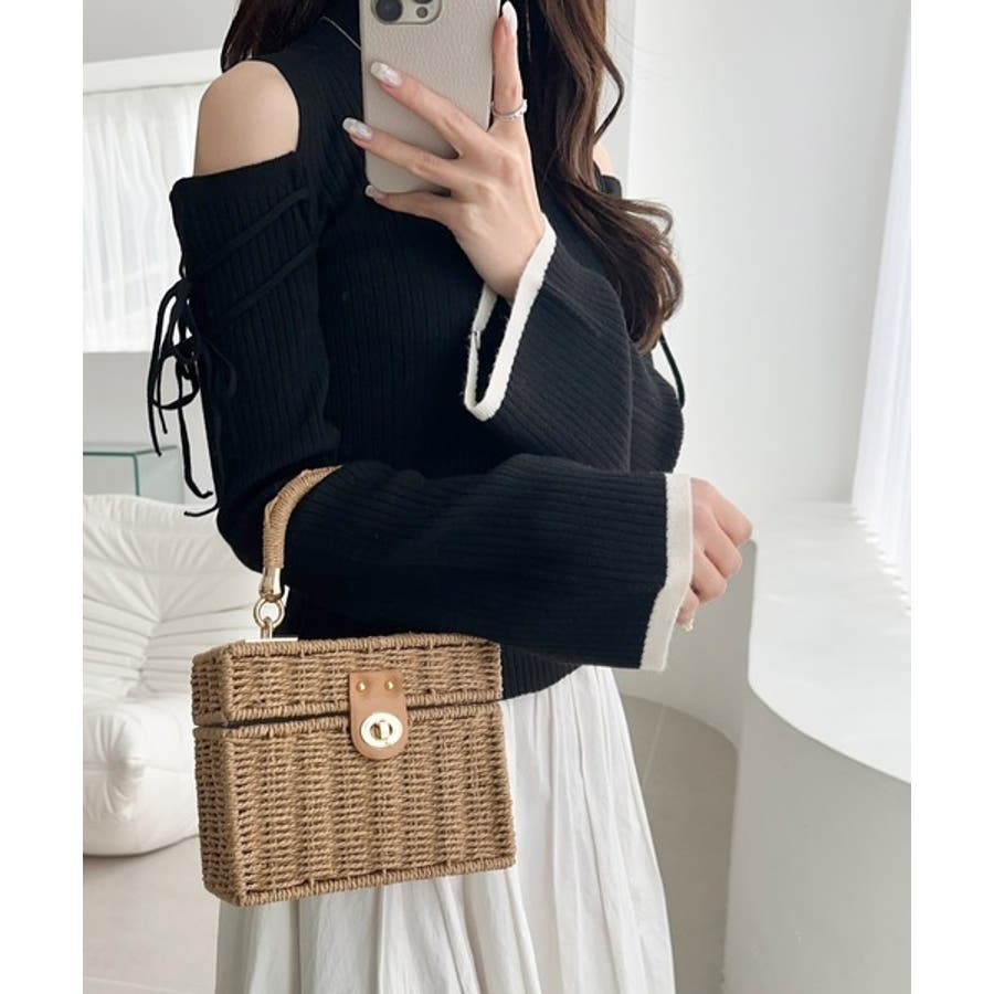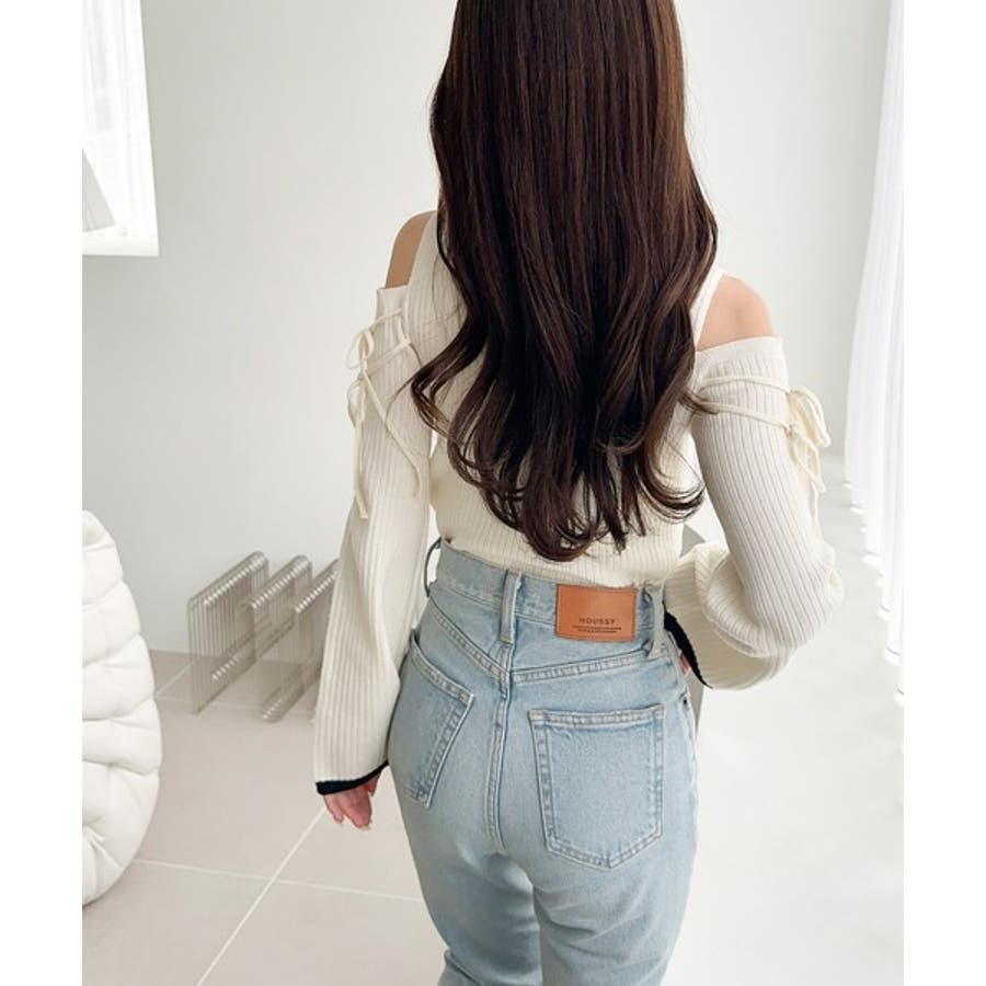 ダブルリボンと裾のさりげない配色がポイントのリブニット。