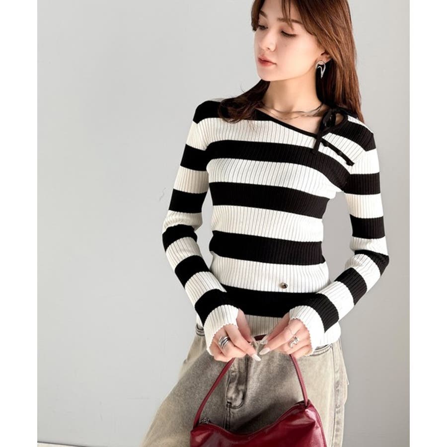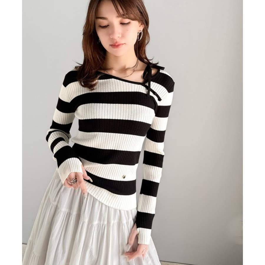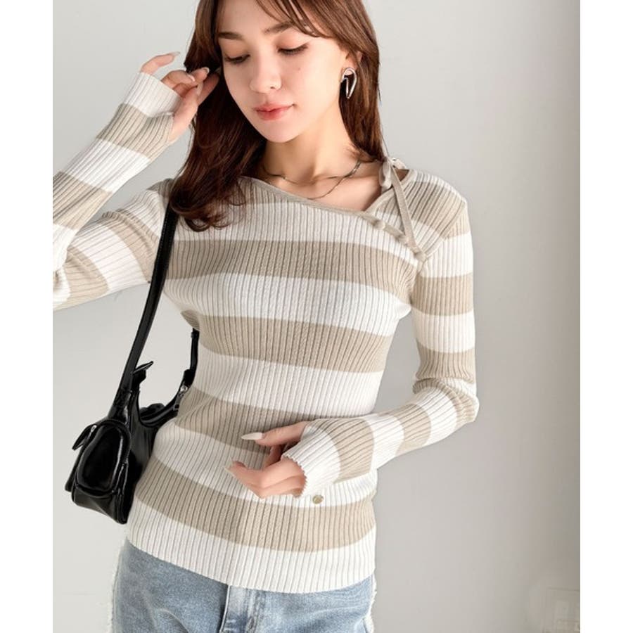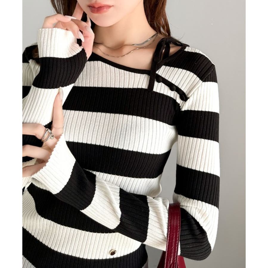 【mily bilet】春夏の新定番!くるみボタンアシンメトリーネックボーダーリ…