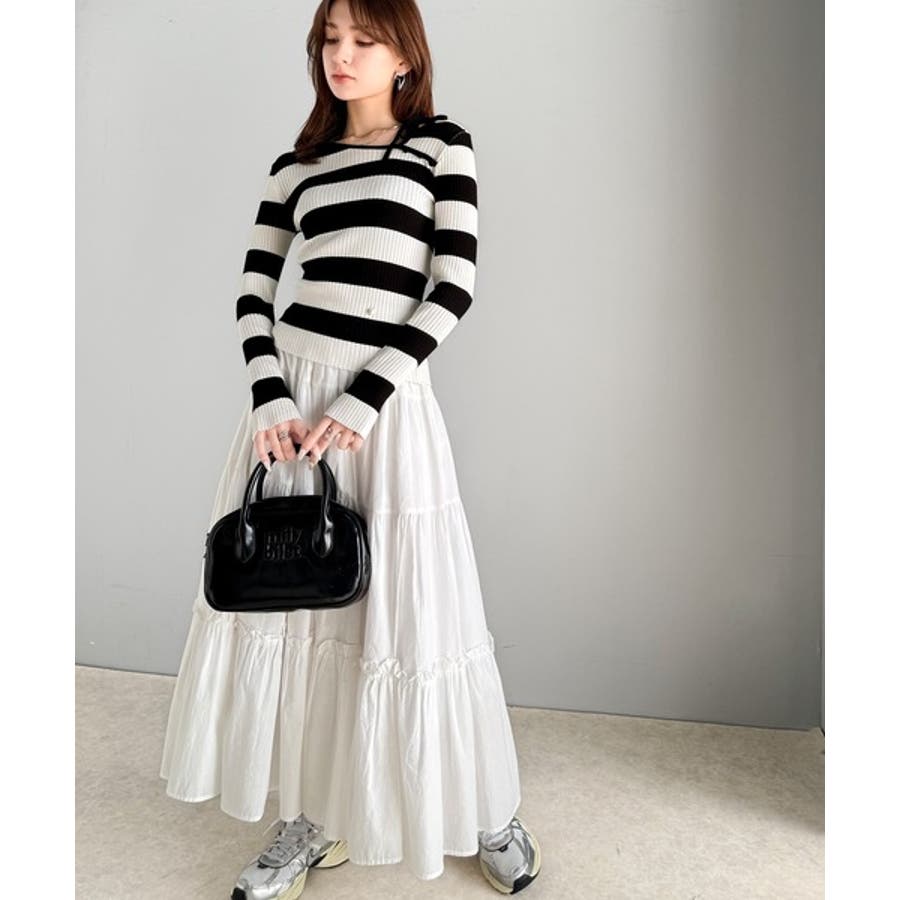 ボトムにスカートを選ぶと、フェミニンな印象がさらに高まります◎