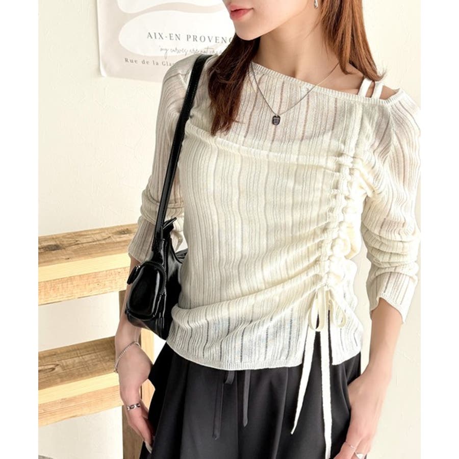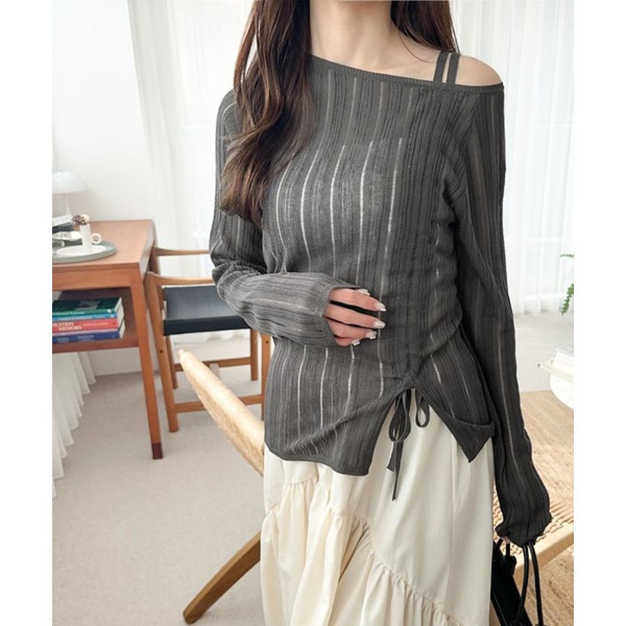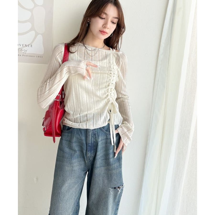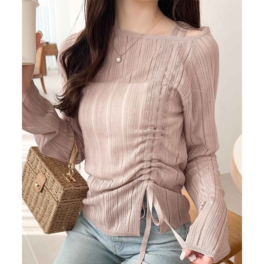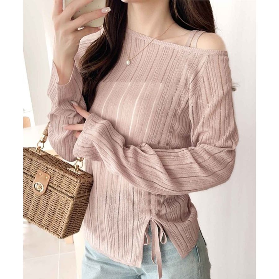 可愛さ倍増!ドロストリボンシアー長袖オフショルリブニット