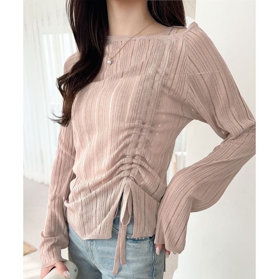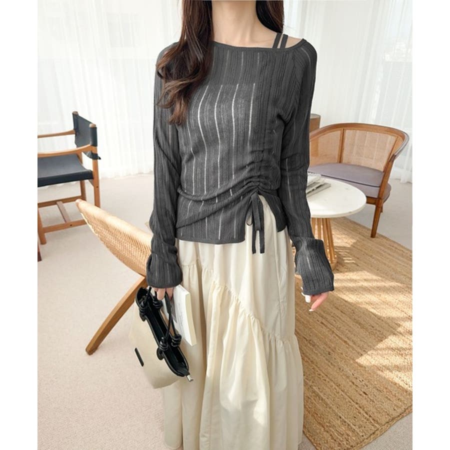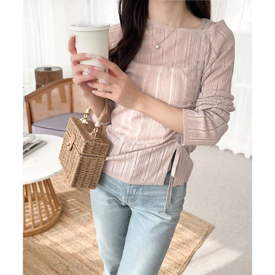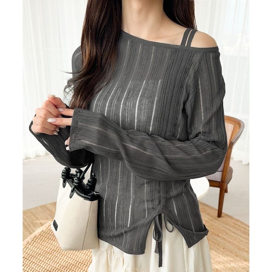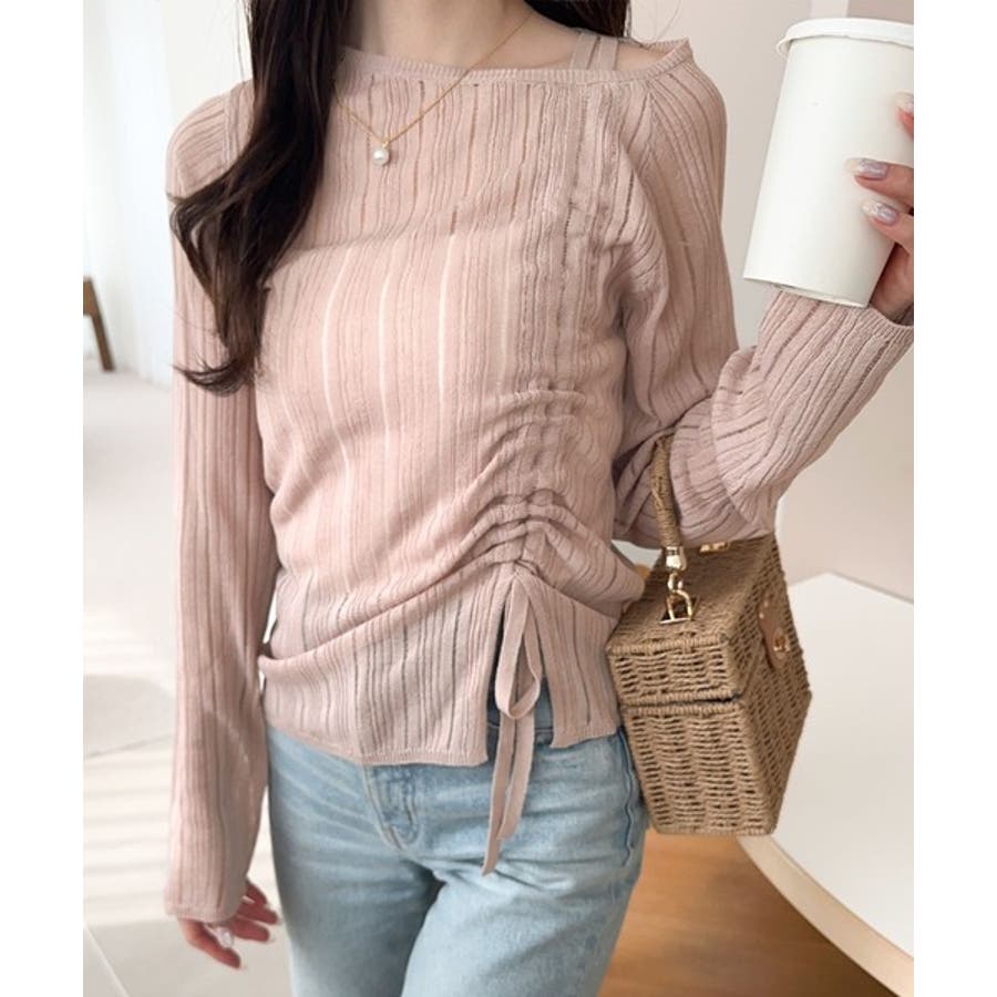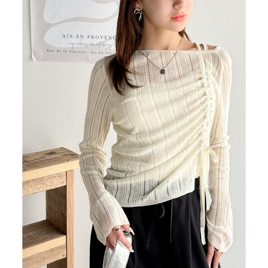 可愛さ倍増!ドロストリボンシアー長袖オフショルリブニット