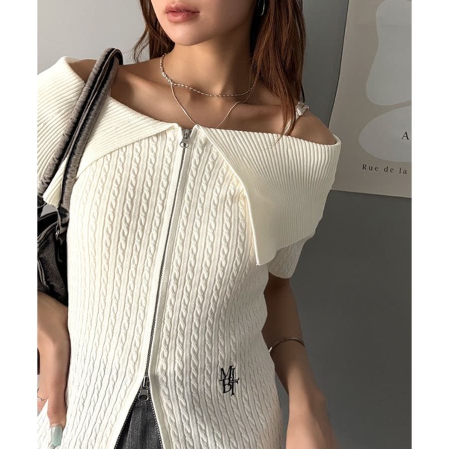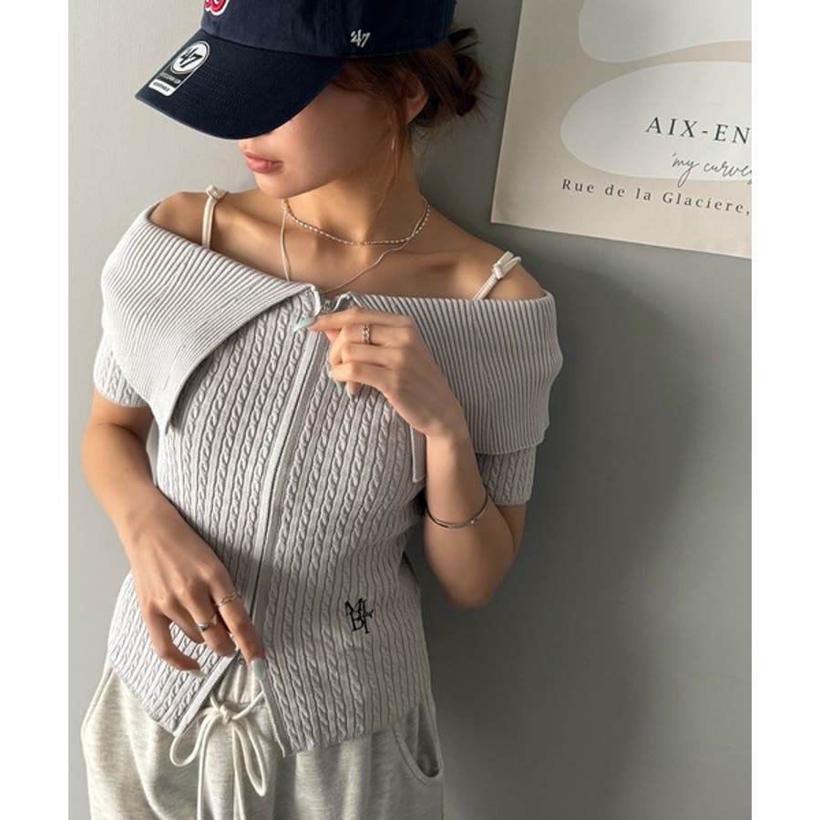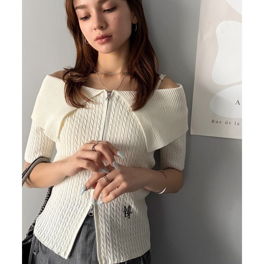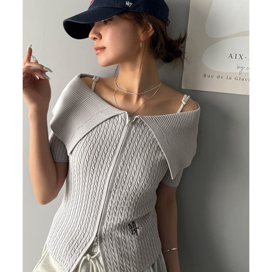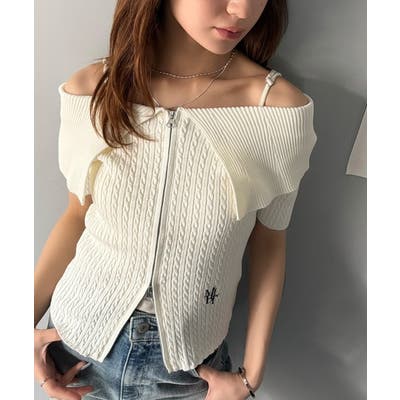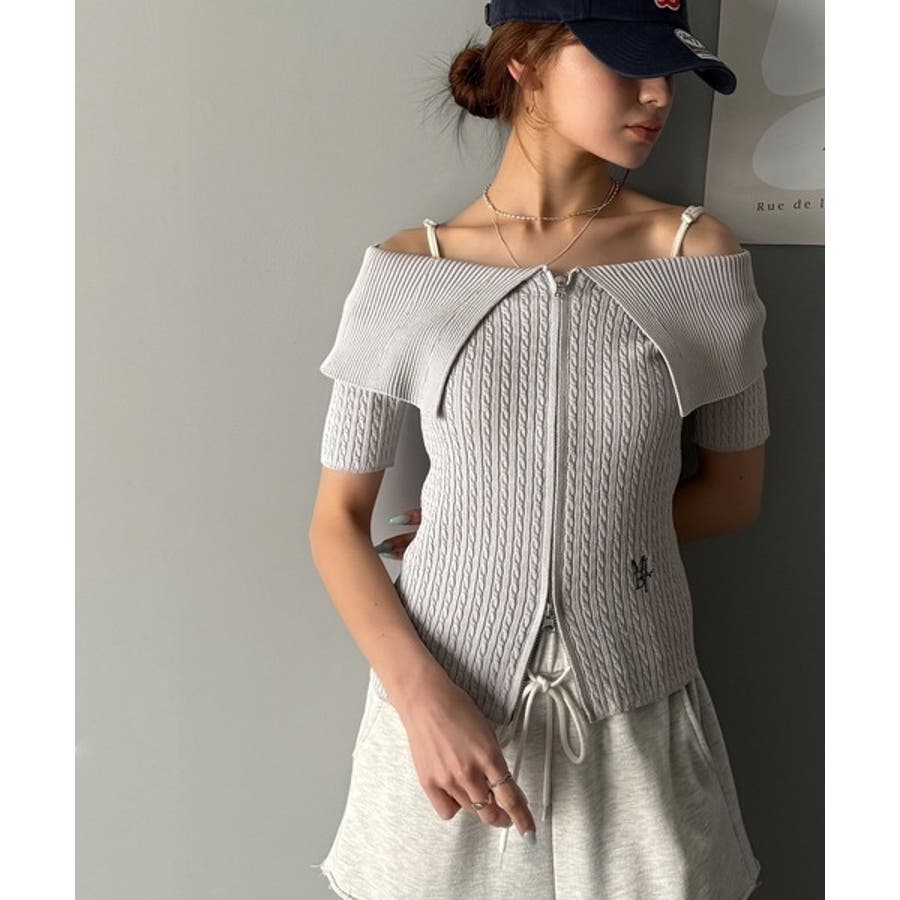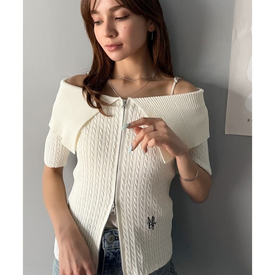 抜け感レディースタイル。ロゴ刺繍オフショル2WAYダブルジップケーブル柄サマーニ…