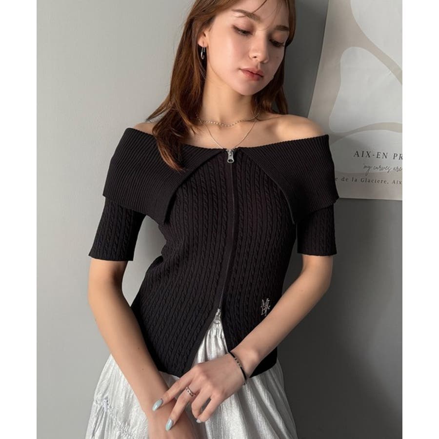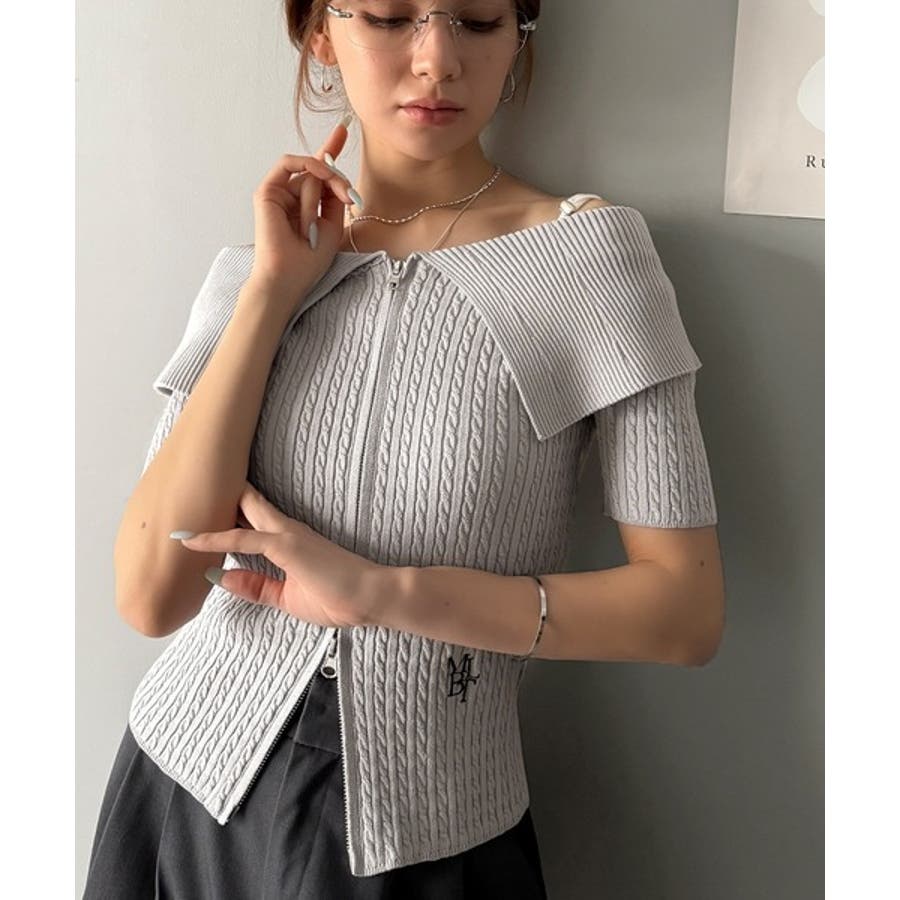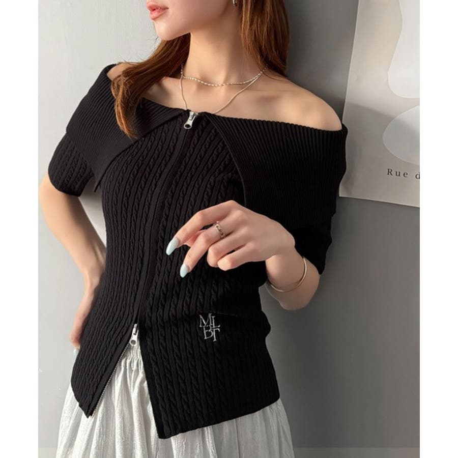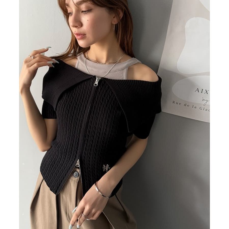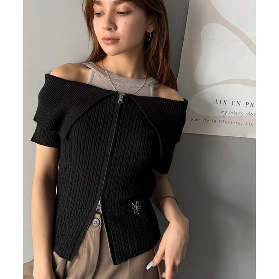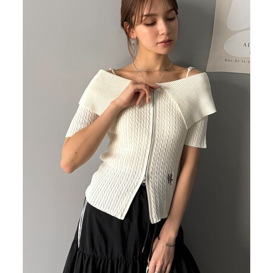 抜け感レディースタイル。ロゴ刺繍オフショル2WAYダブルジップケーブル柄サマーニ…
