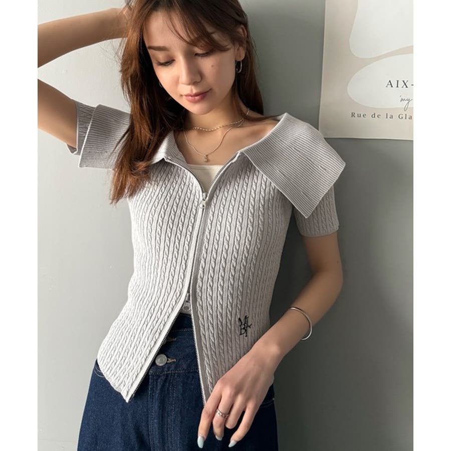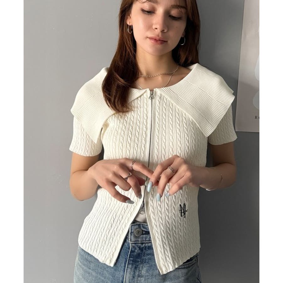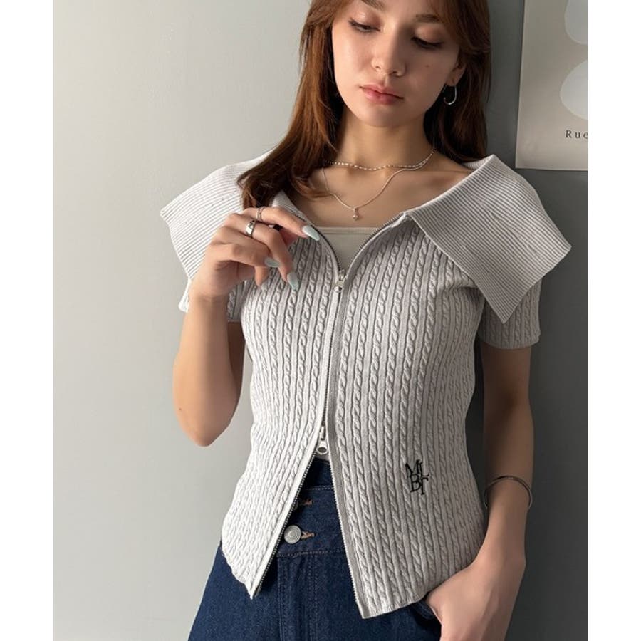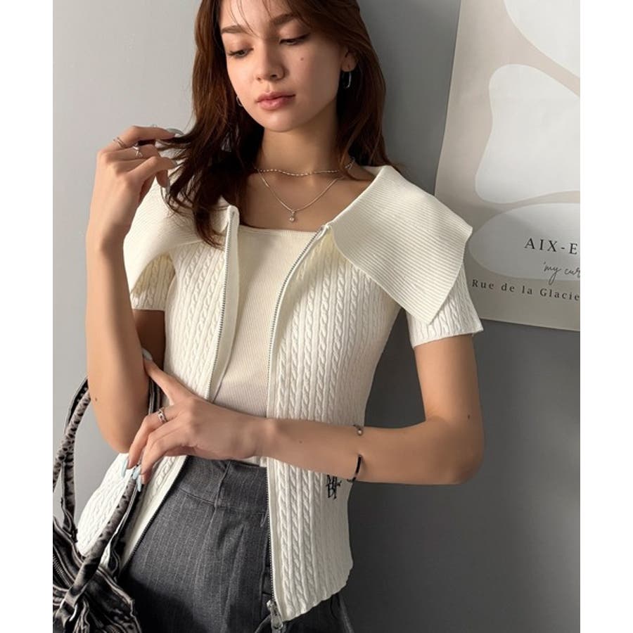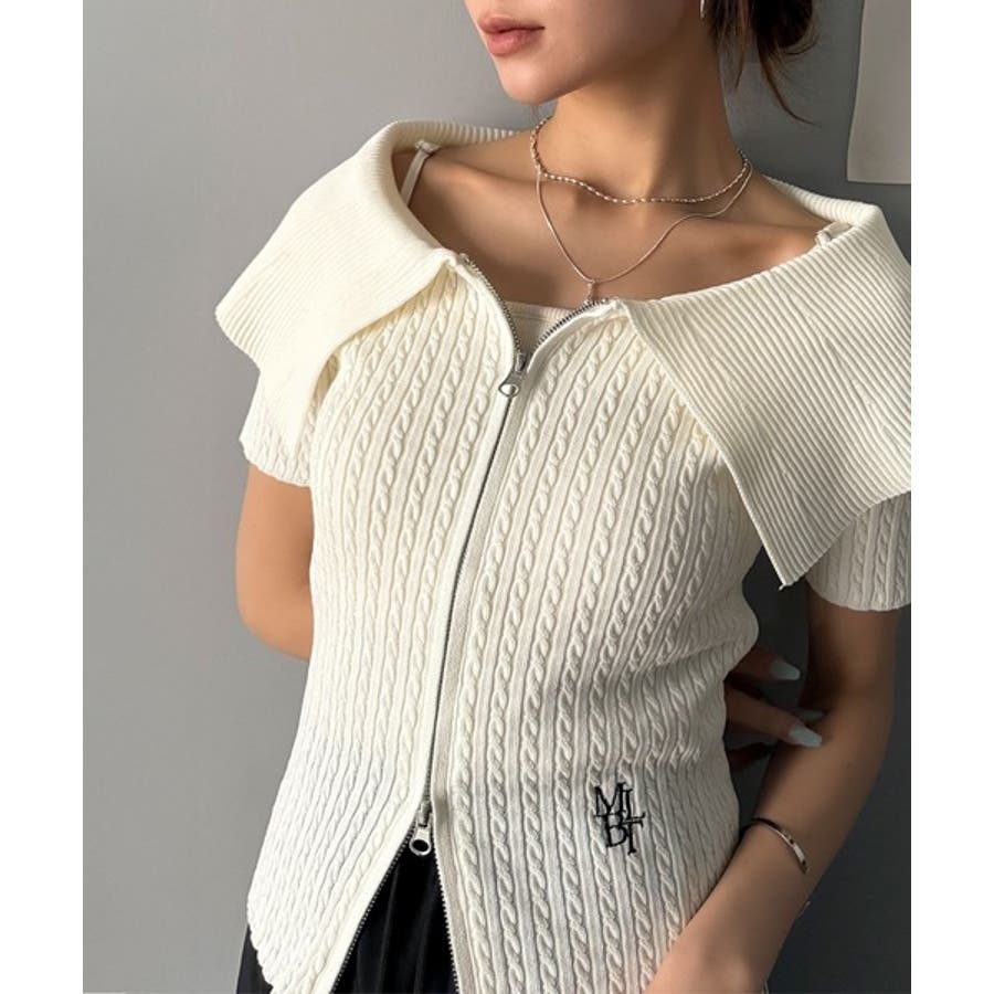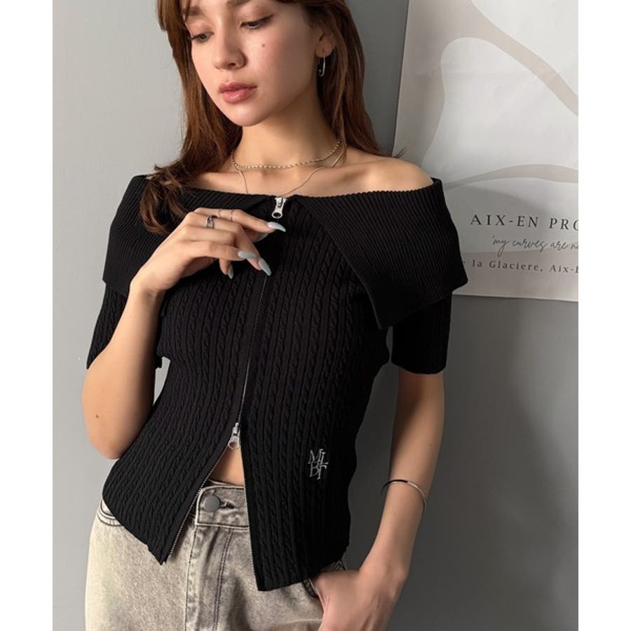 抜け感レディースタイル。ロゴ刺繍オフショル2WAYダブルジップケーブル柄サマーニ…