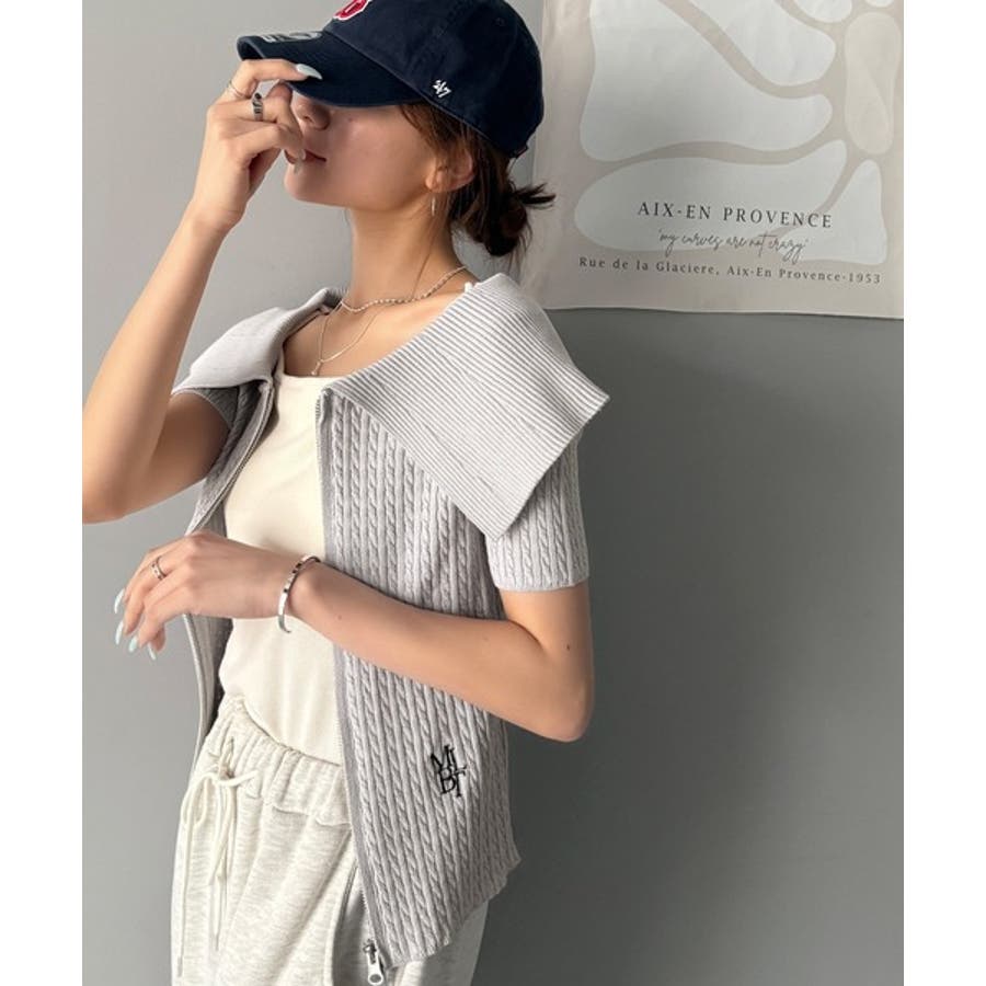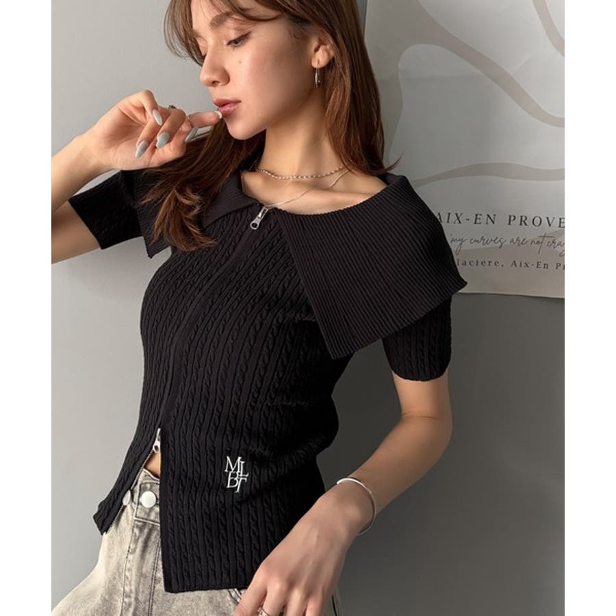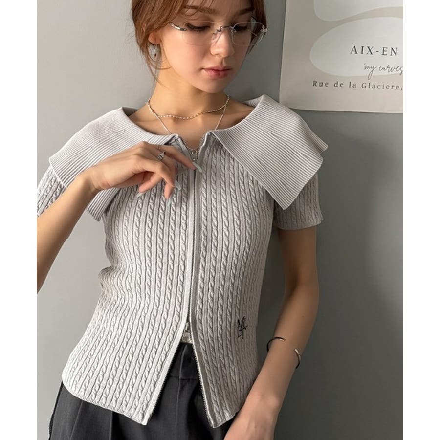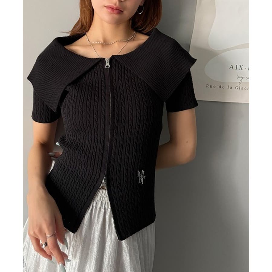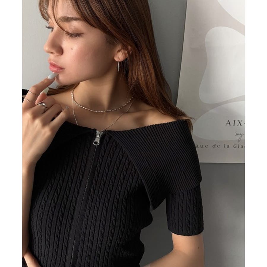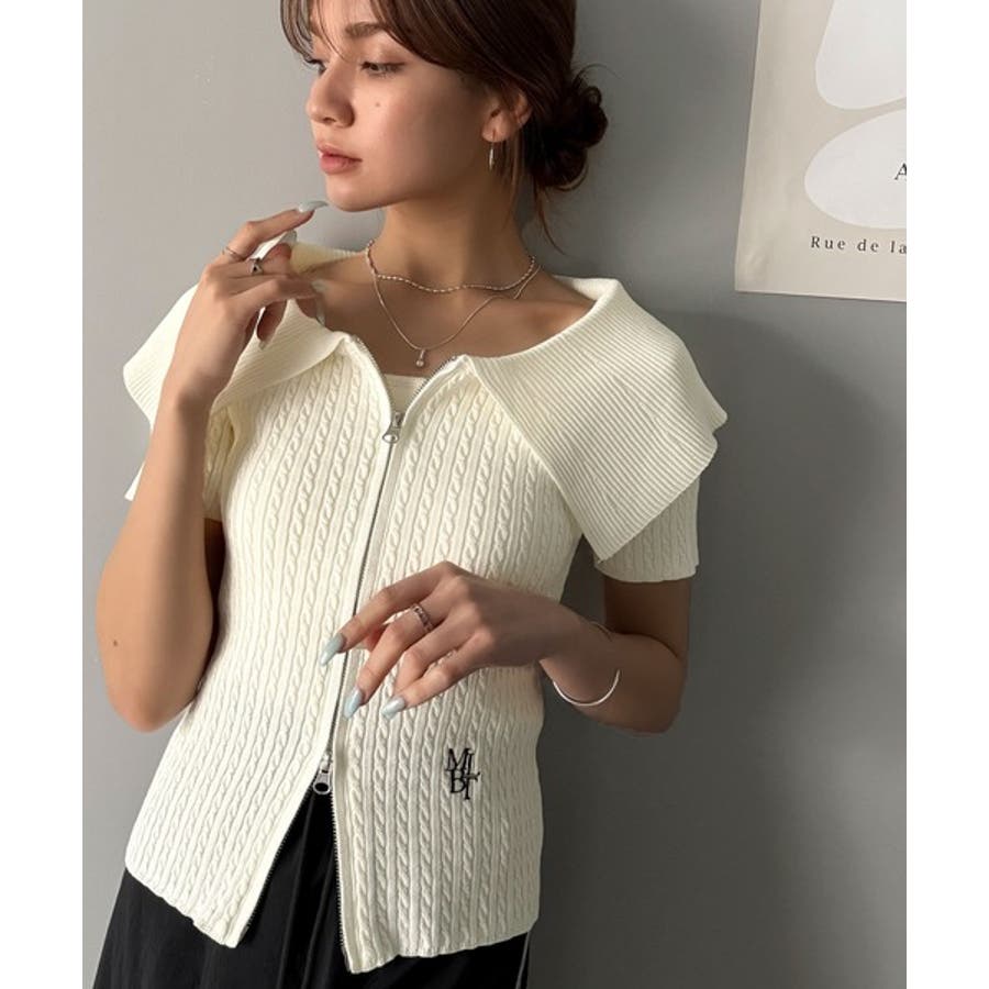抜け感レディースタイル。ロゴ刺繍オフショル2WAYダブルジップケーブル柄サマーニ…