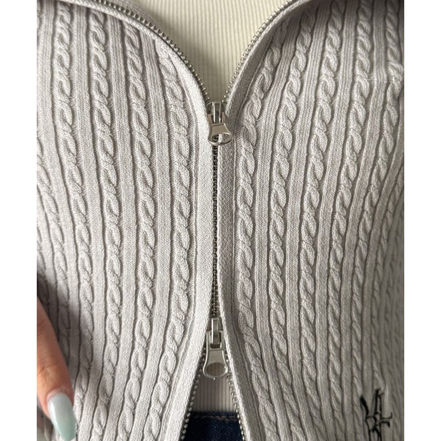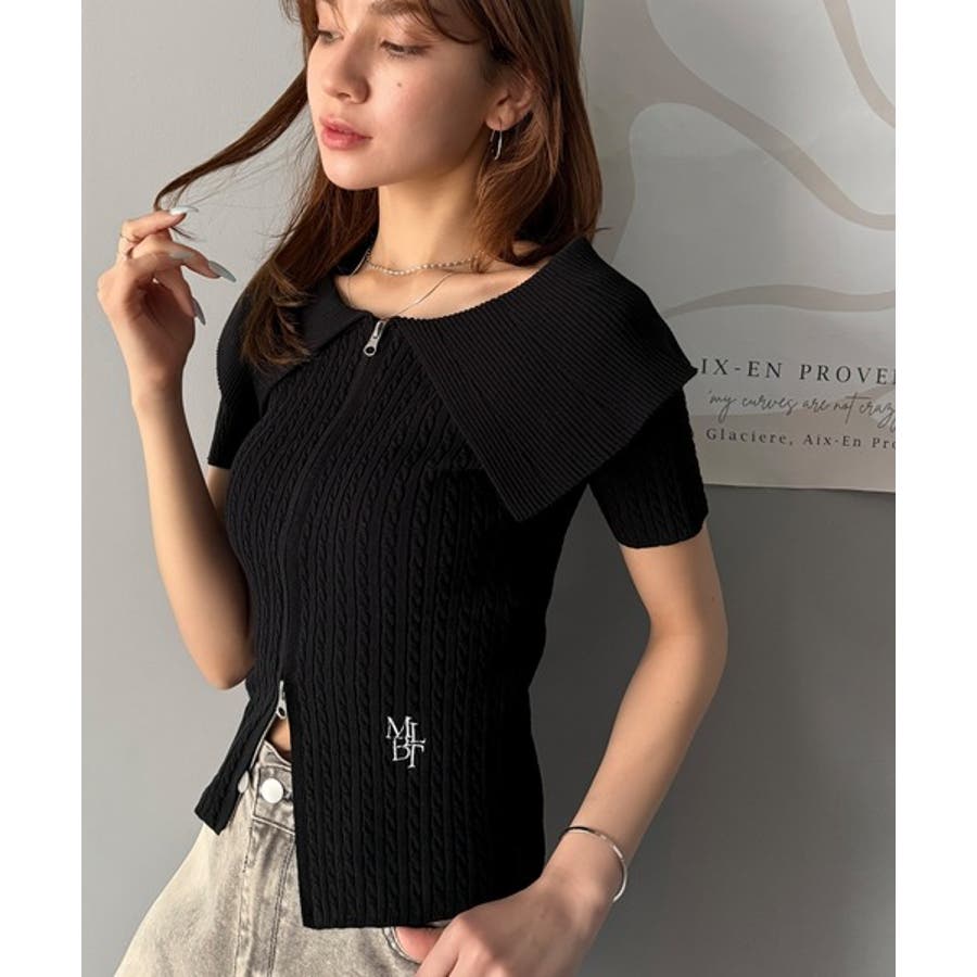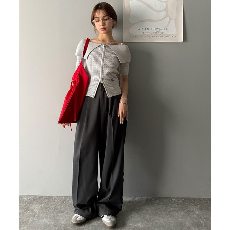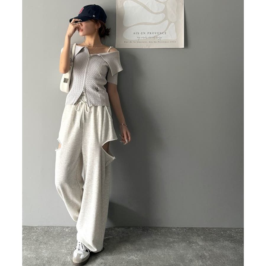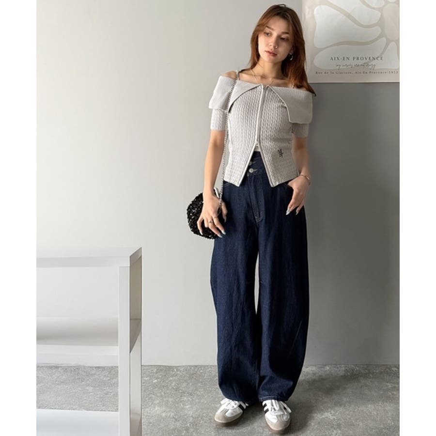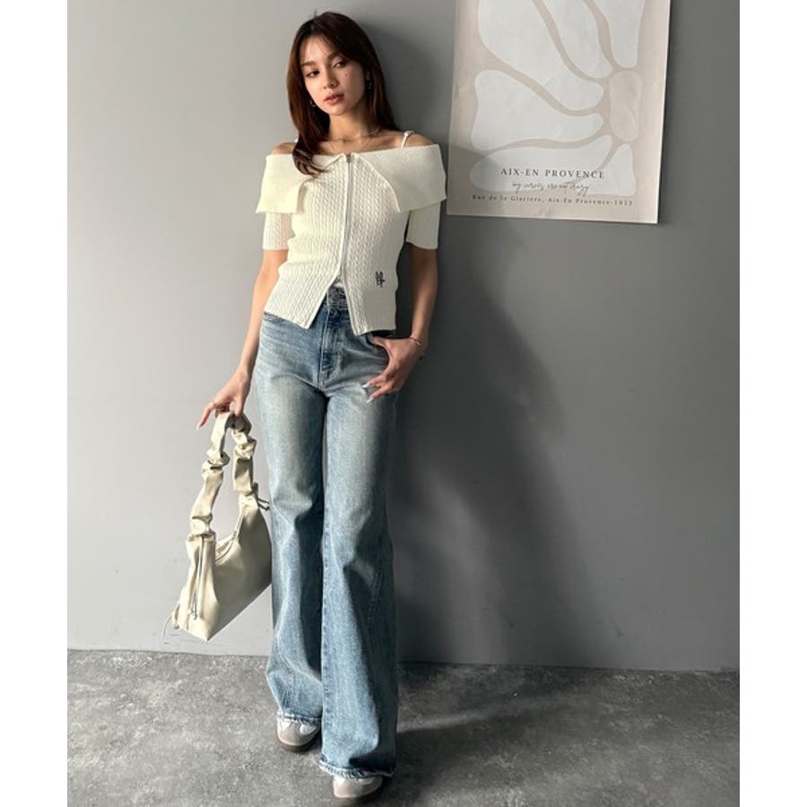 抜け感レディースタイル。ロゴ刺繍オフショル2WAYダブルジップケーブル柄サマーニ…