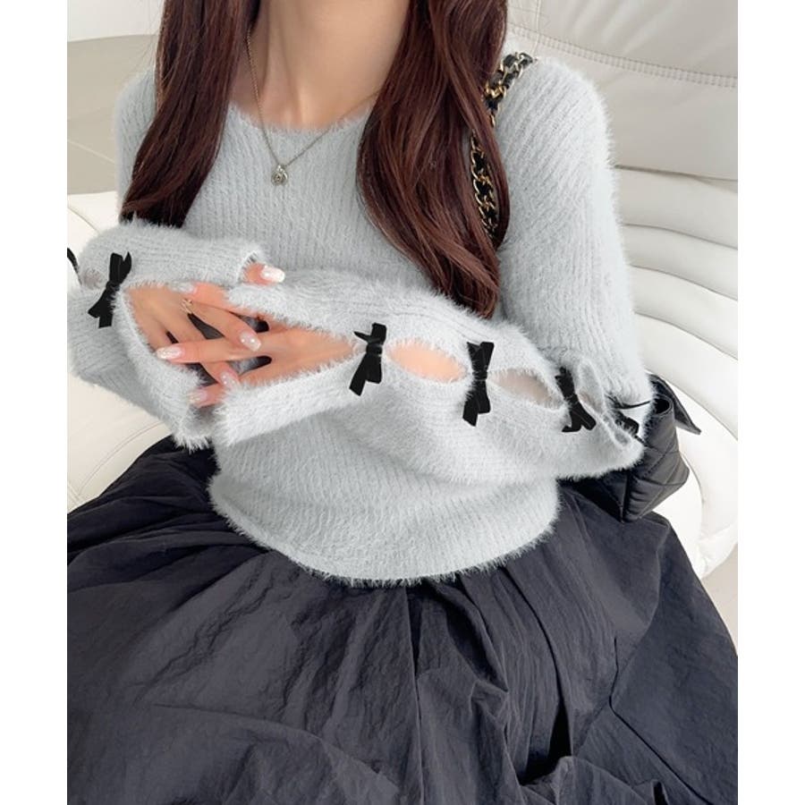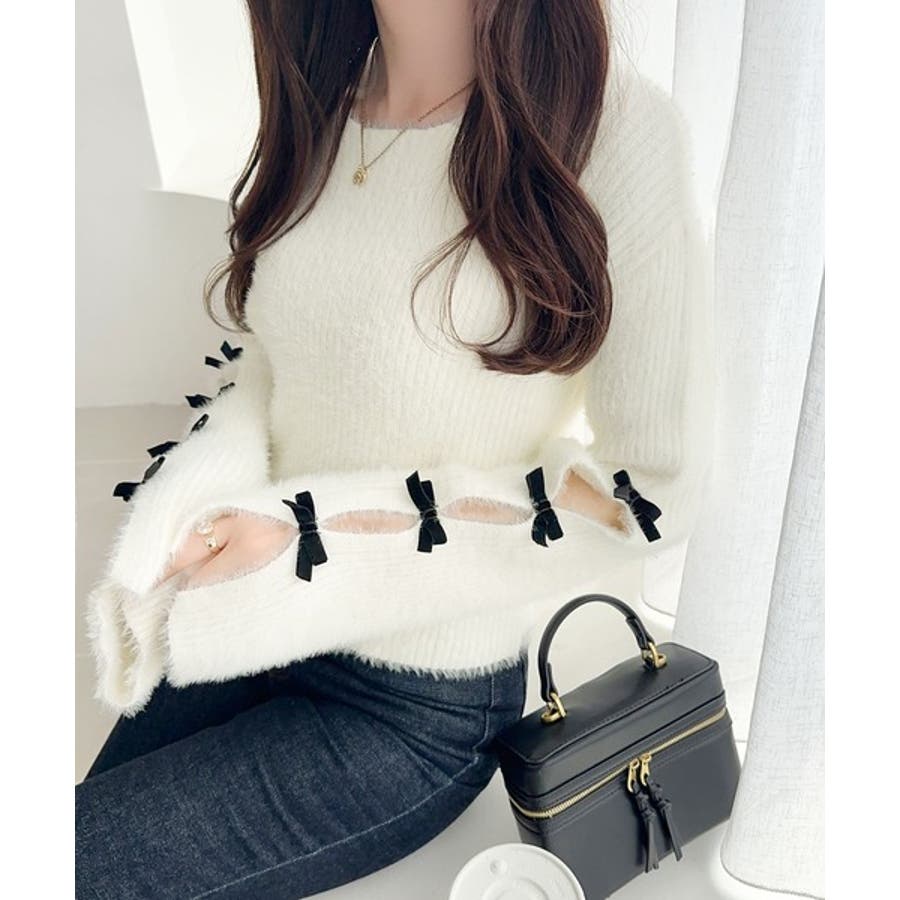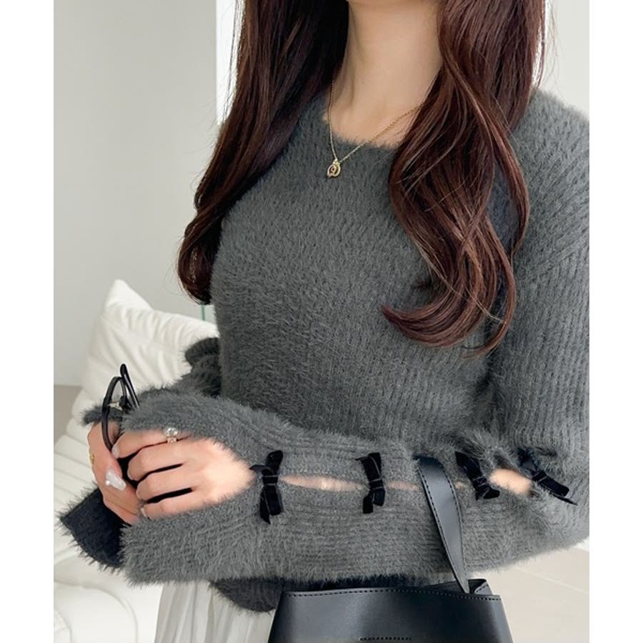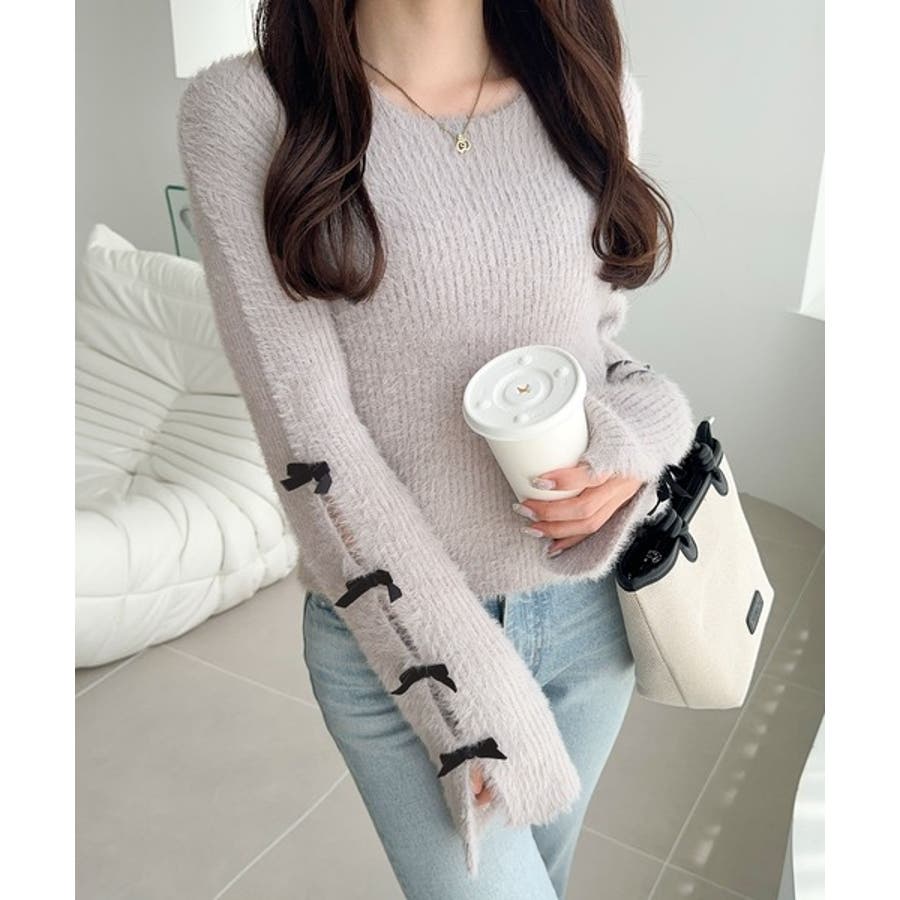 袖にあしらったベロアリボンがかわいい!肌触り抜群のフェザーシャギーリブニット。
