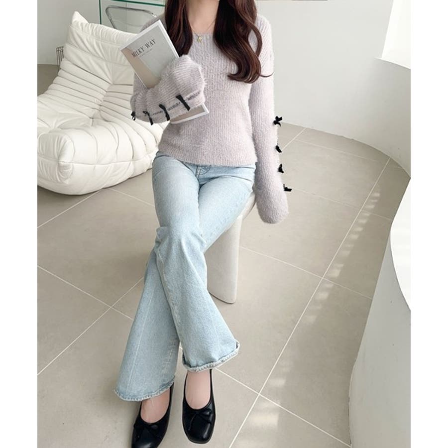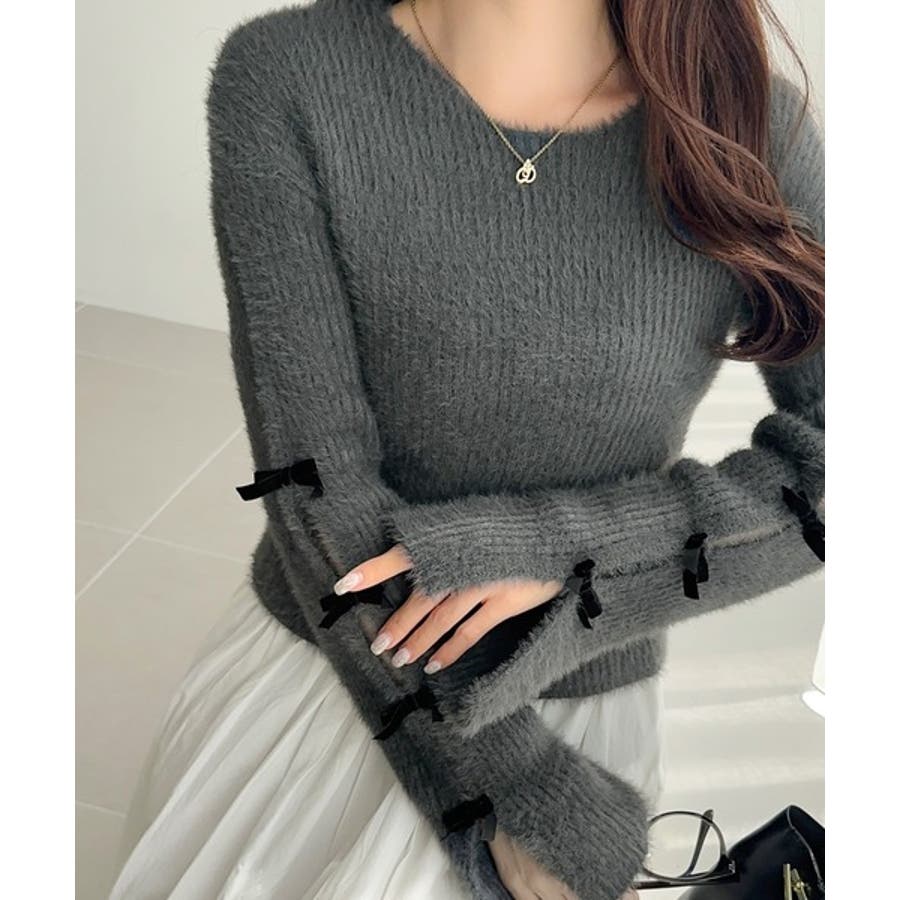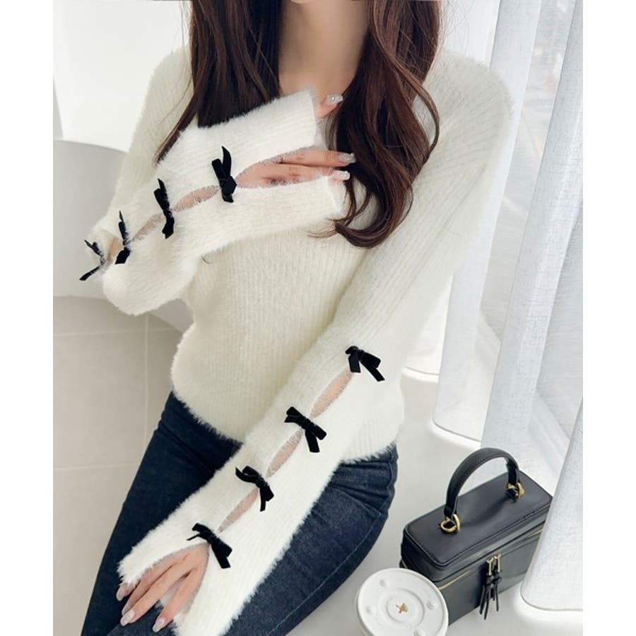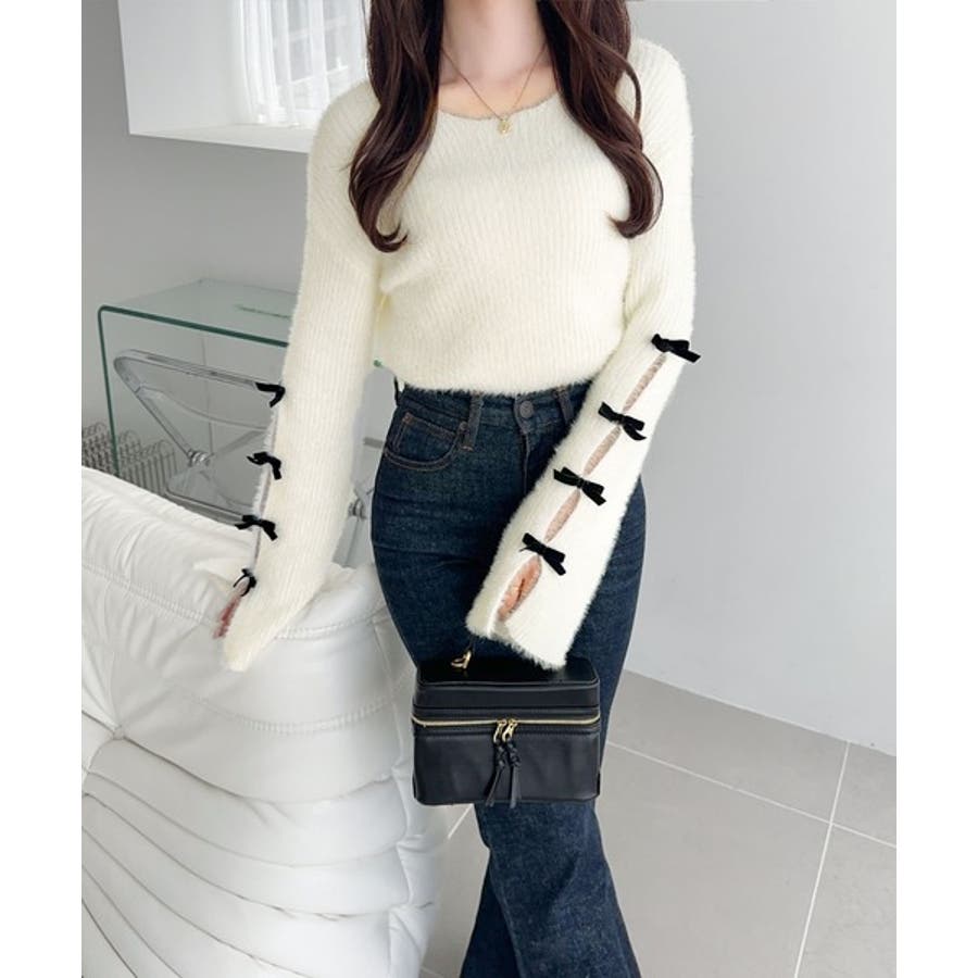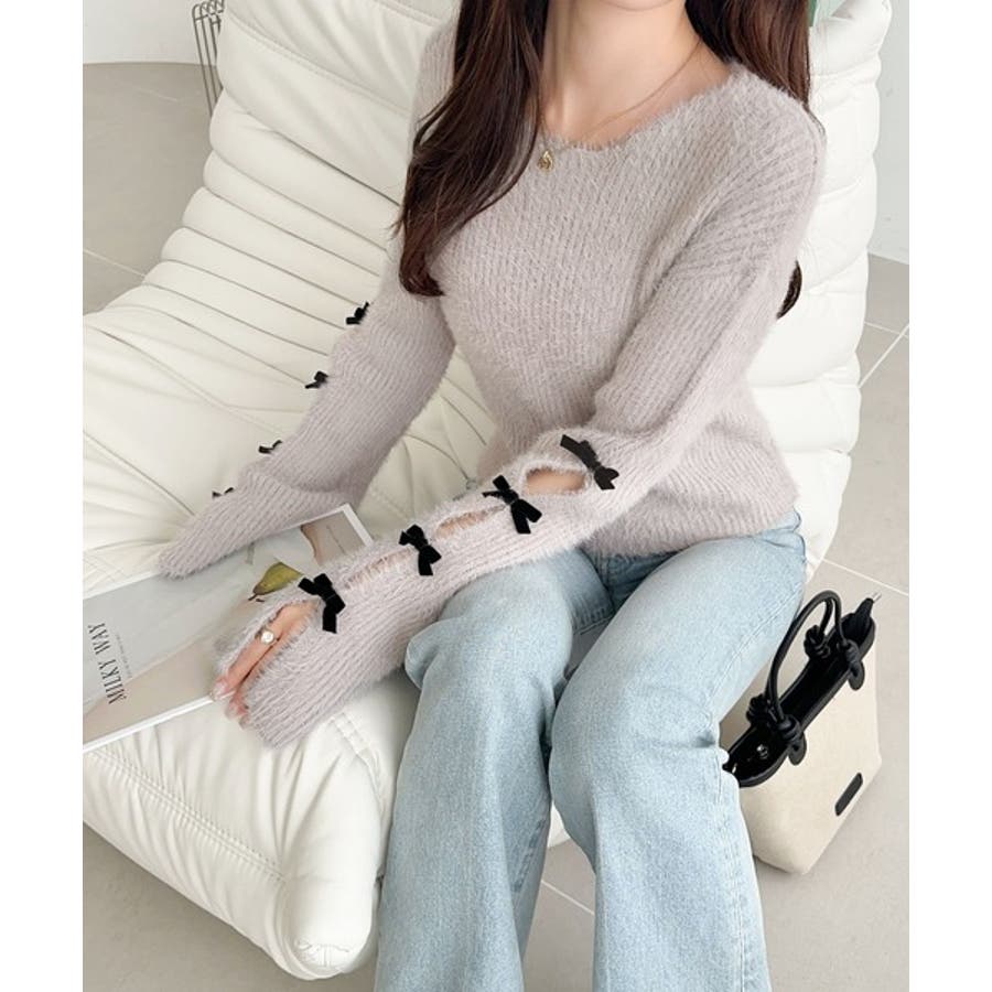 袖にあしらったベロアリボンがかわいい!肌触り抜群のフェザーシャギーリブニット。