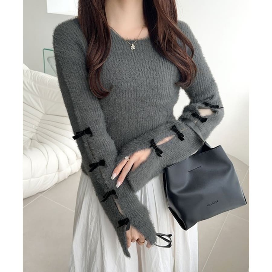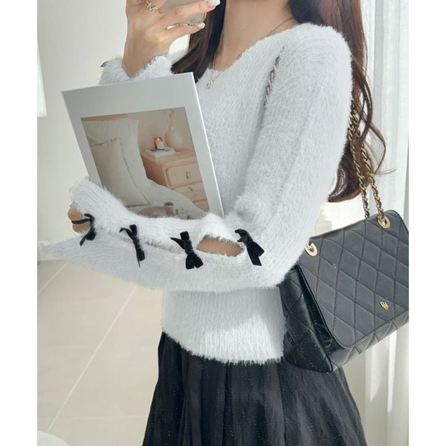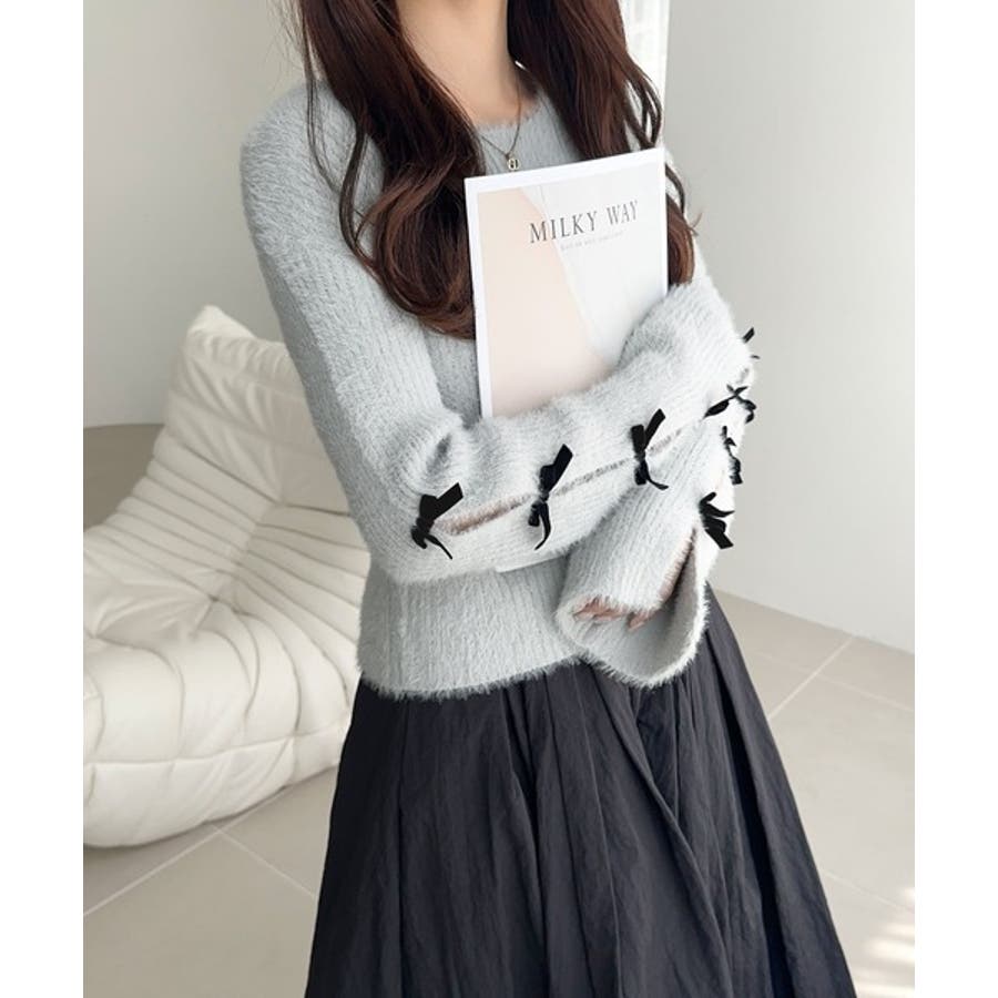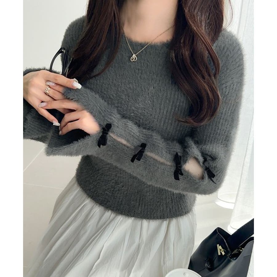 【mily bilet】袖リボン使いフェザーシャギーリブニット