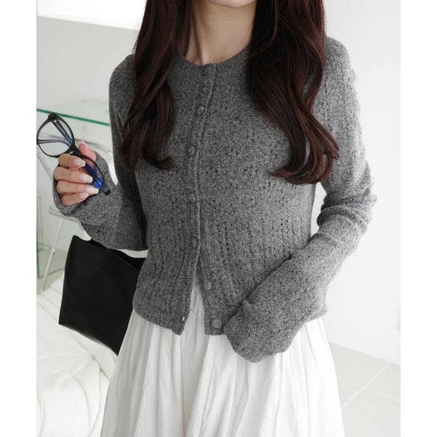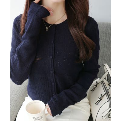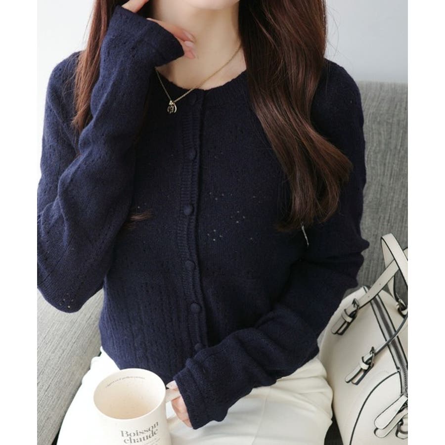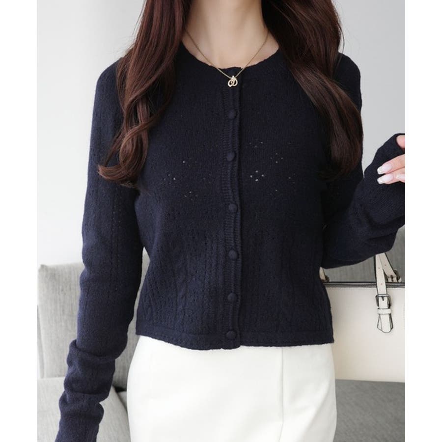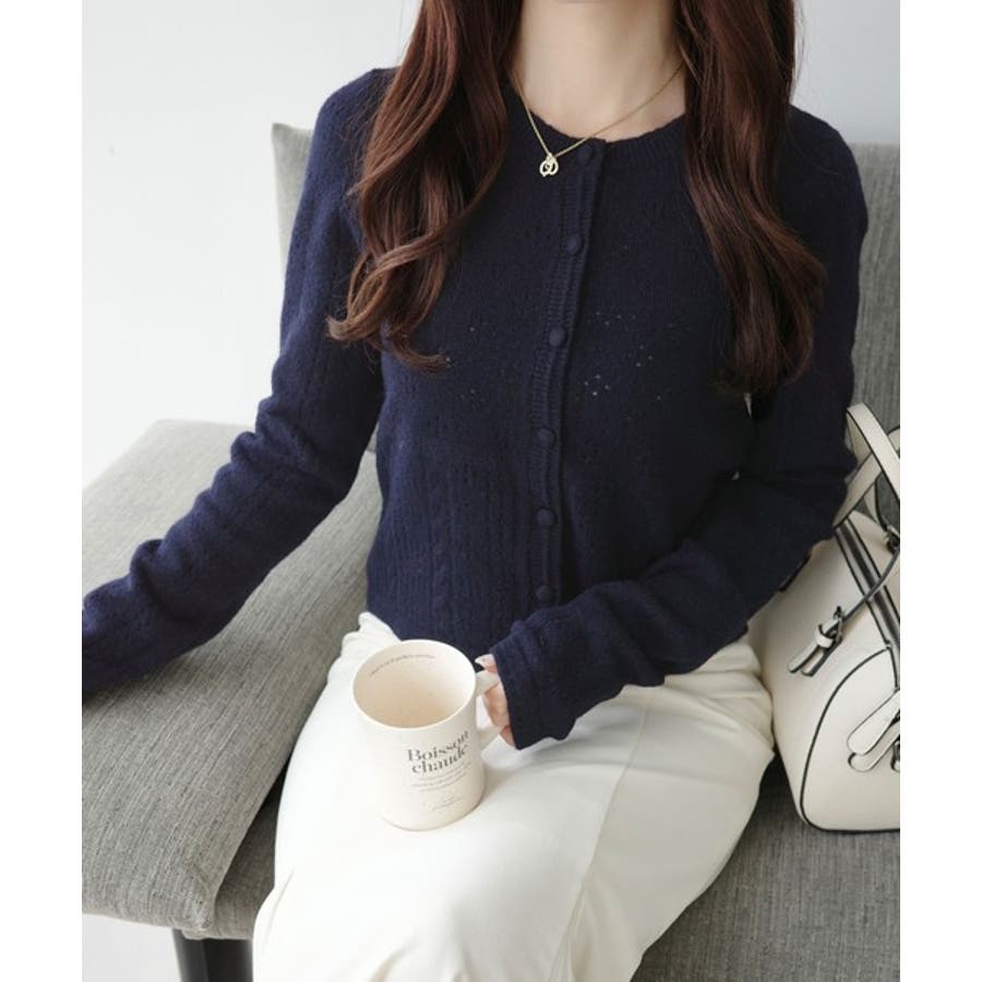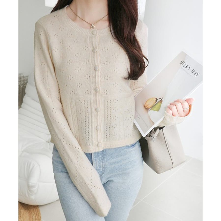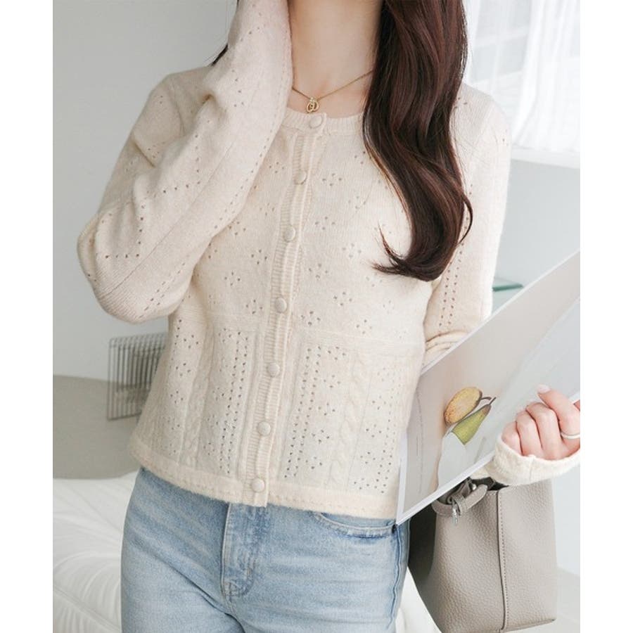 これからのシーズンに大活躍するアイレット柄のニットカーディガン。