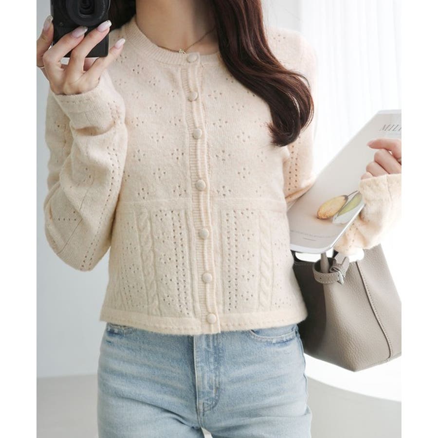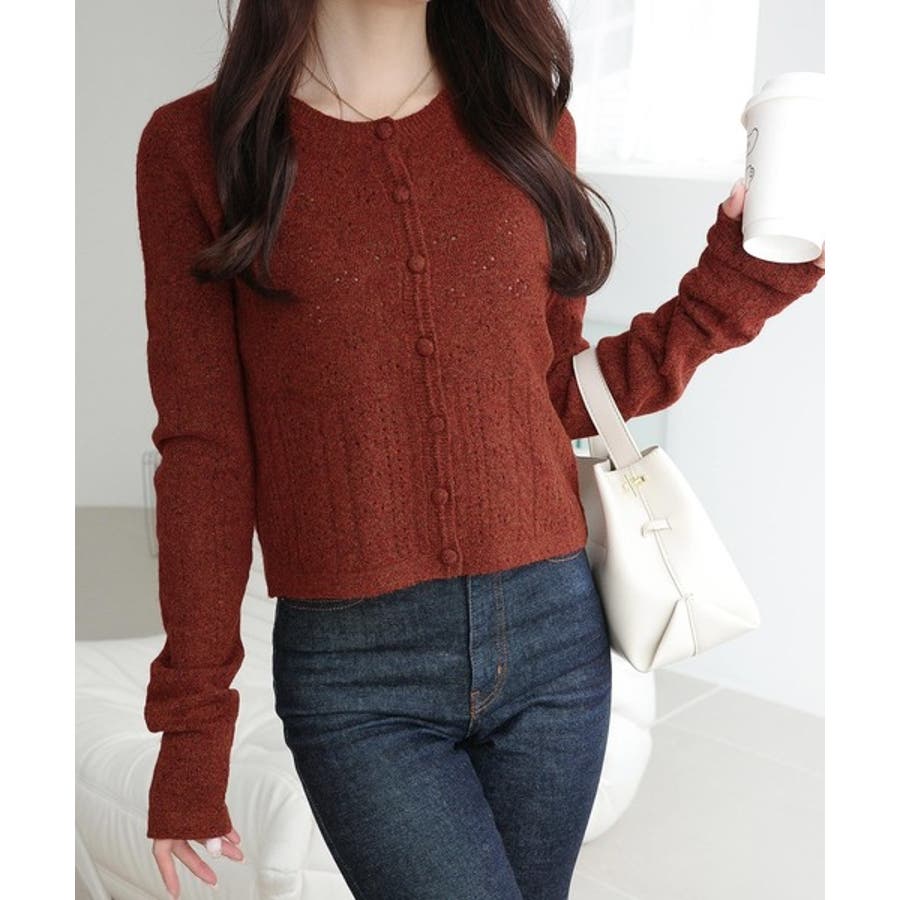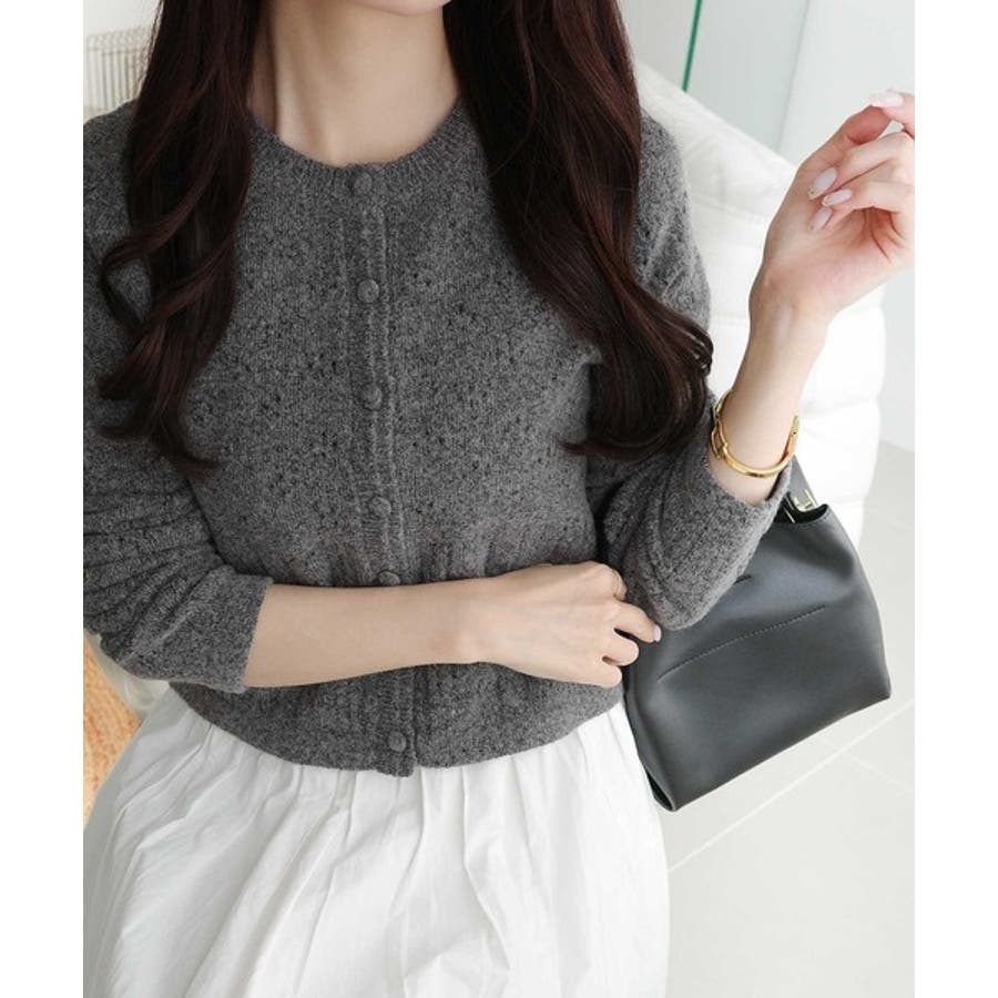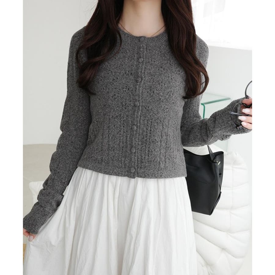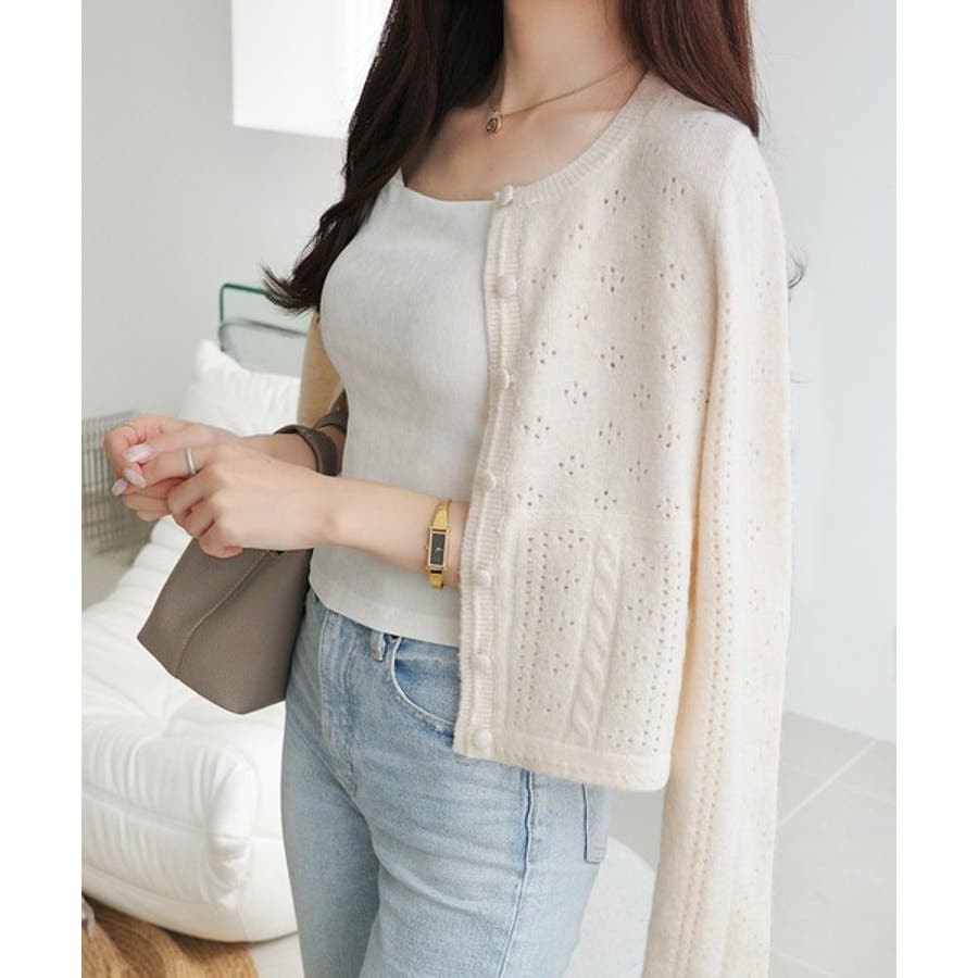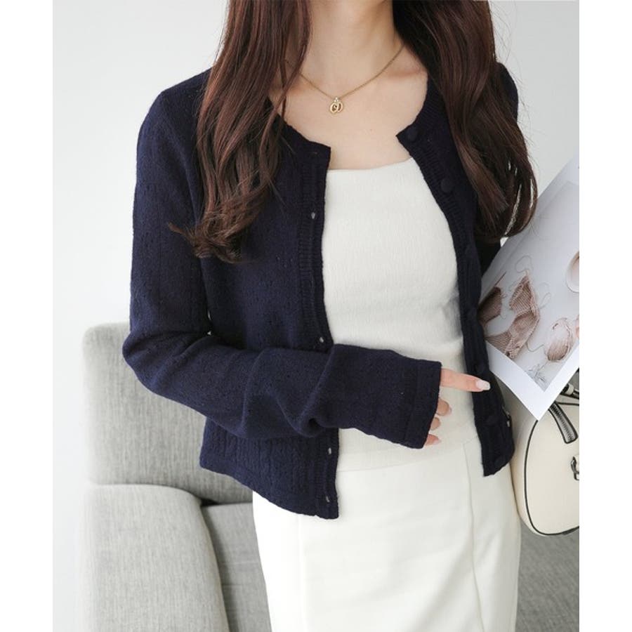 これからのシーズンに大活躍するアイレット柄のニットカーディガン。