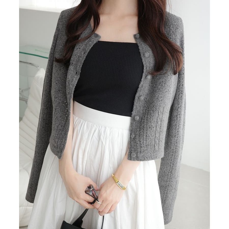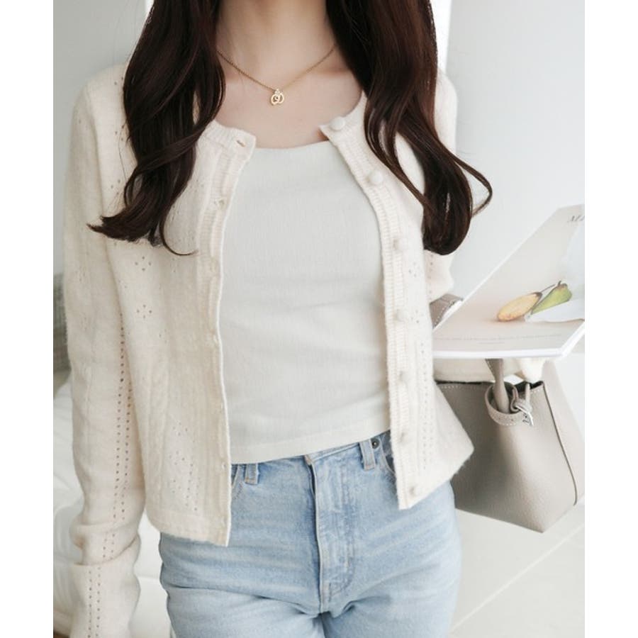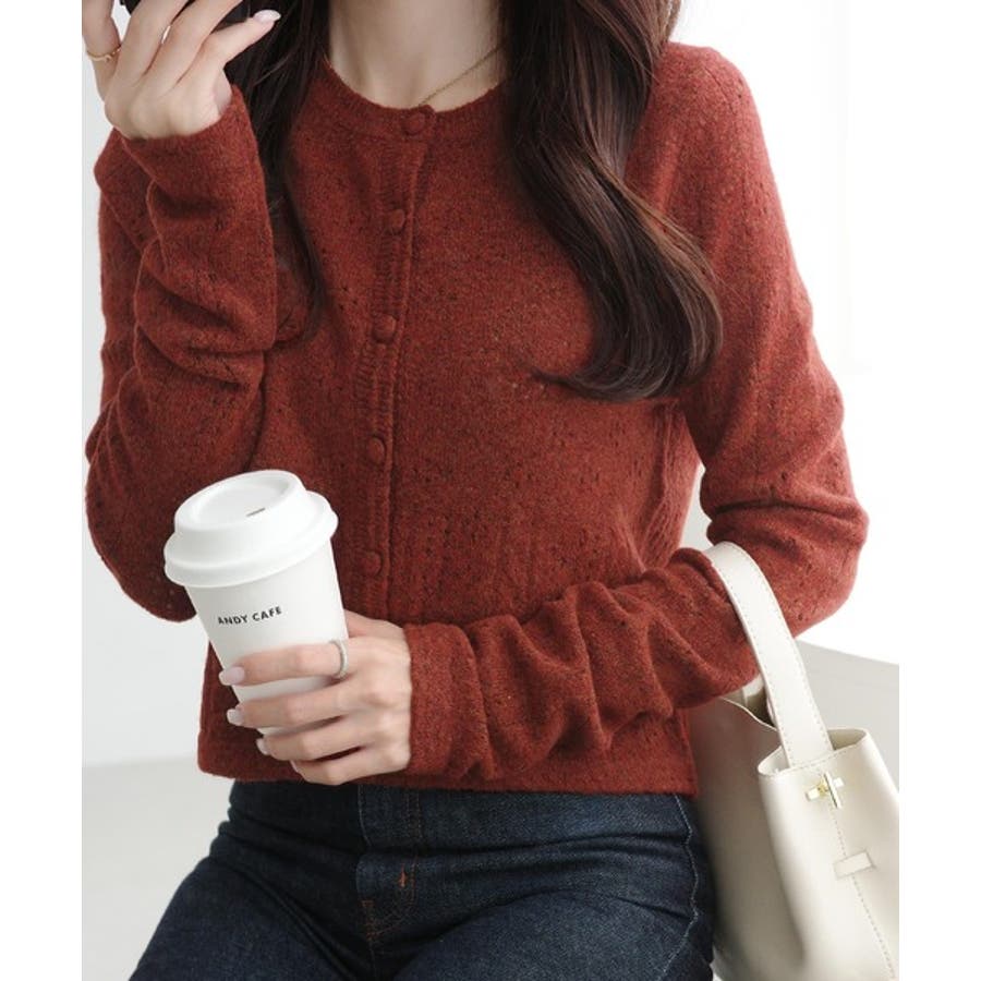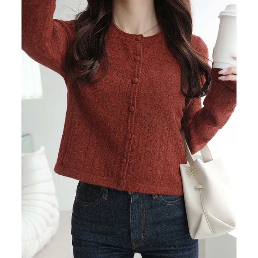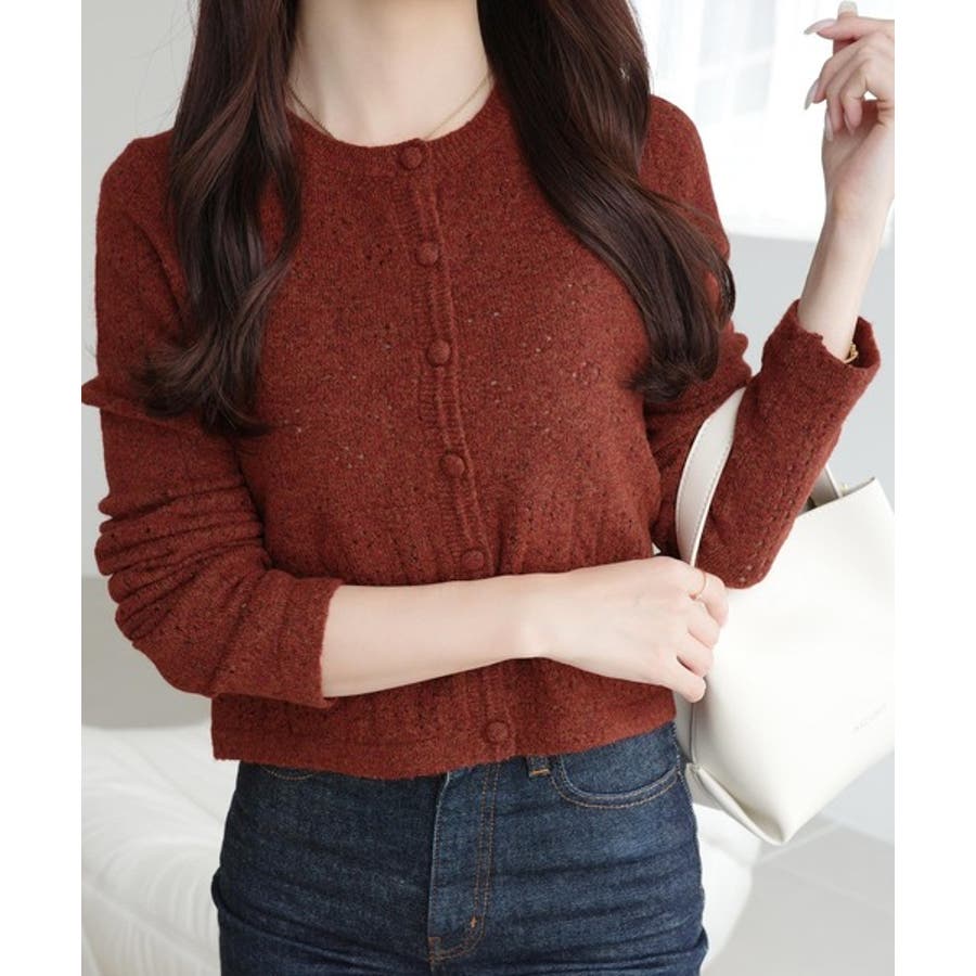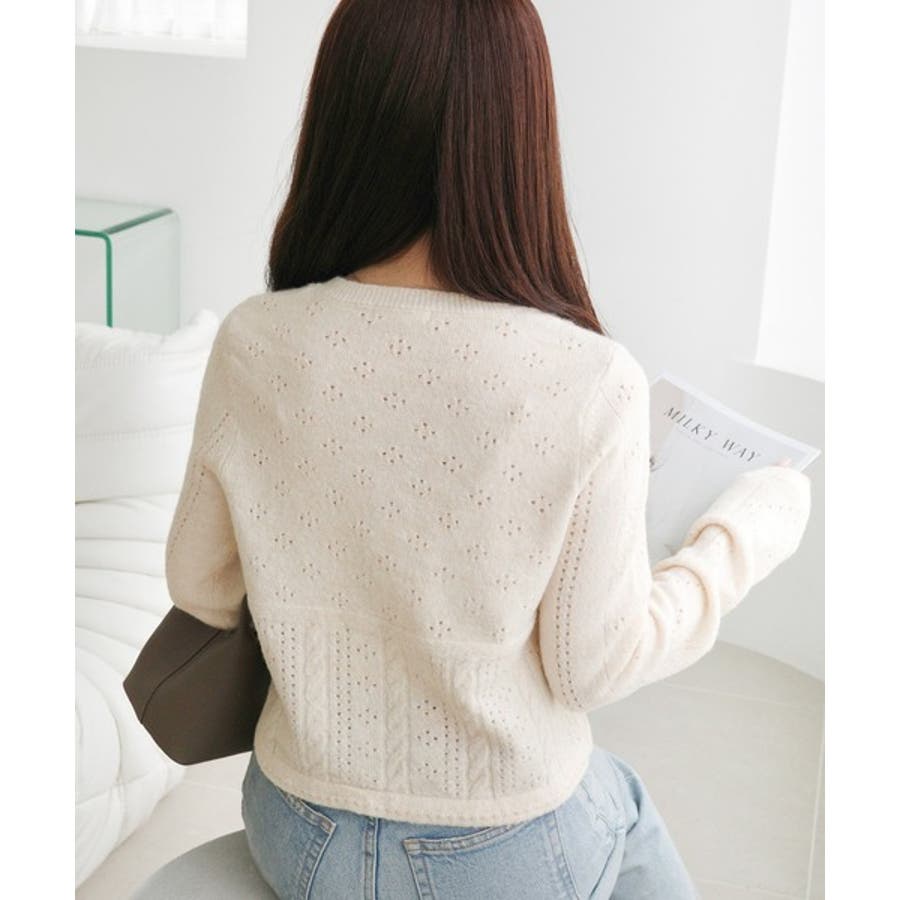 これからのシーズンに大活躍するアイレット柄のニットカーディガン。