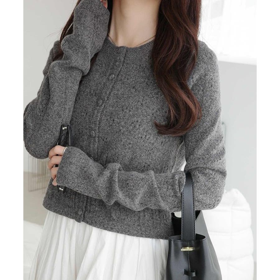 肌触りの良いふわもち素材を使用した、アイレット柄のくるみボタンニットカーディガン。