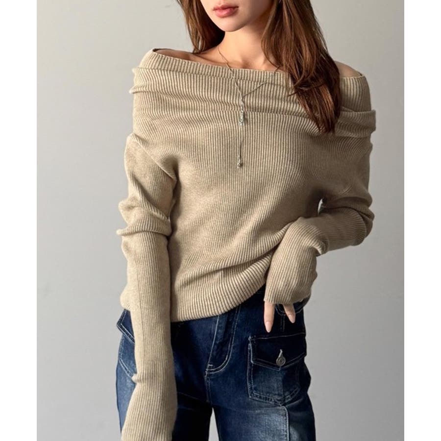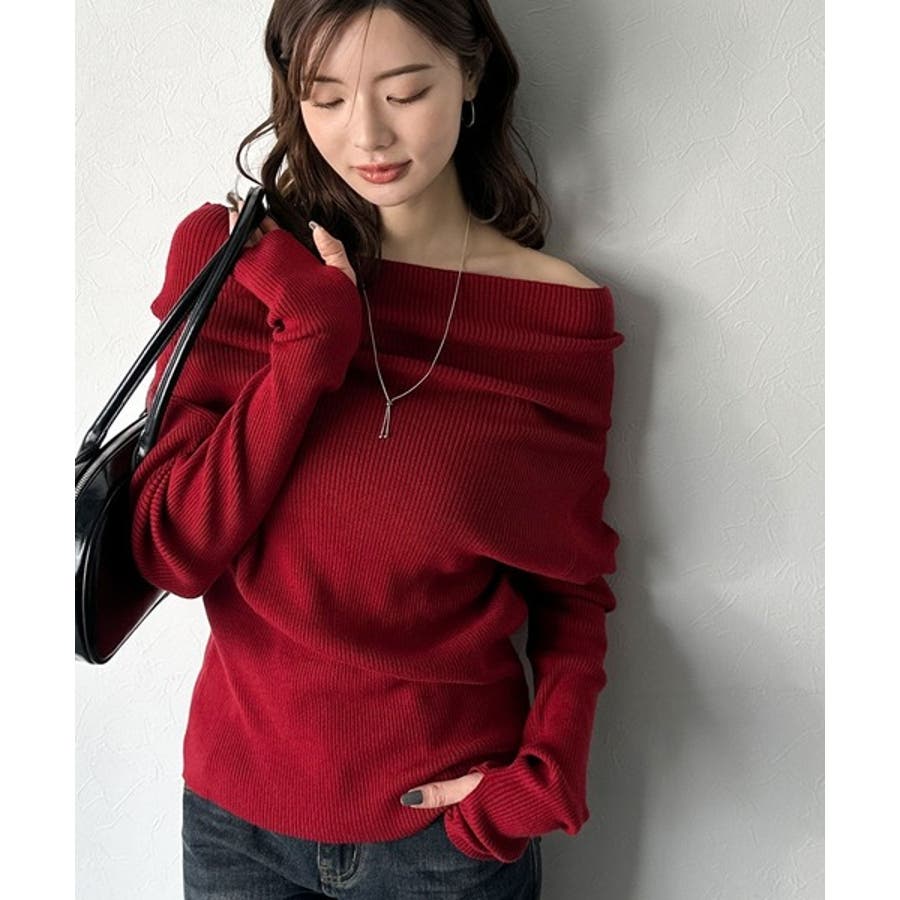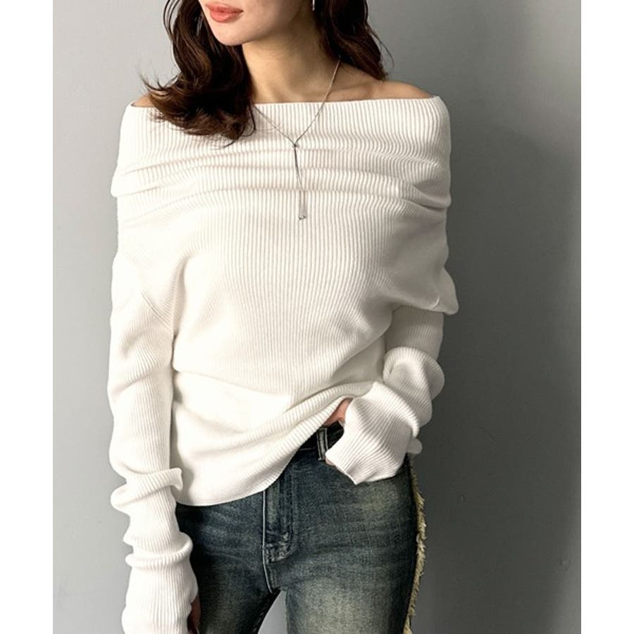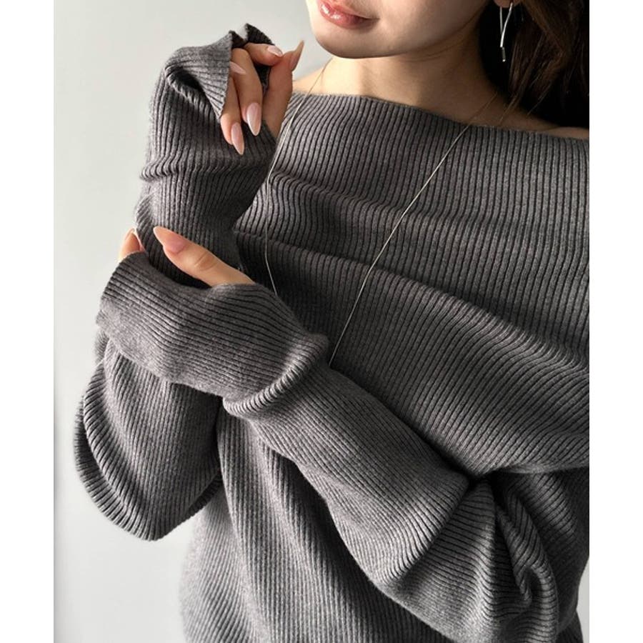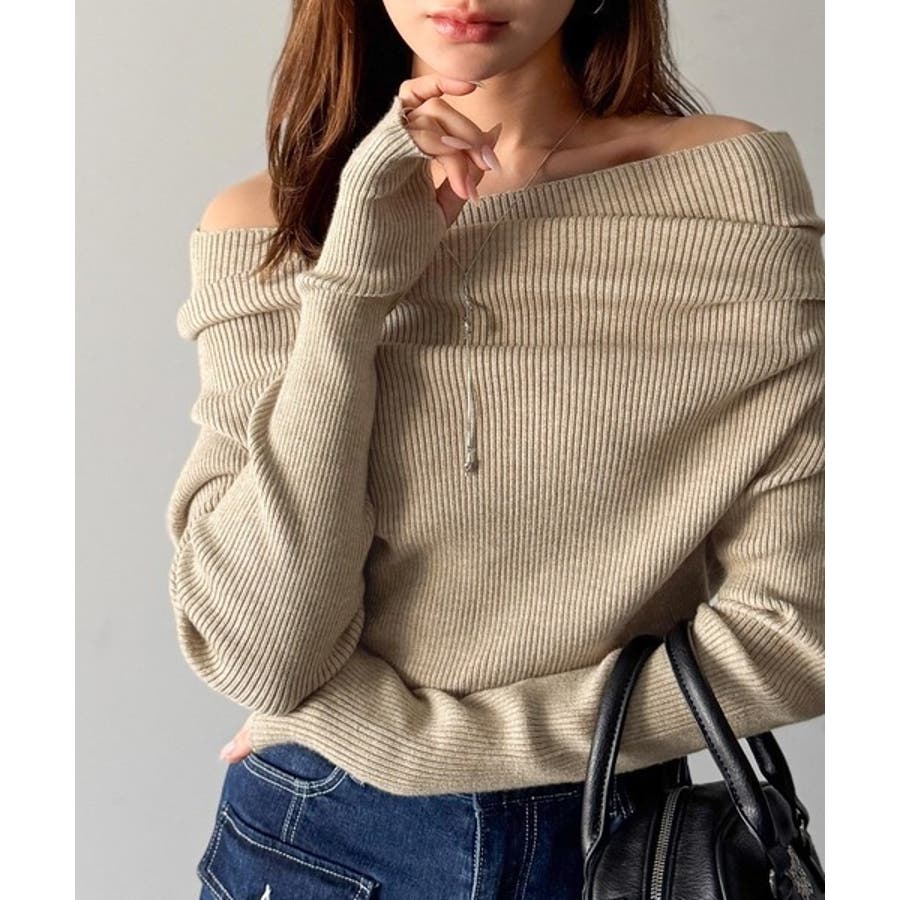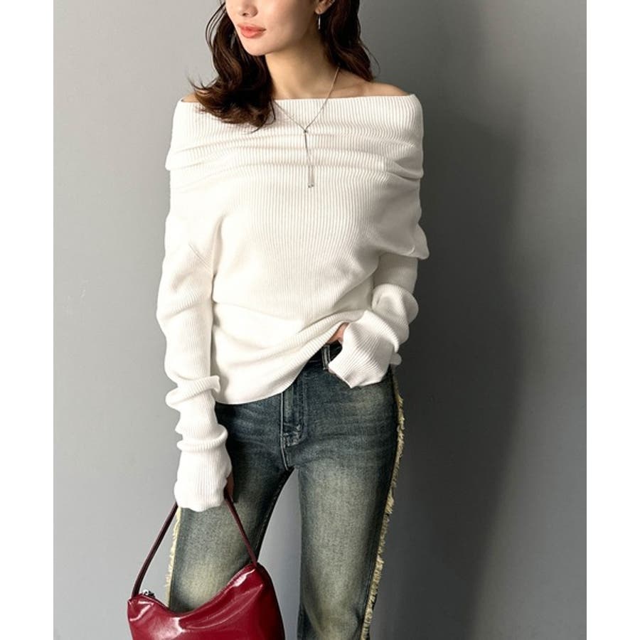 1枚で女性らしさを引き立てるこのオフショルニットは