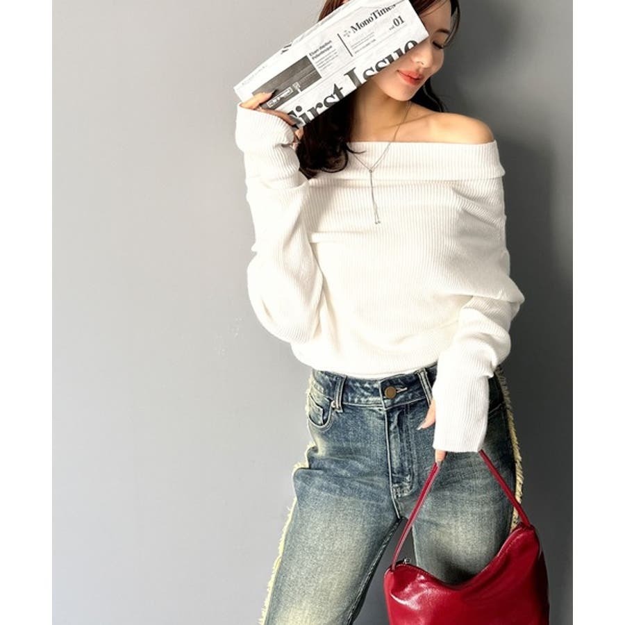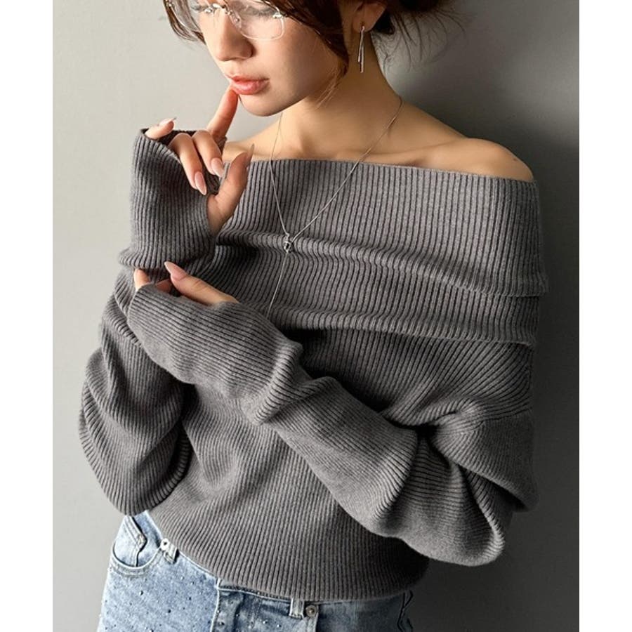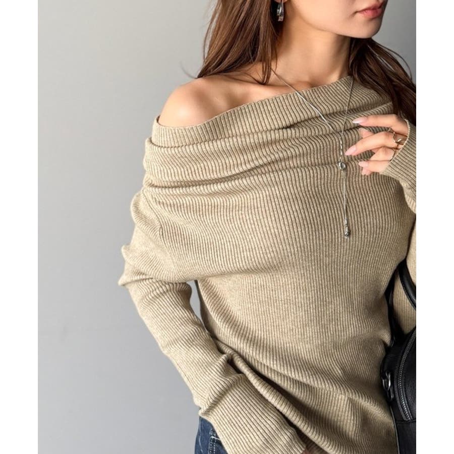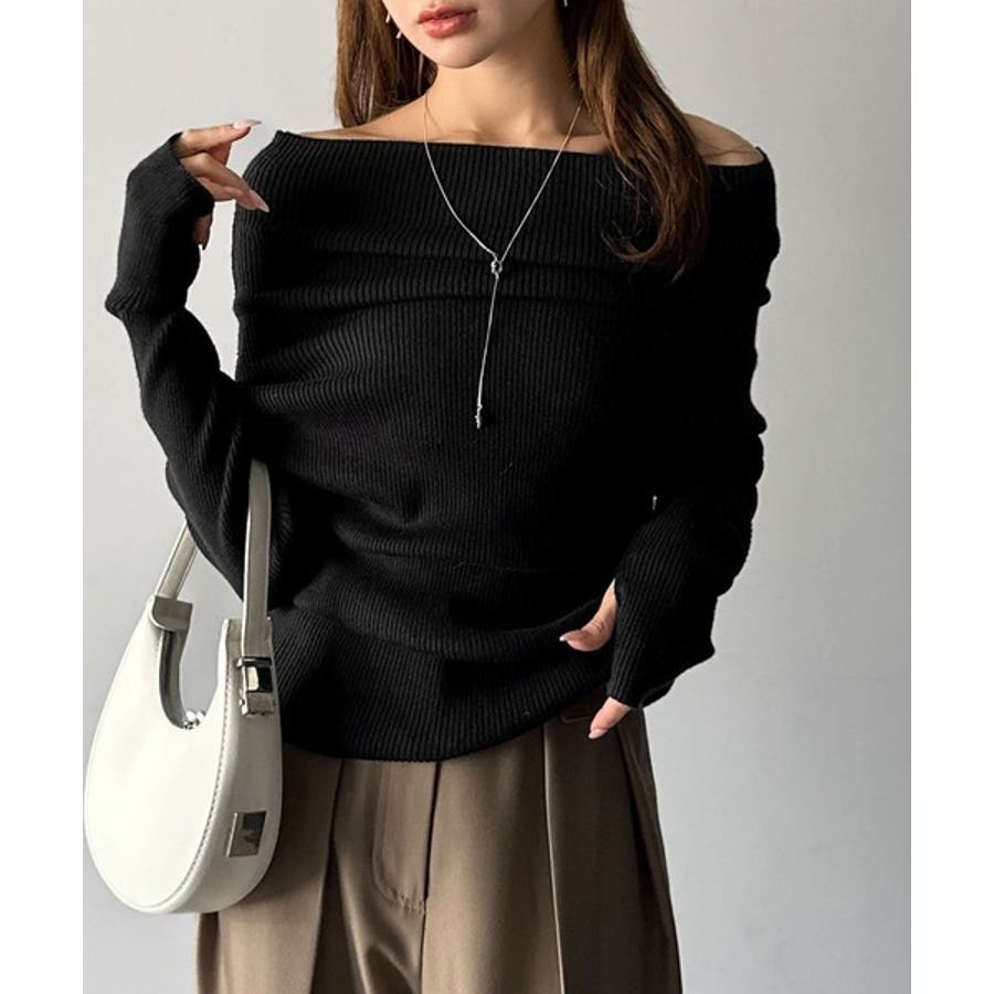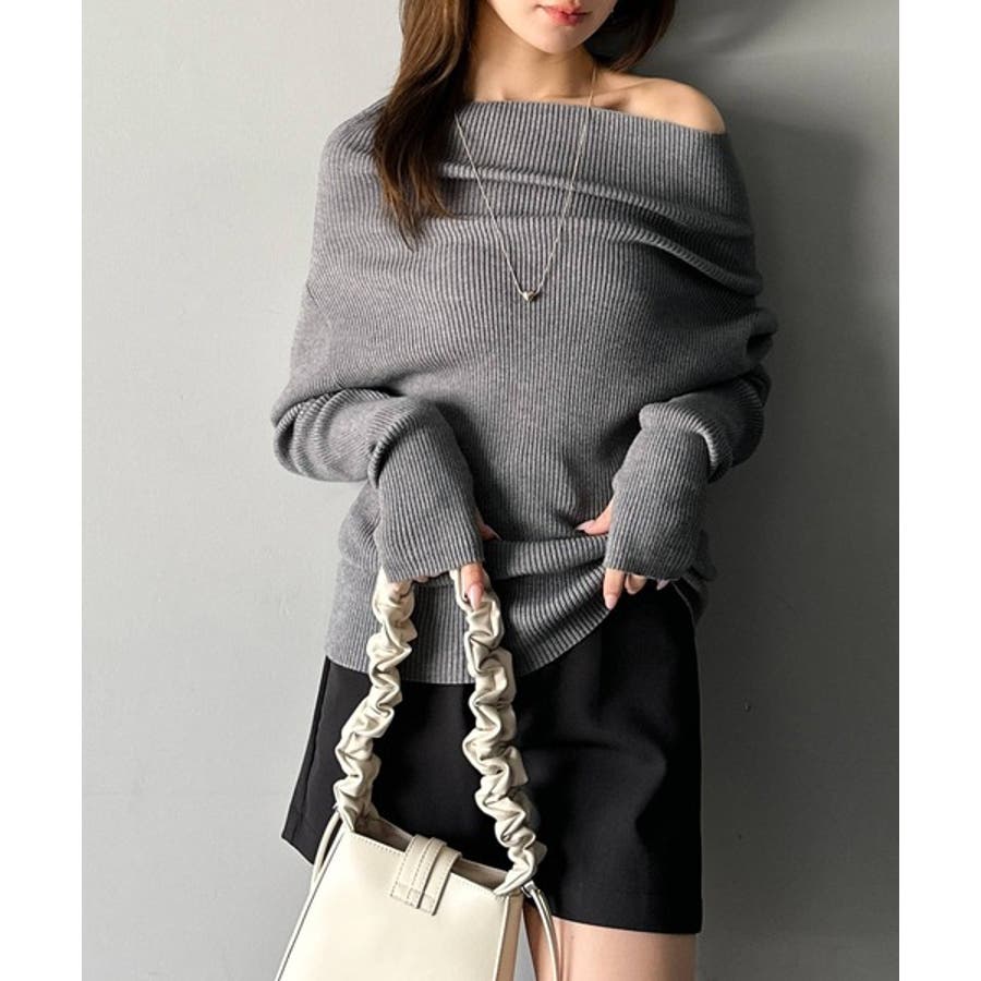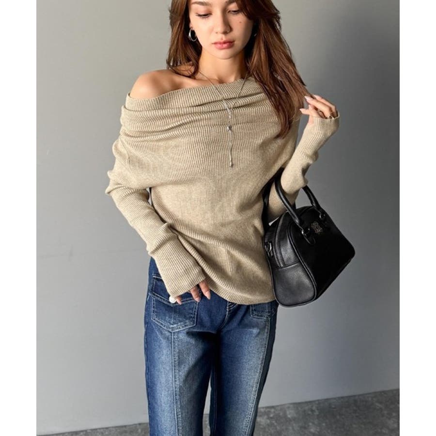1枚で女性らしさを引き立てるこのオフショルニットは