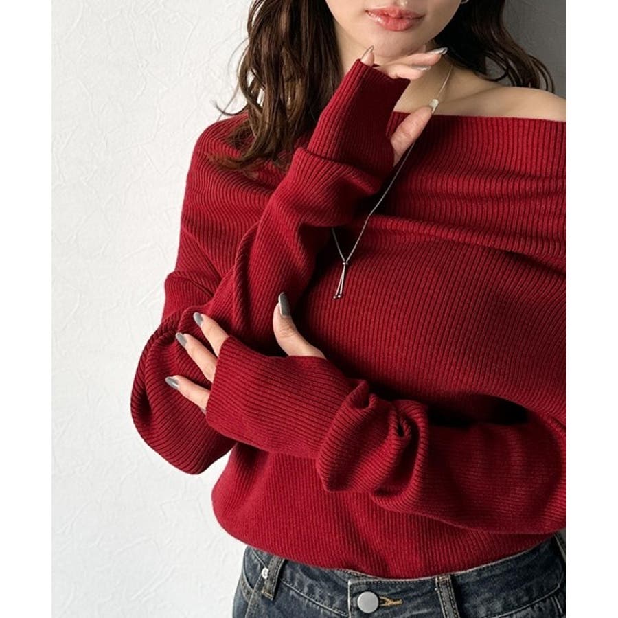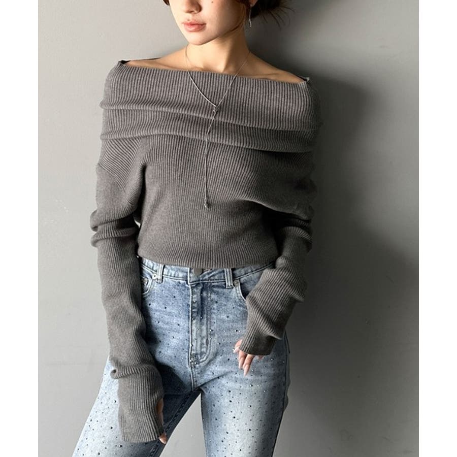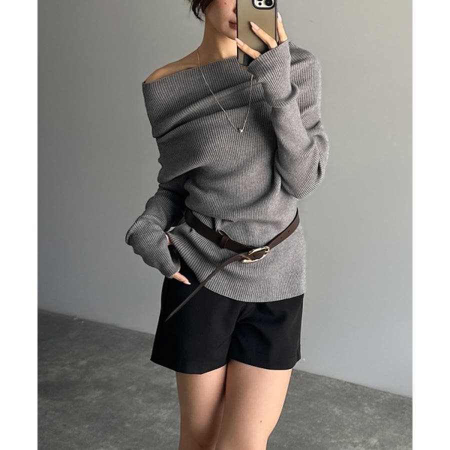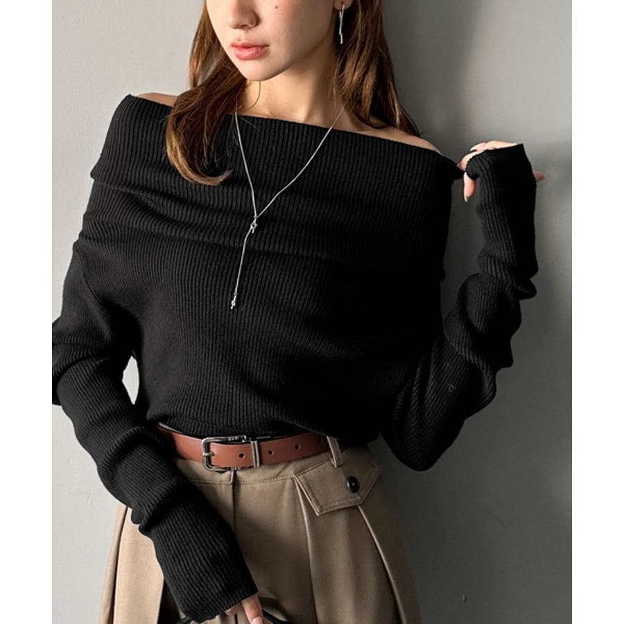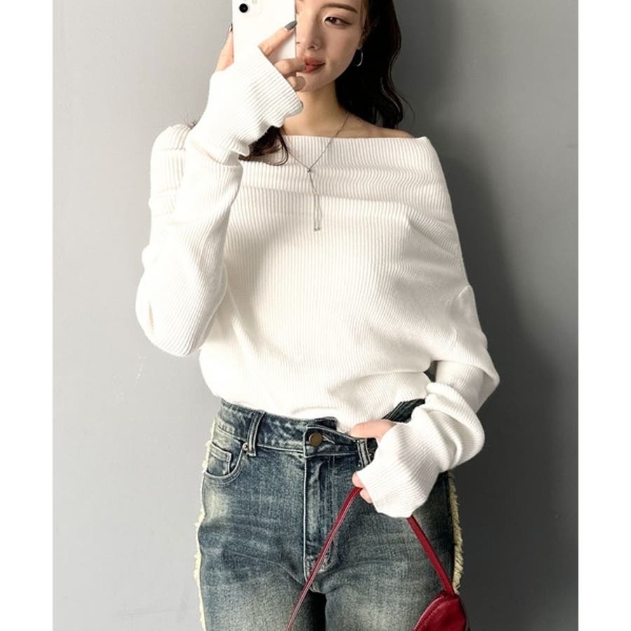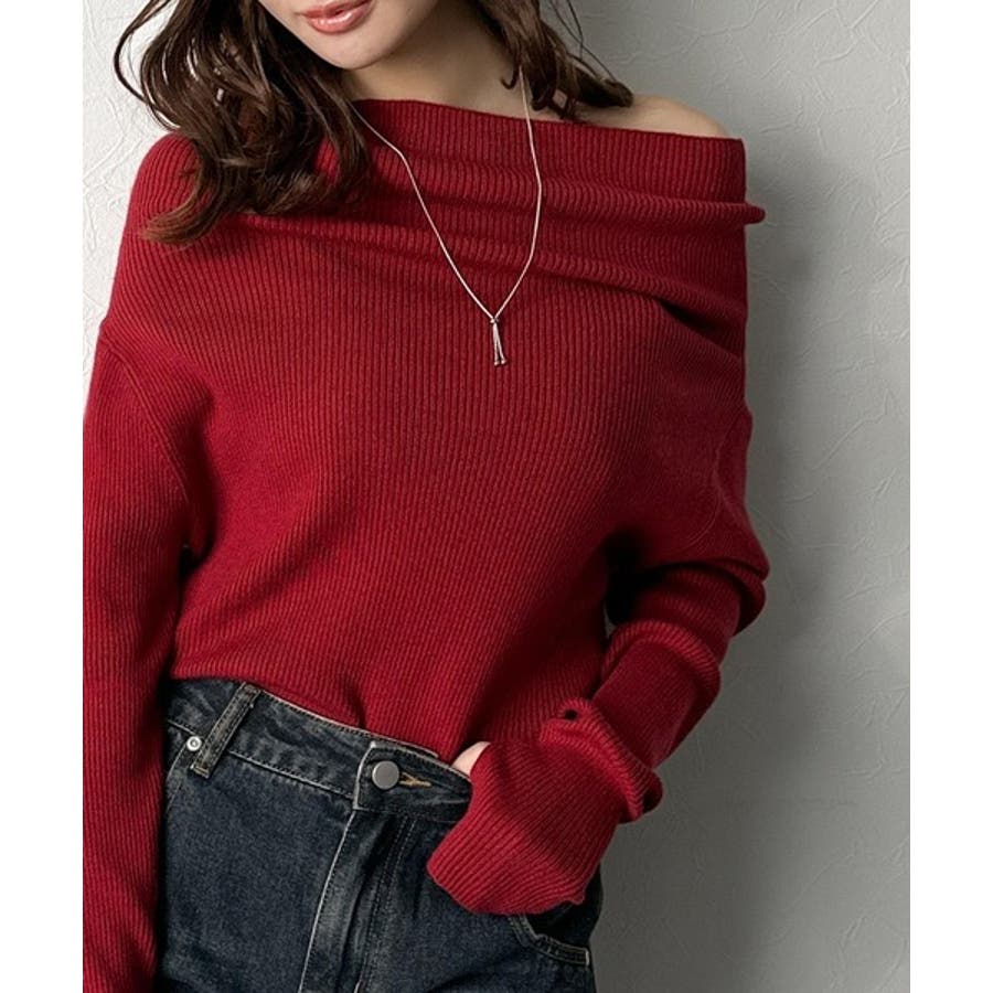 1枚で女性らしさを引き立てるこのオフショルニットは