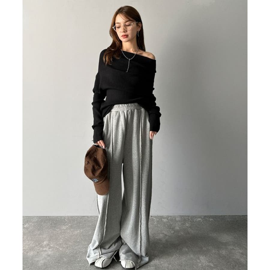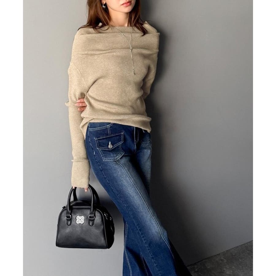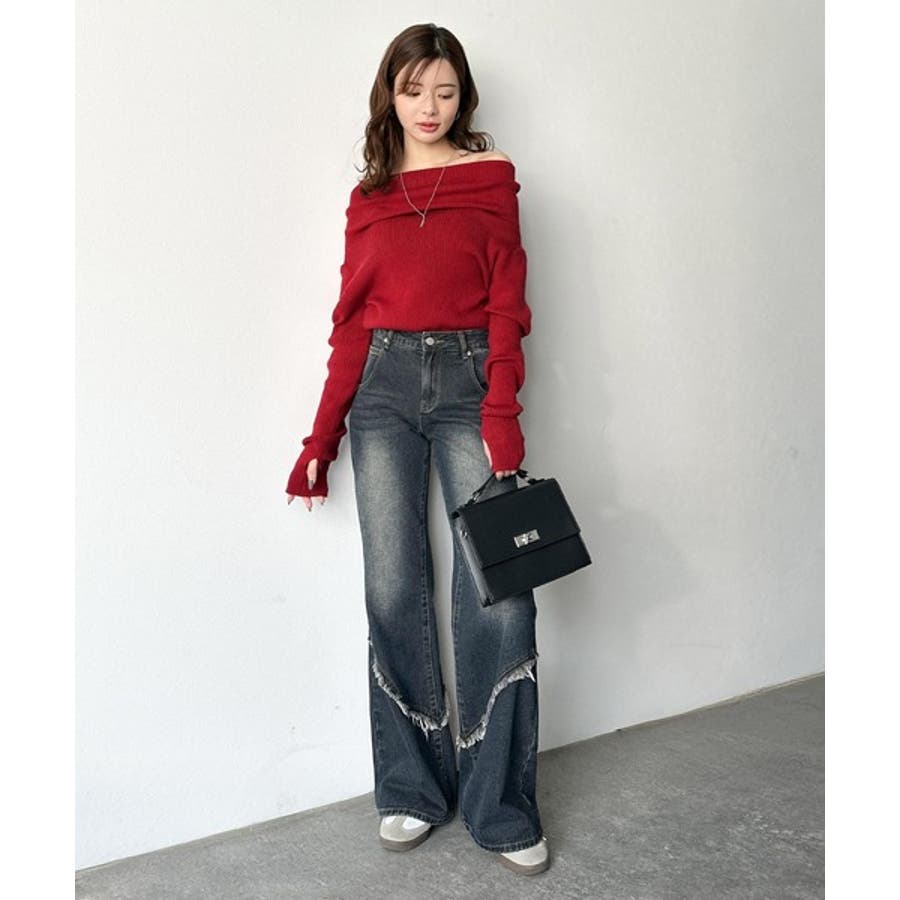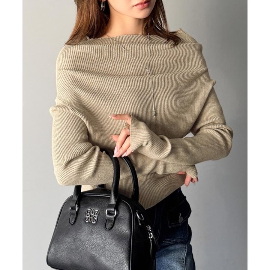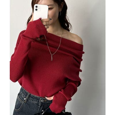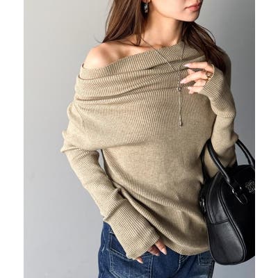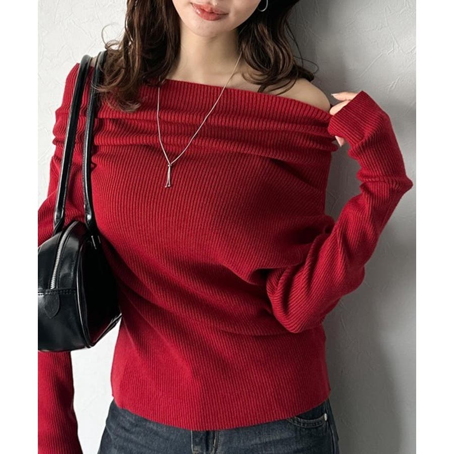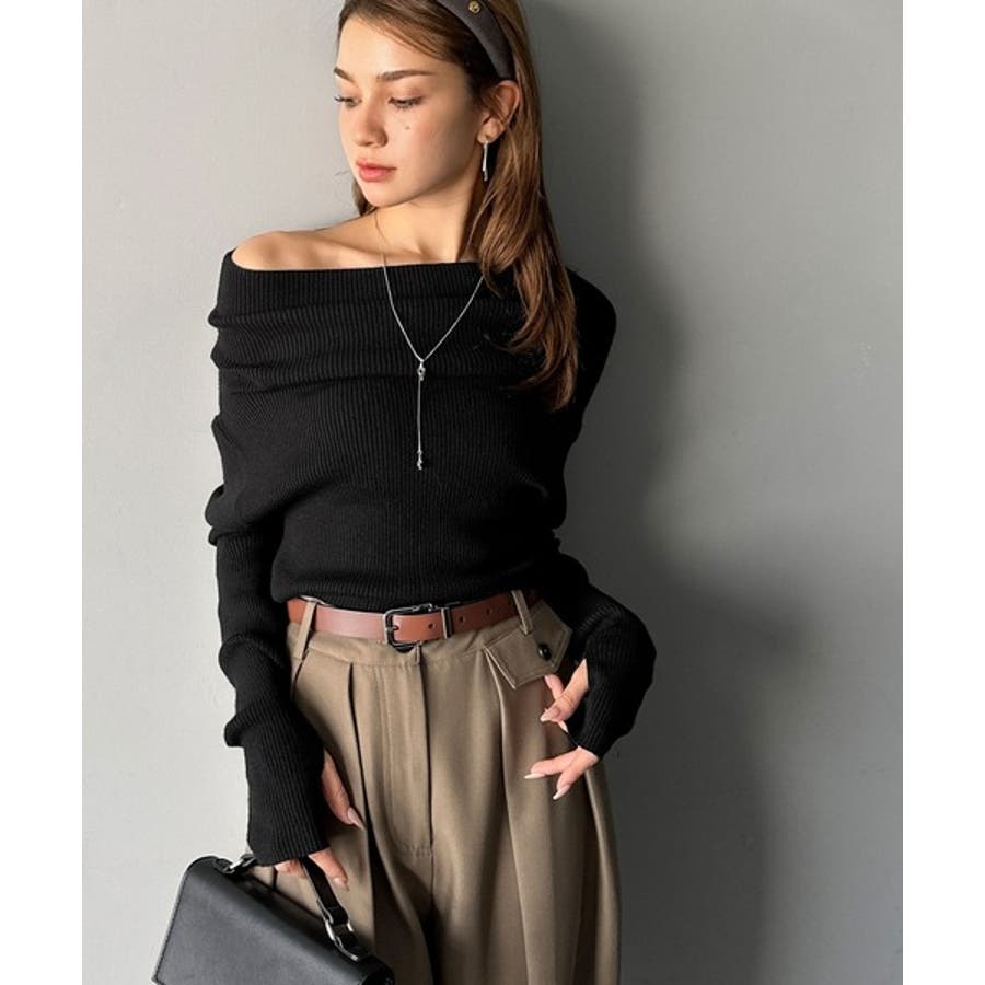 1枚で女性らしさを引き立てるこのオフショルニットは