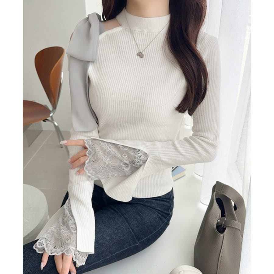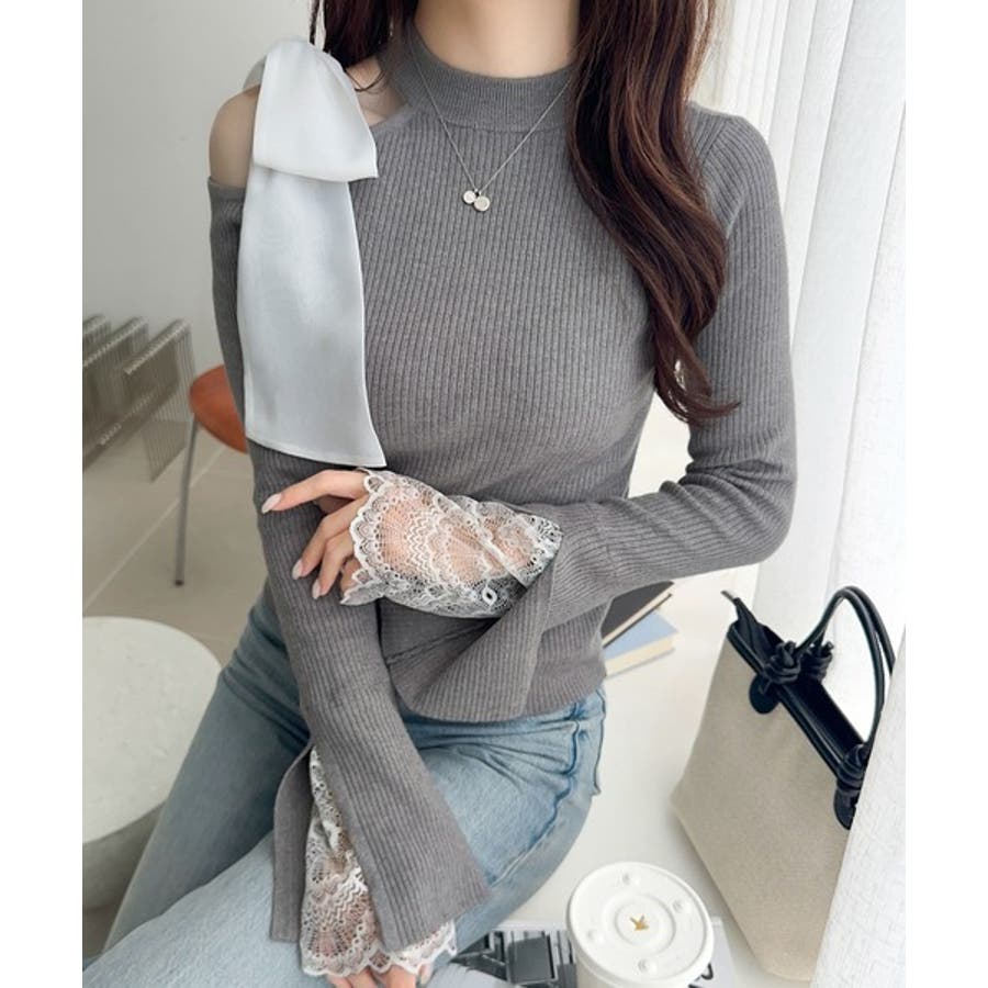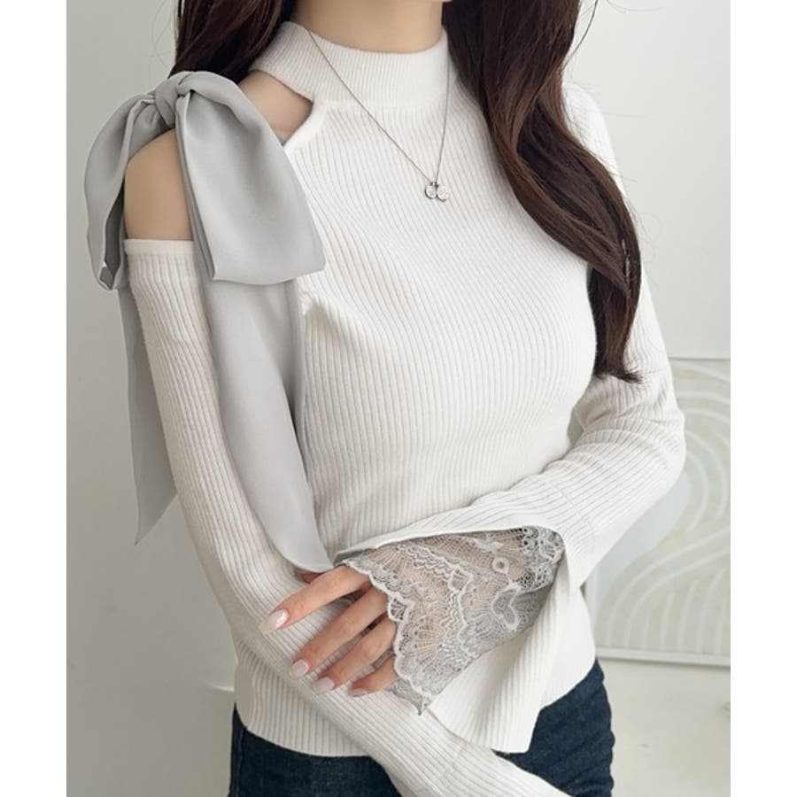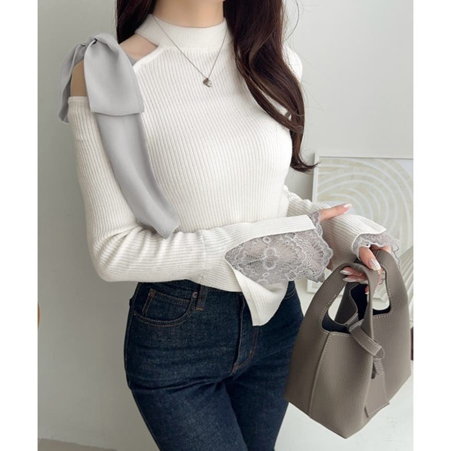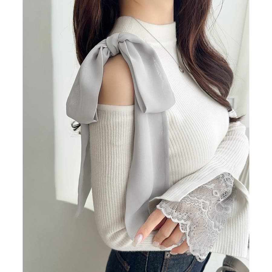 【mily bilet】大人フェミニンの主役トップス。肩シフォンリボン袖レース使…